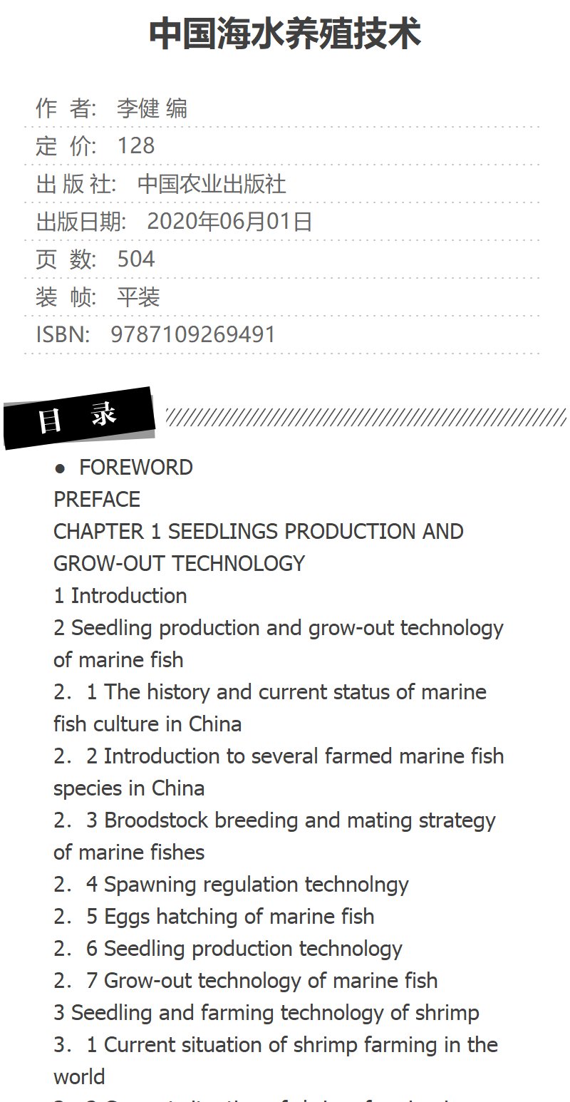 中国海水养殖技术 Marine cultivation technology in China 李 健 著 养殖 专业科技 中国农业出版社 9787109269491