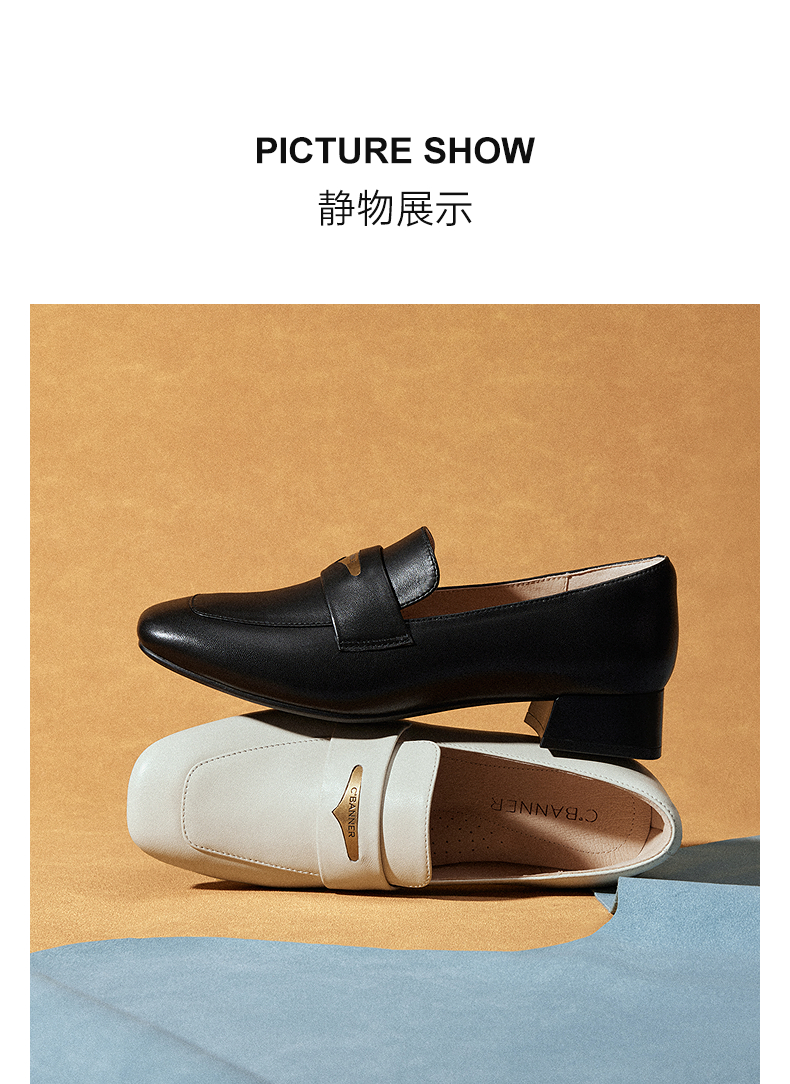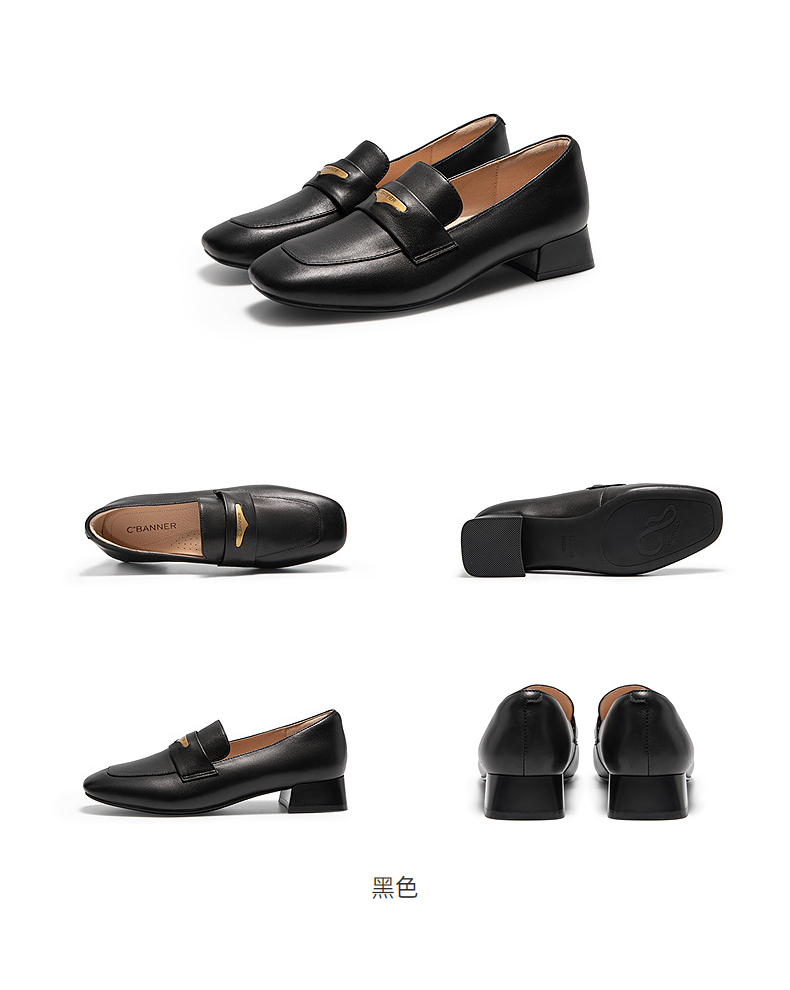 千百度经典羊皮乐福鞋女中跟通勤正装方头深口单鞋A25466106