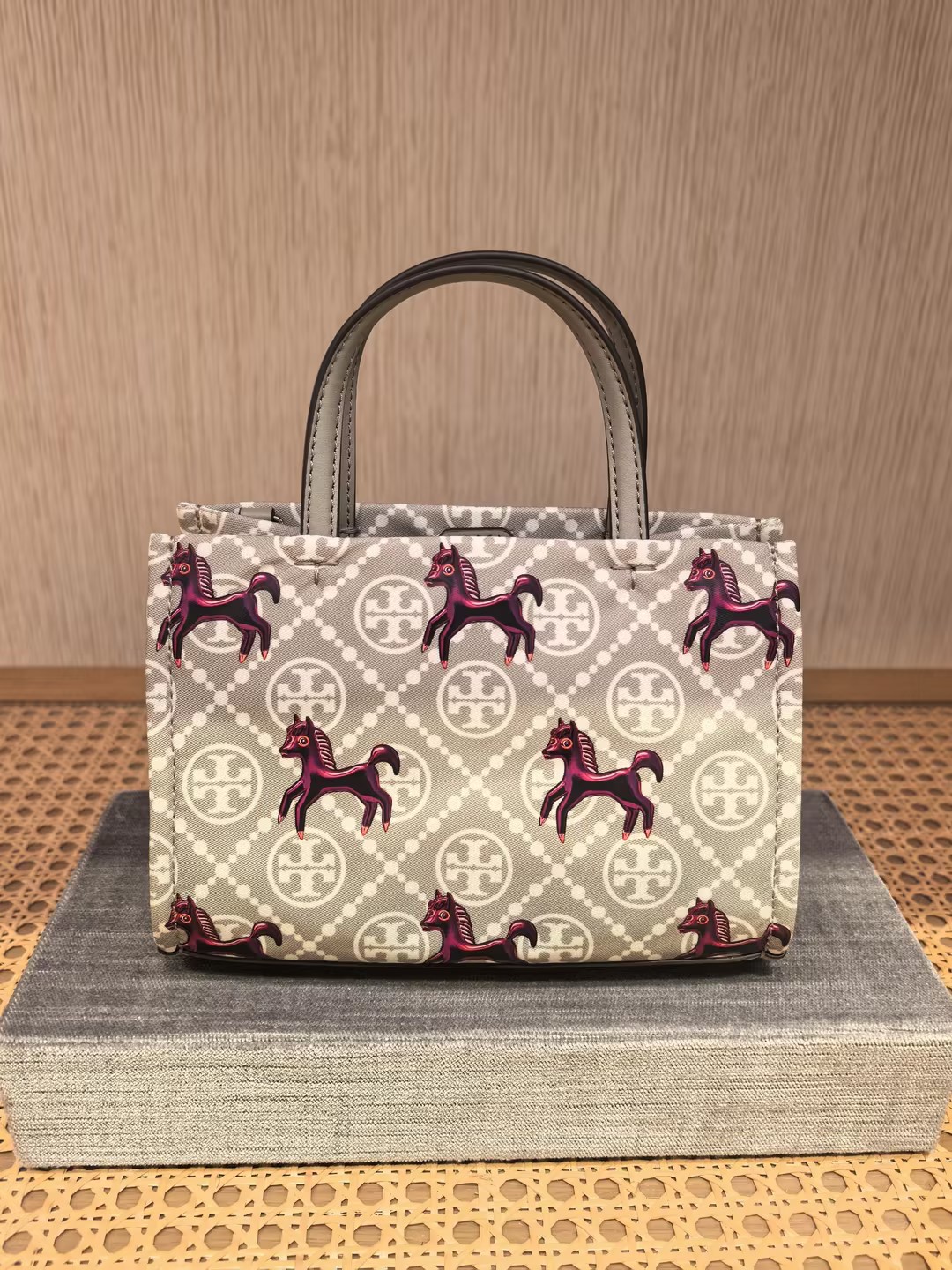 以品牌经典的双T老花提花面料为基底,印饰酒红色小马图案,包身正面缀有浅灰色皮质双T浮雕圆标,搭配同色系皮质短提手,整体设计融合了老花元素与童趣印花,风格俏皮又不失轻奢质感。