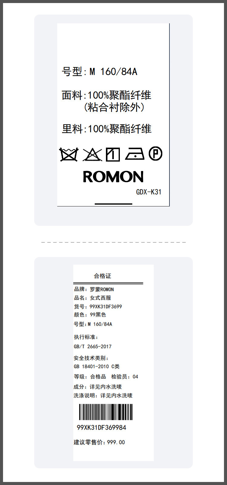 面料:100%聚酯纤维 (粘合衬除外) 里料:100%聚酯纤维