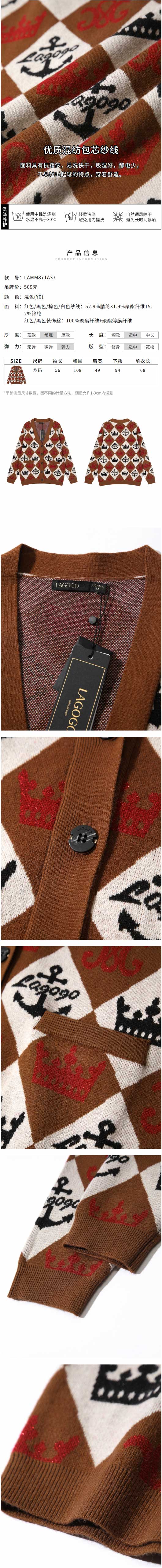 Lagogo拉谷谷2022春新款V领针织衫女复古宽松开衫毛衣外套慵懒风LAMM871A37