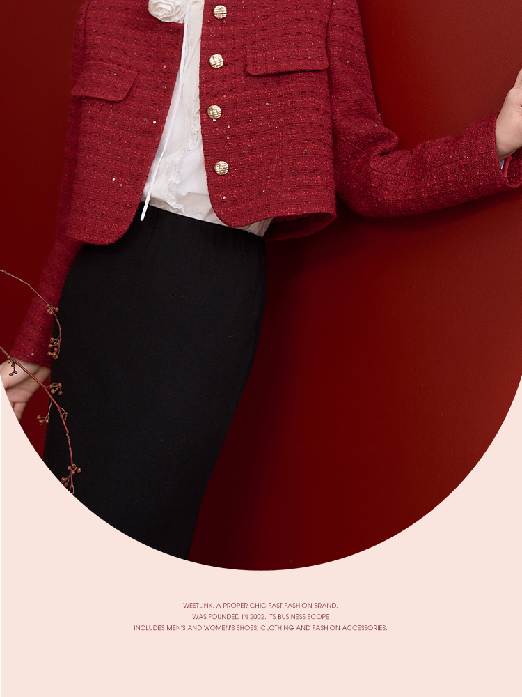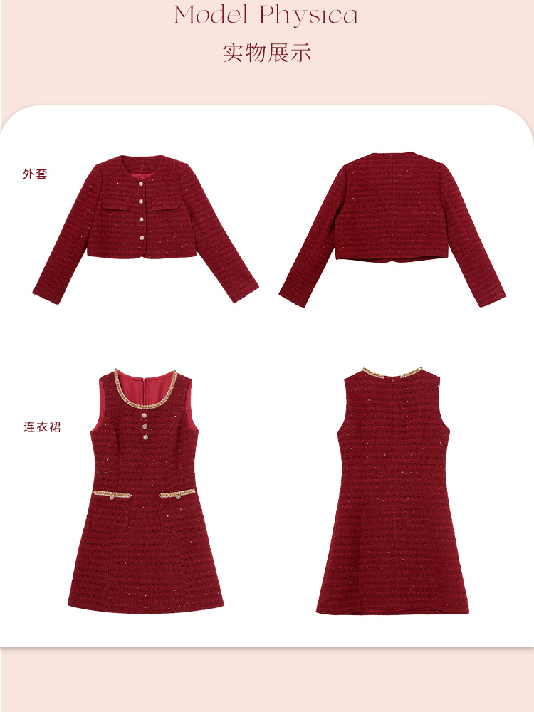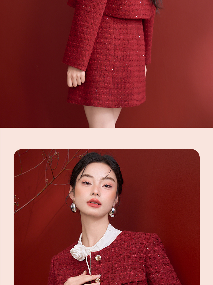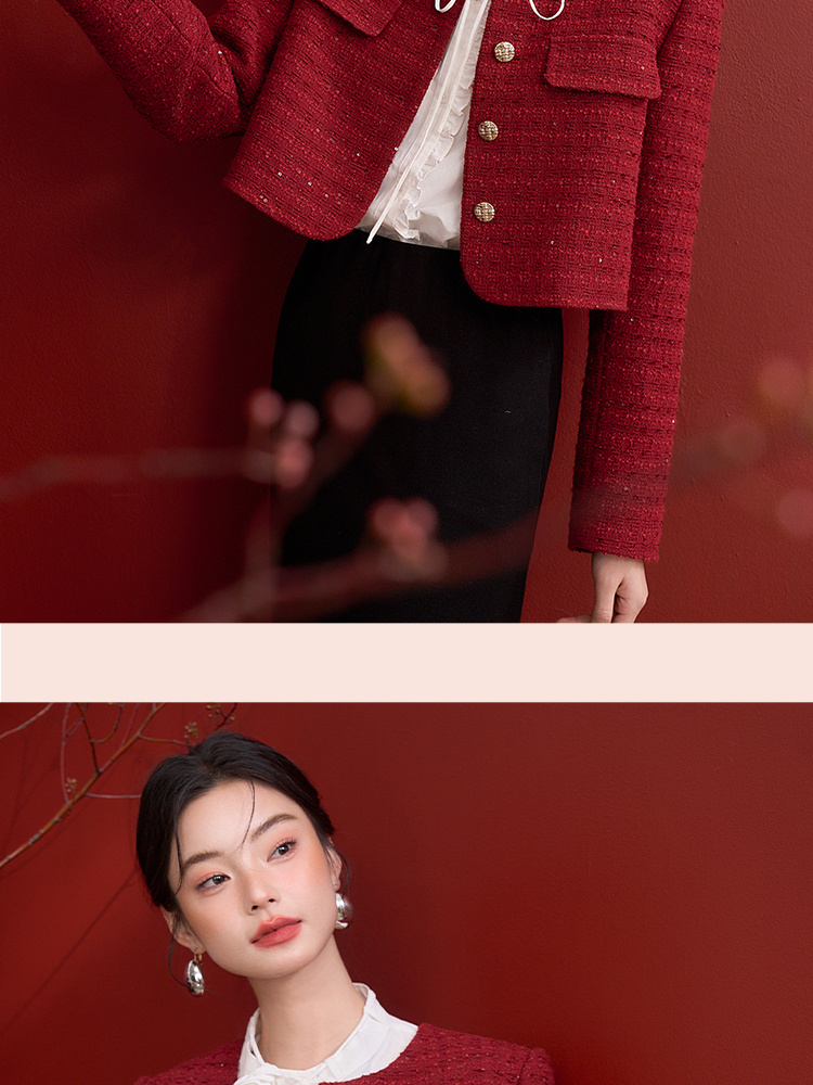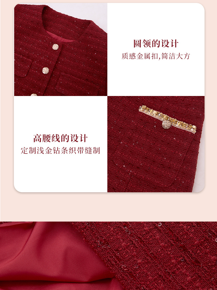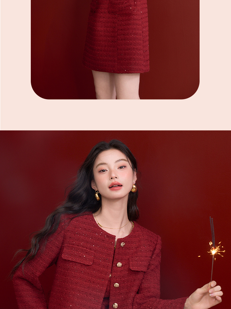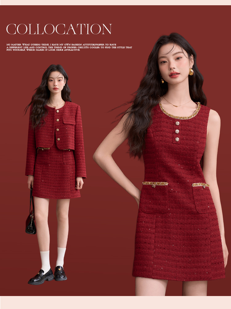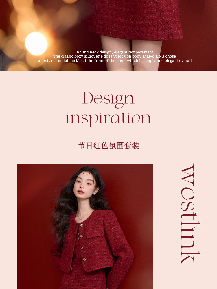 西遇红色小香风外套套装女早春新款新年穿搭背心裙两件套V0150063/V0150064