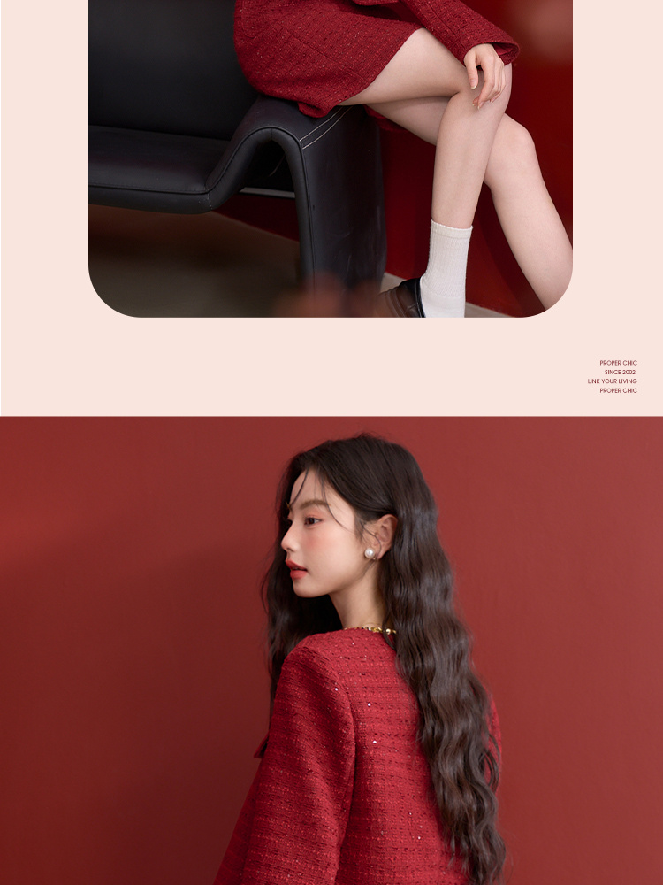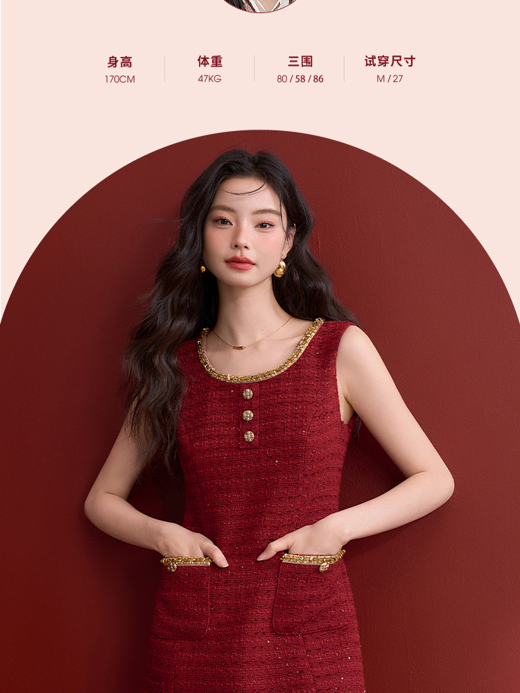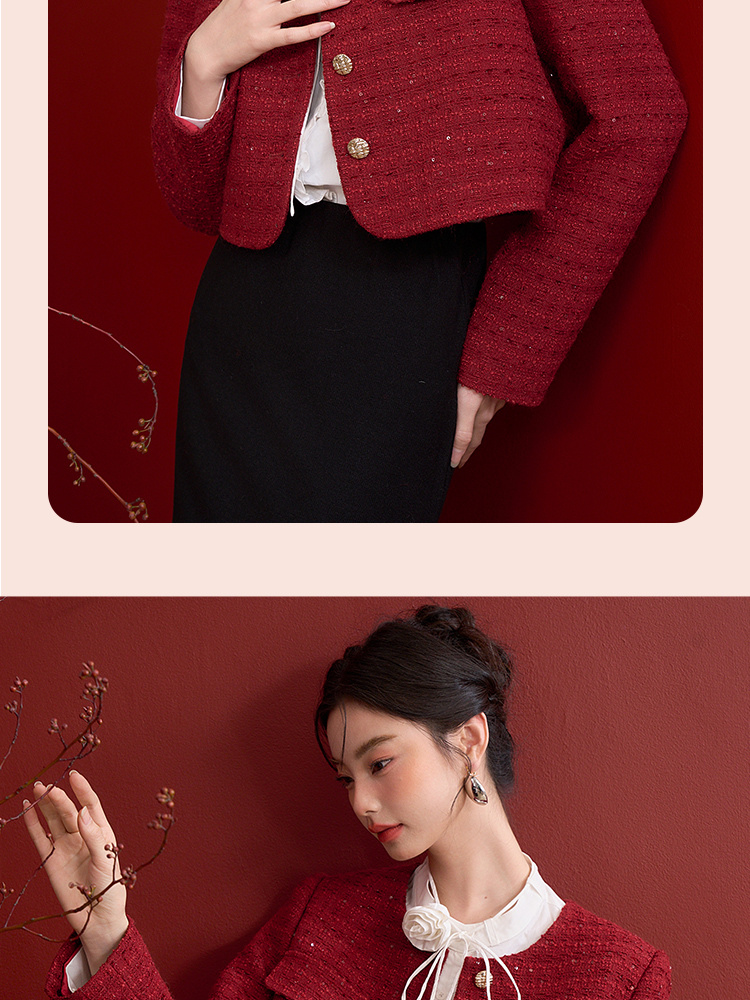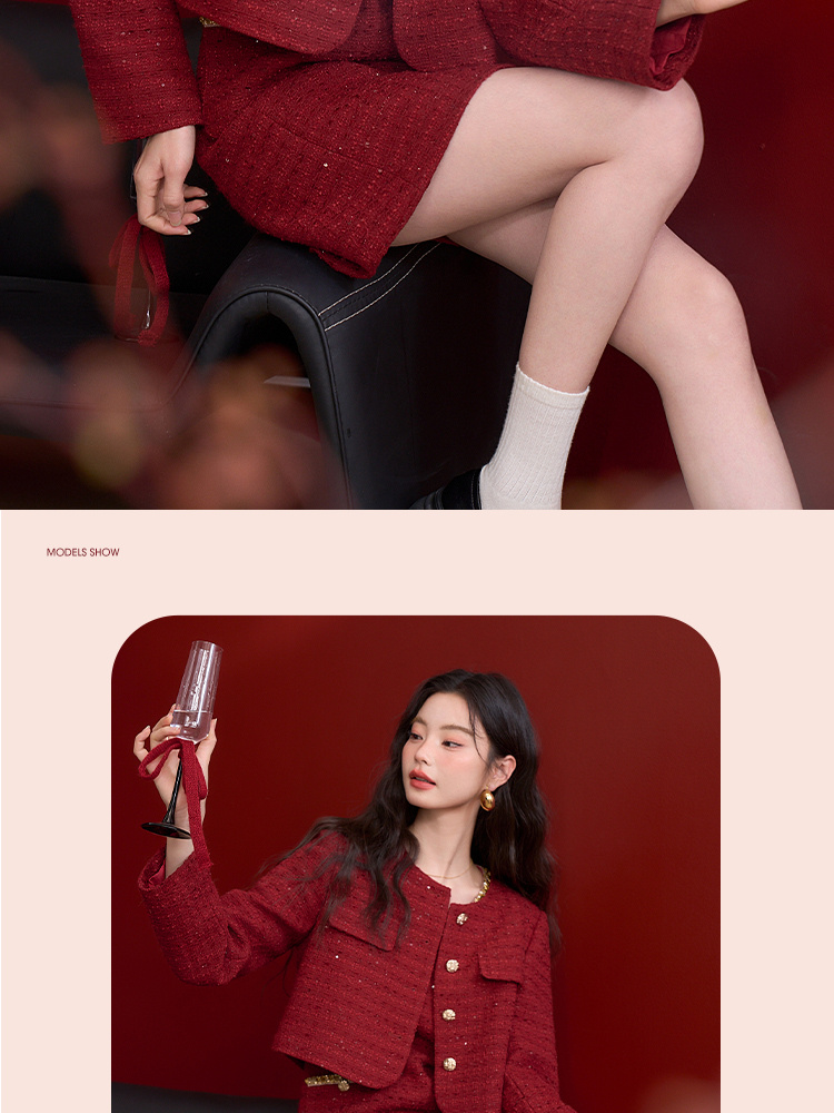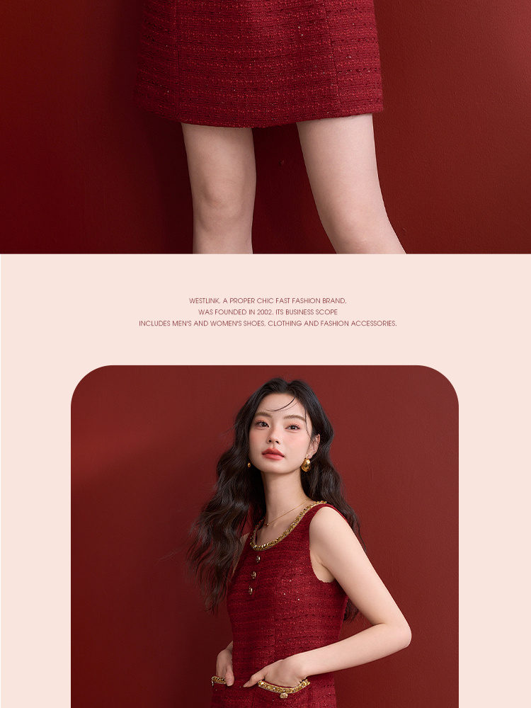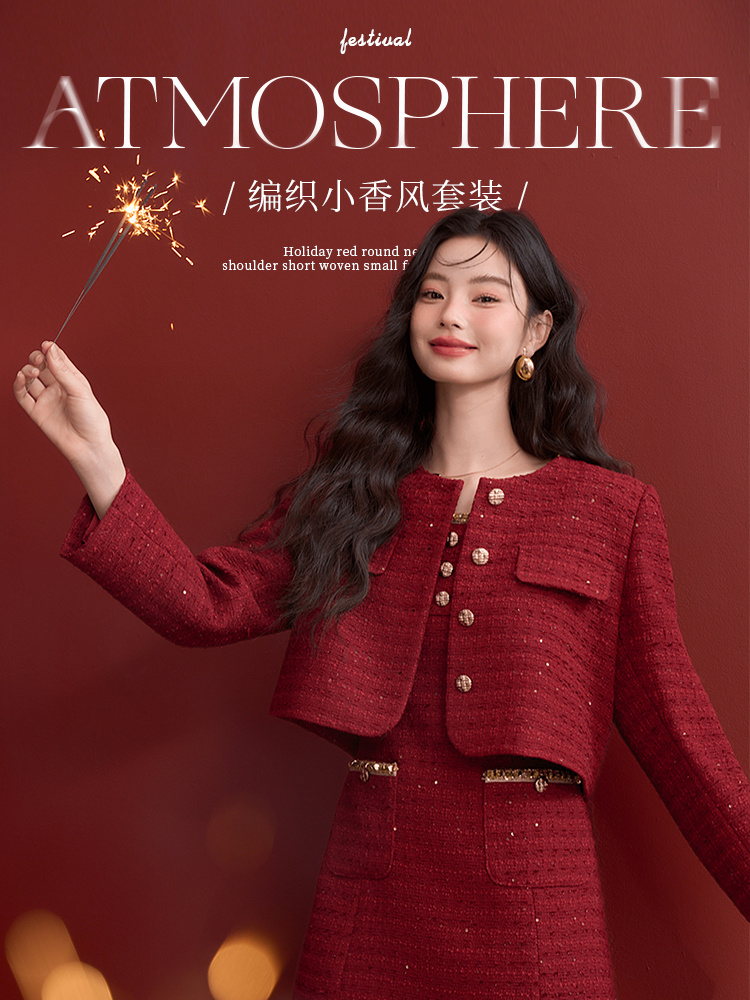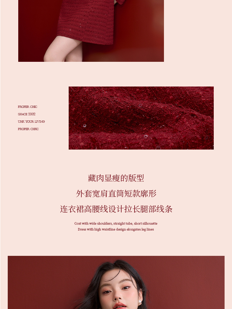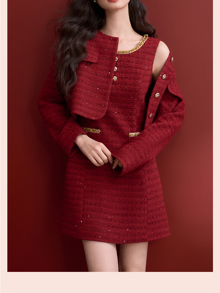 西遇红色小香风外套套装女早春新款新年穿搭背心裙两件套V0150063/V0150064