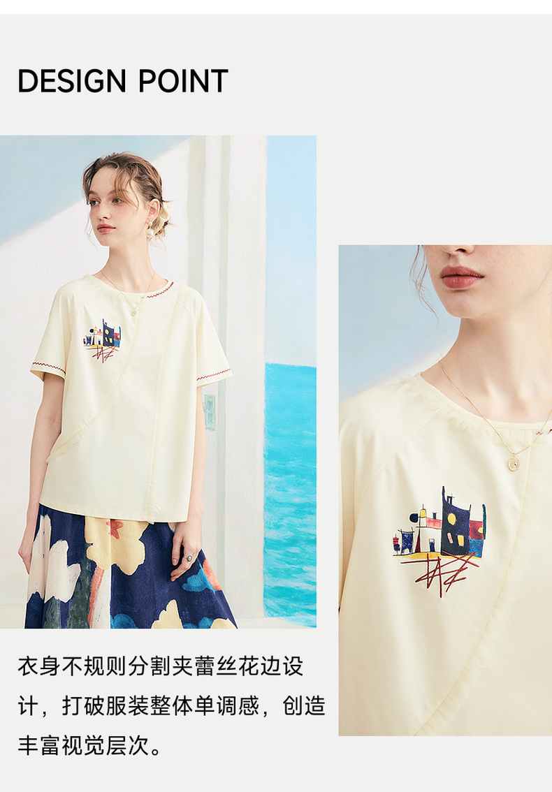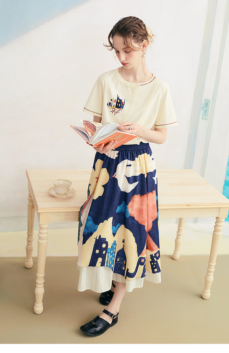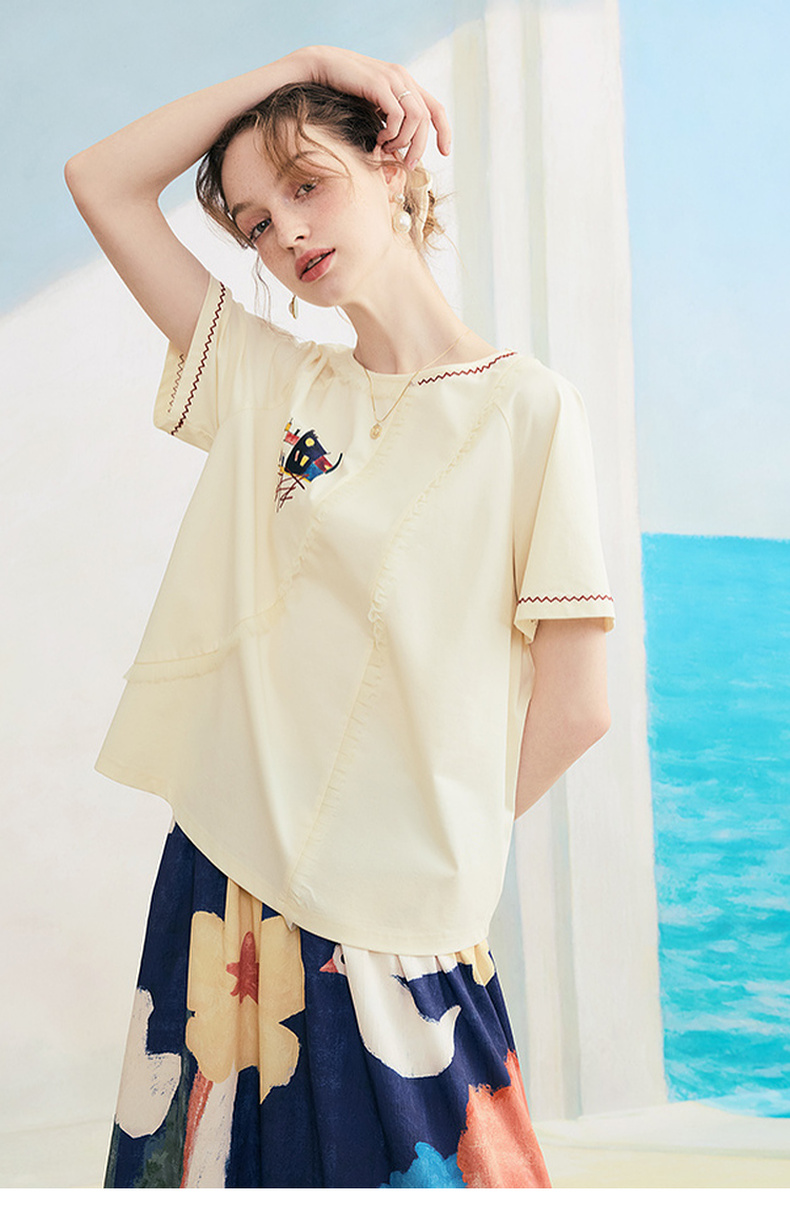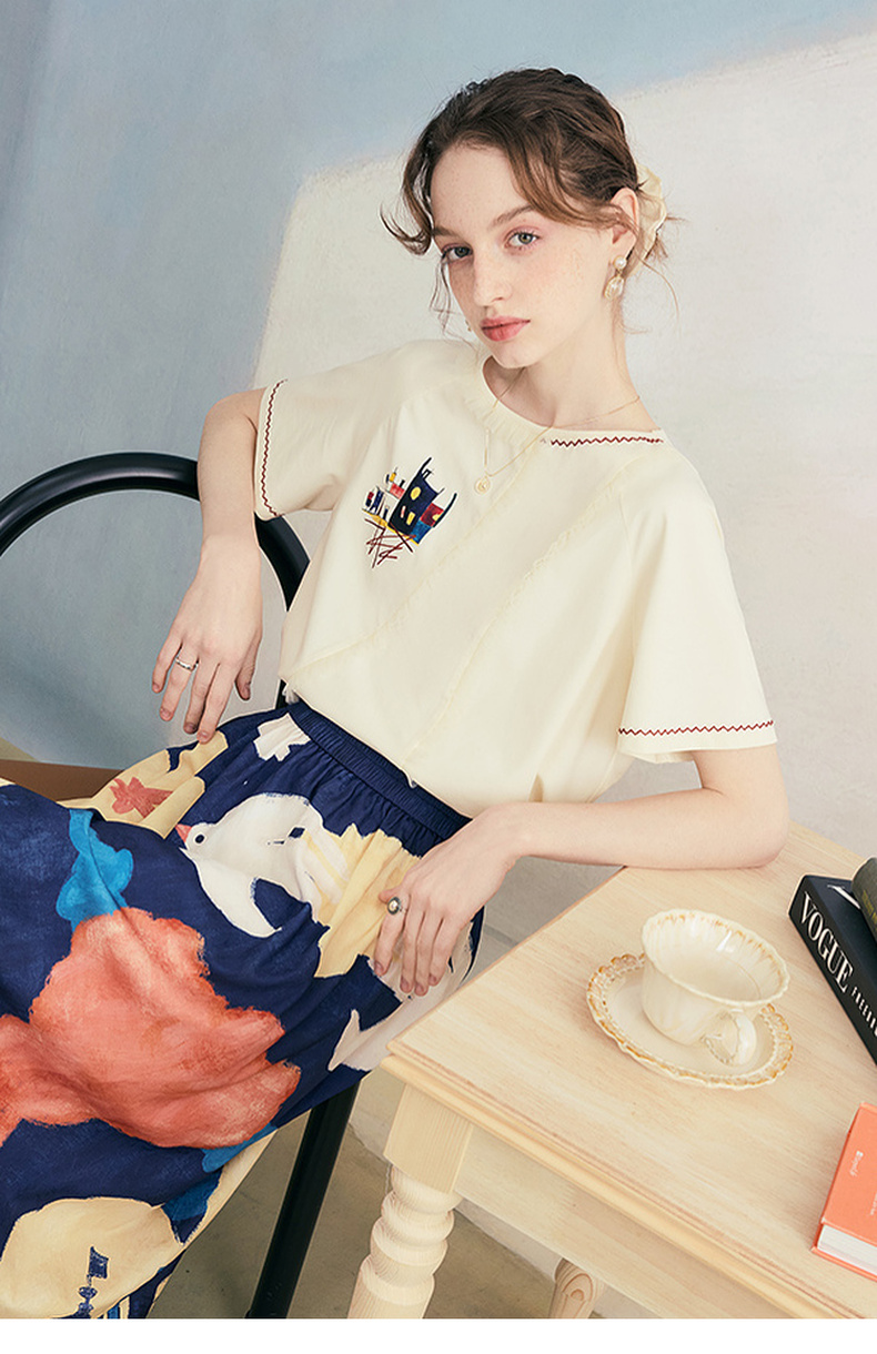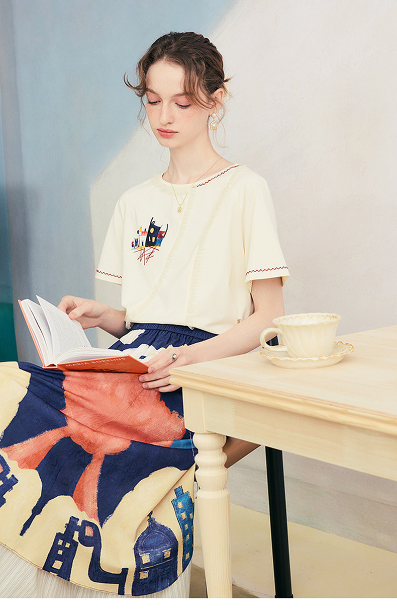 两三事逆行时空2025夏新款森系风涂鸦印花刺绣短袖t恤女