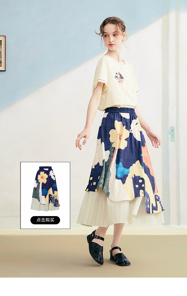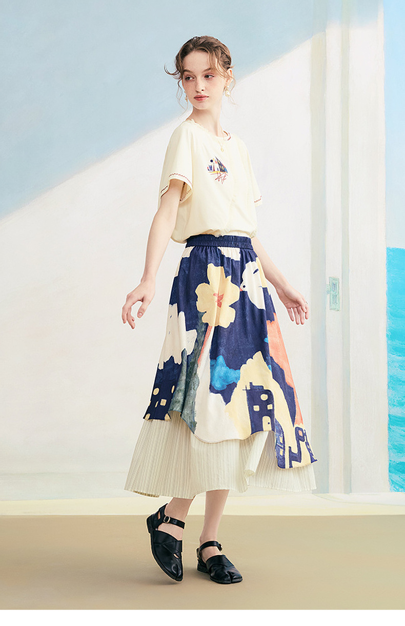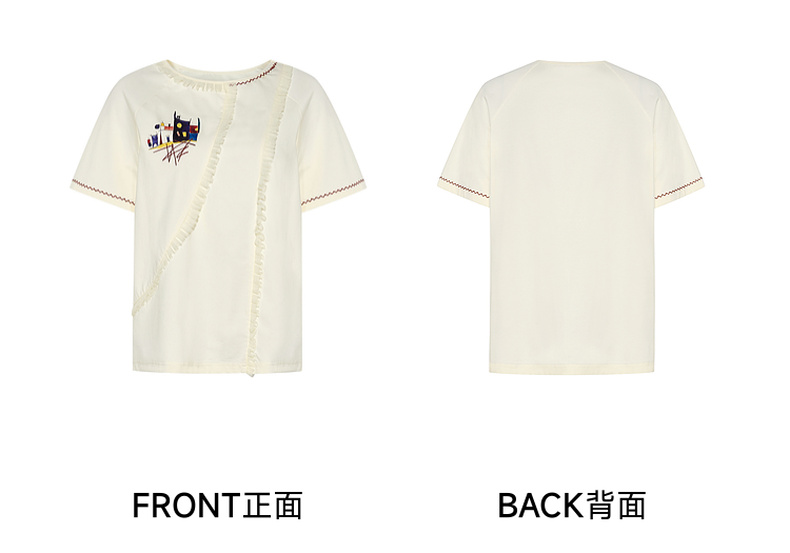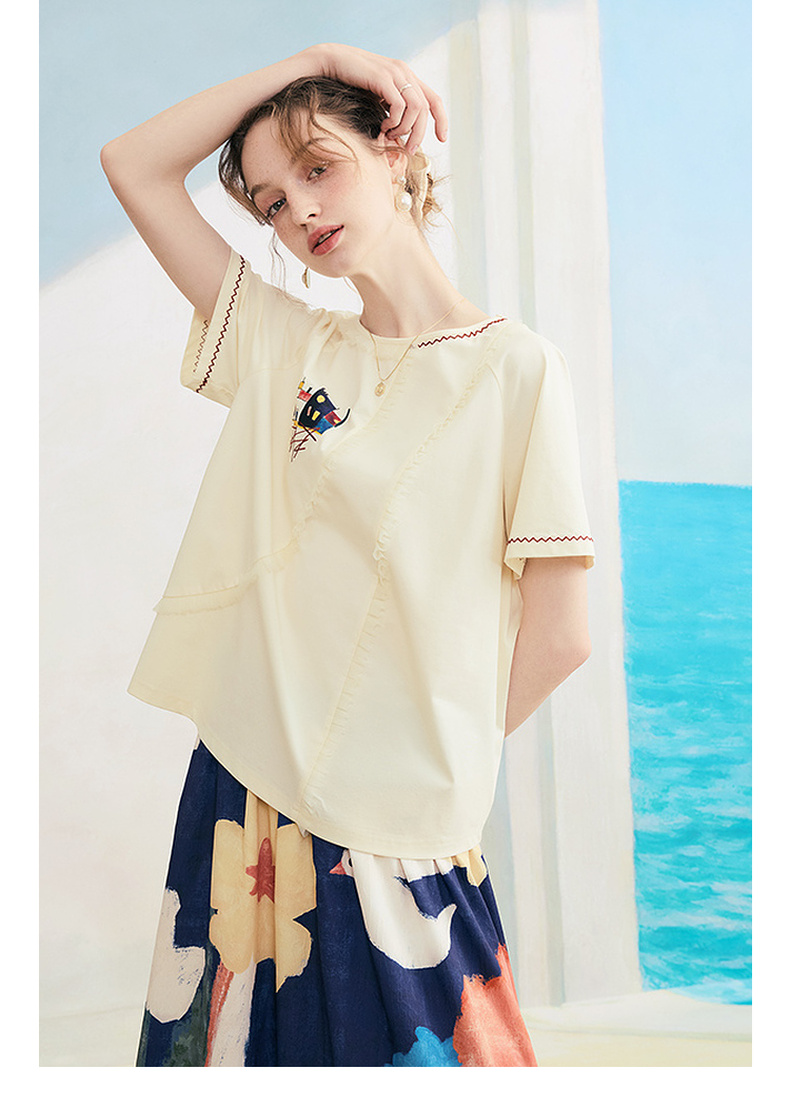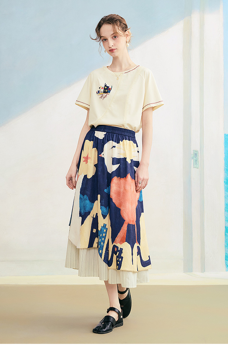 两三事逆行时空2025夏新款森系风涂鸦印花刺绣短袖t恤女