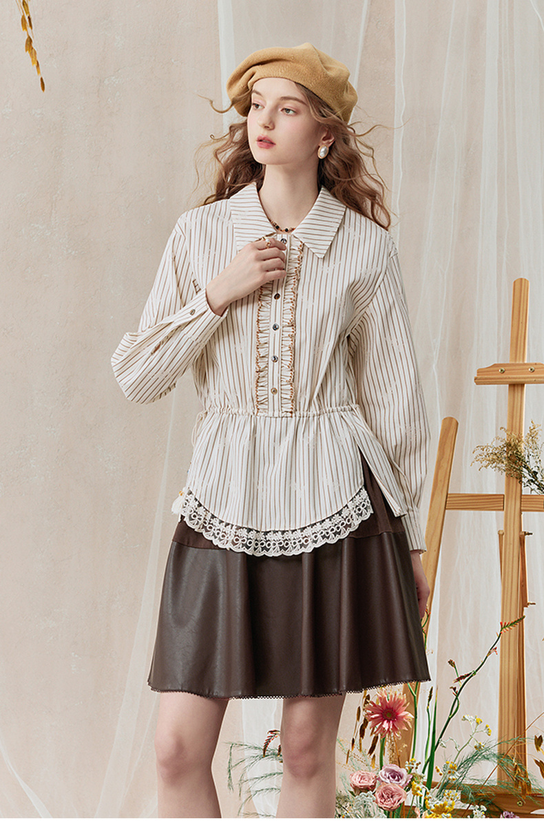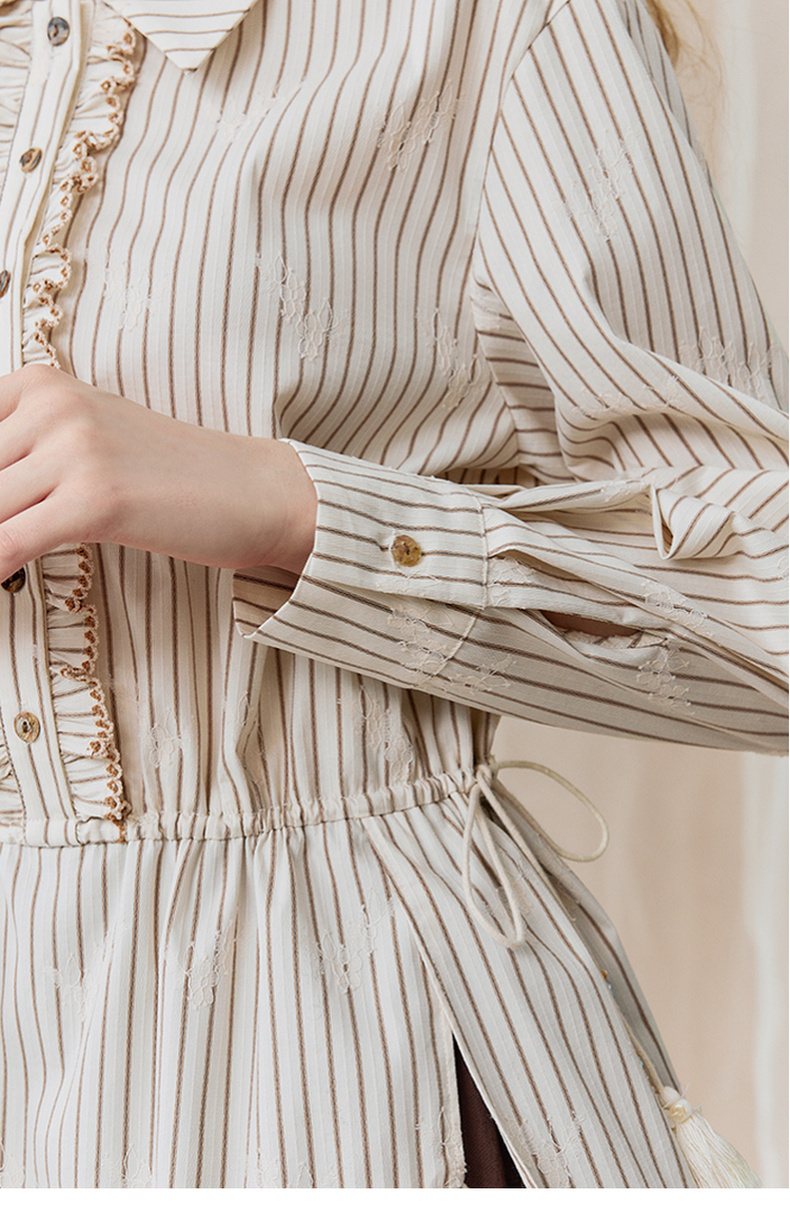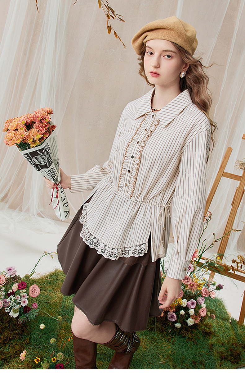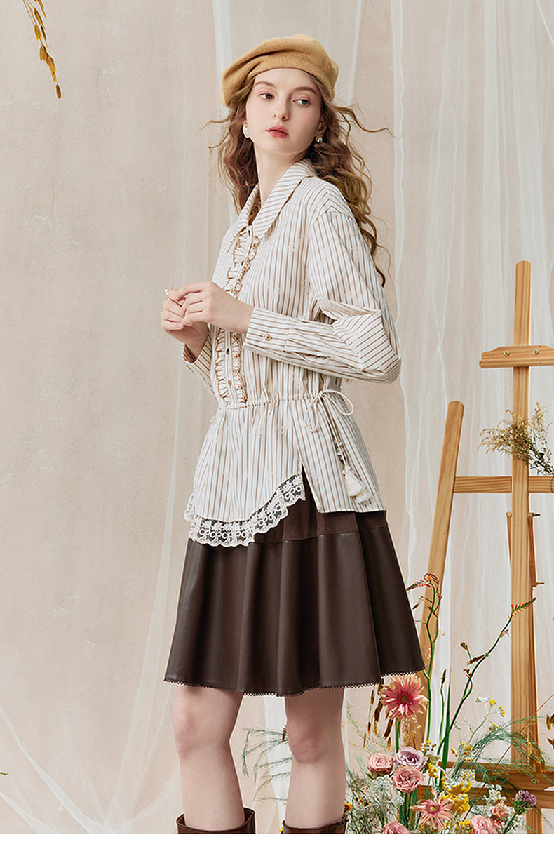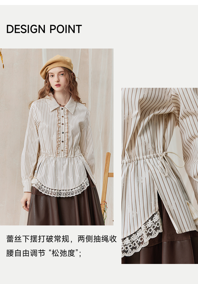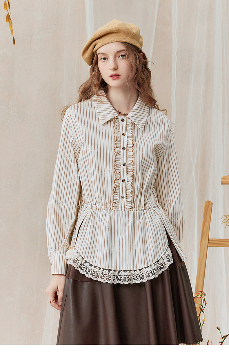 两三事 风染流年 2025秋季新款复古蕾丝拼接收腰绑带条纹衬衫女