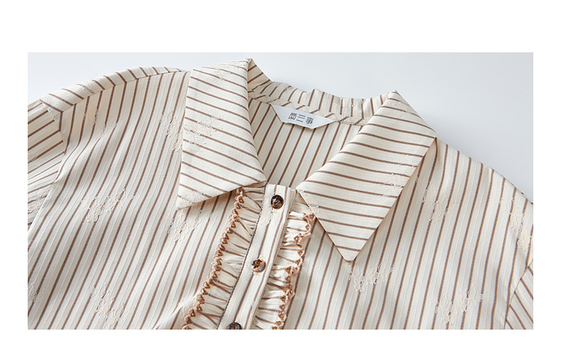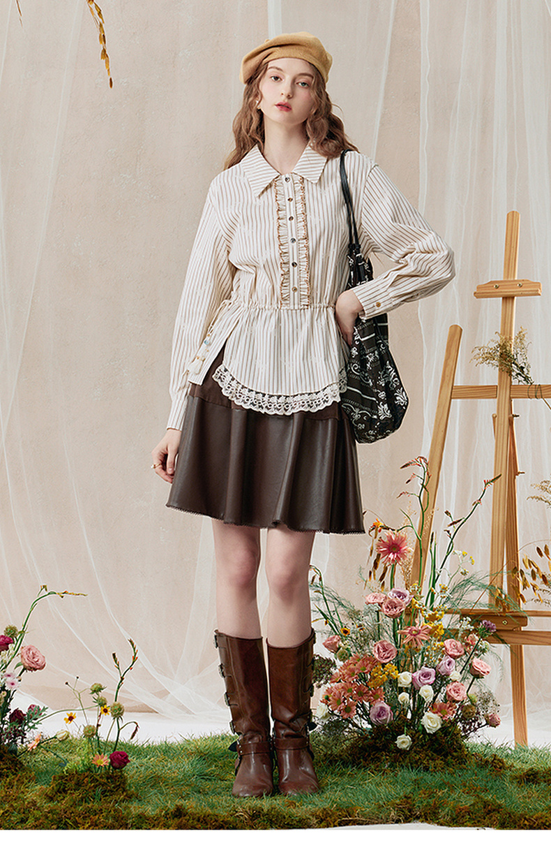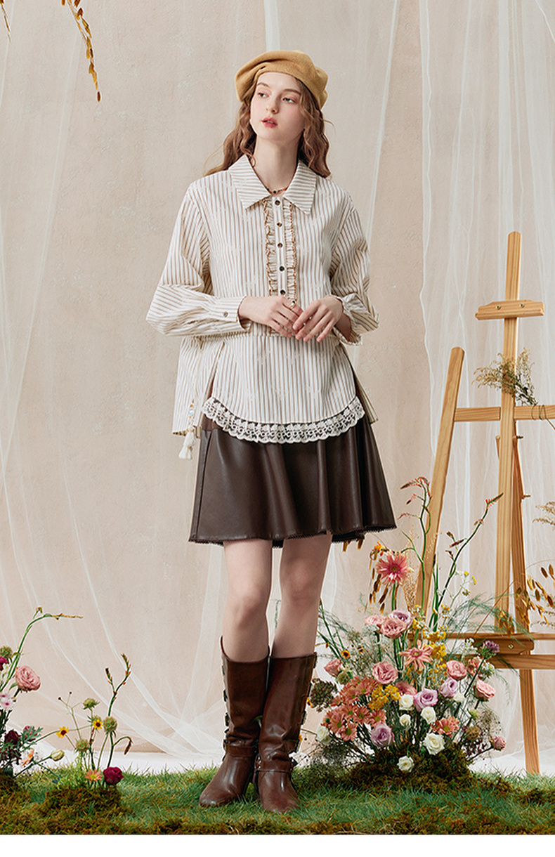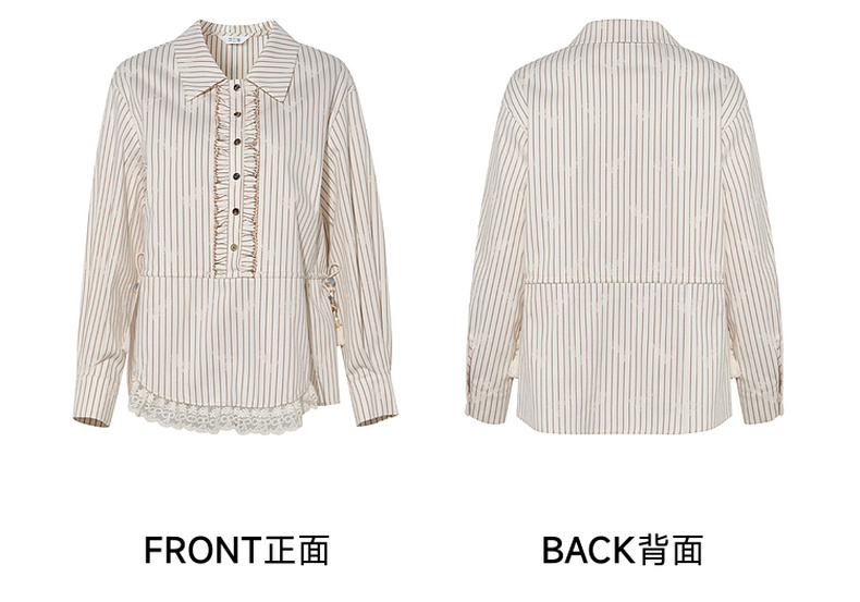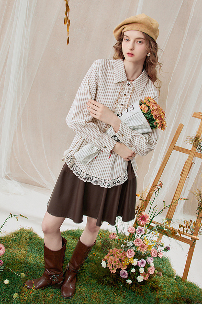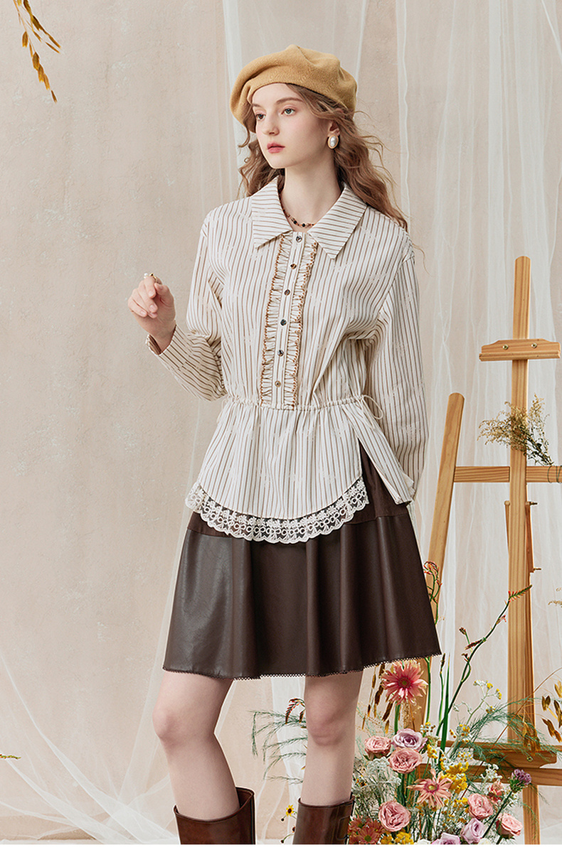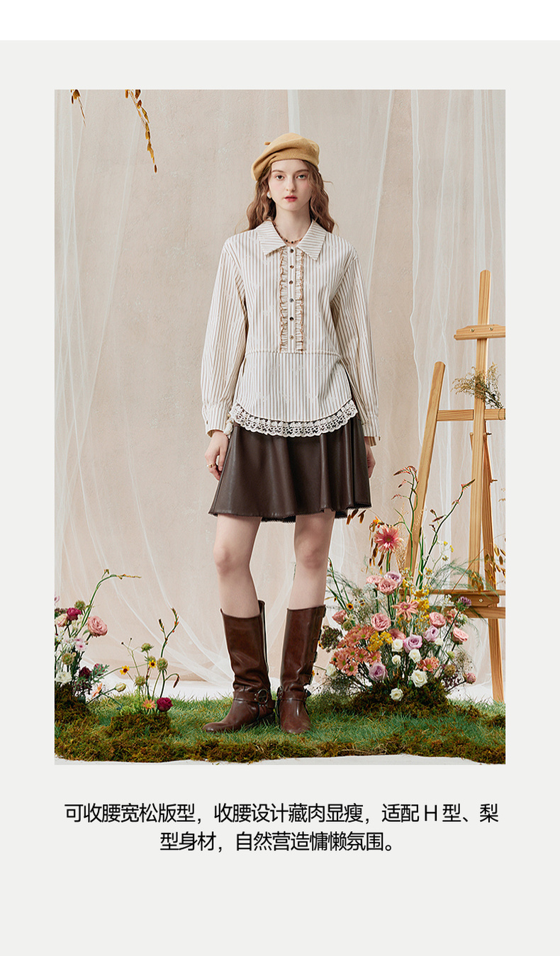 两三事 风染流年 2025秋季新款复古蕾丝拼接收腰绑带条纹衬衫女