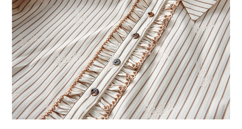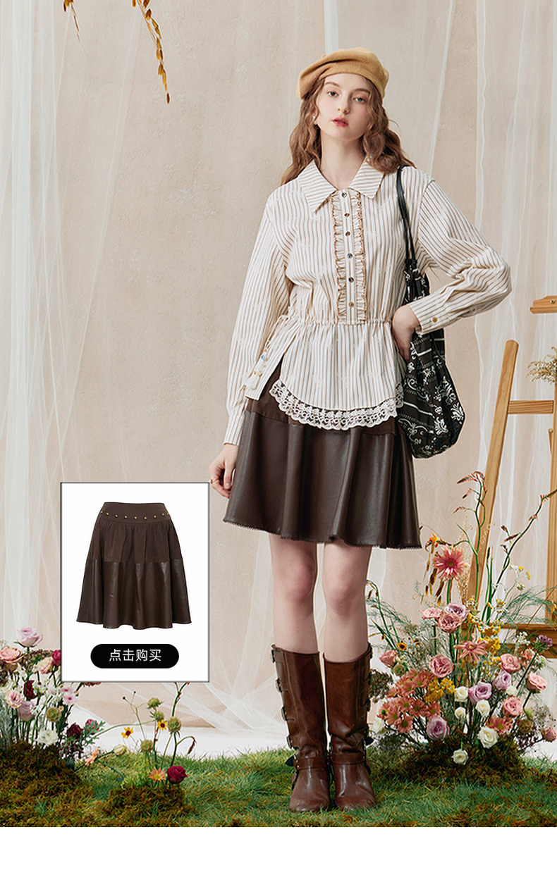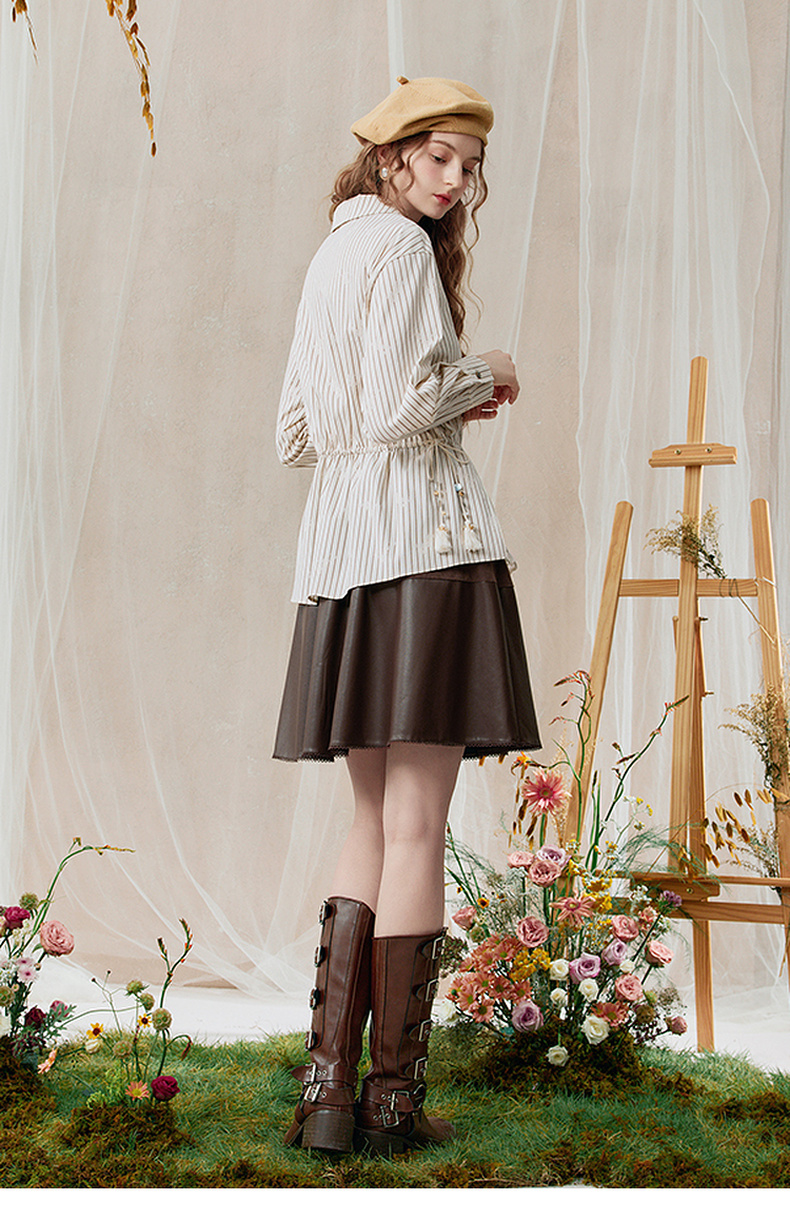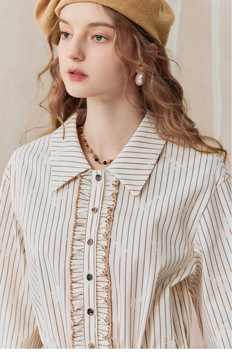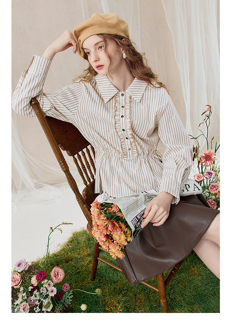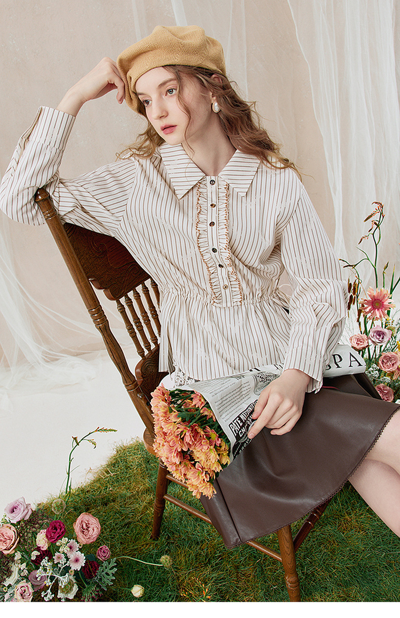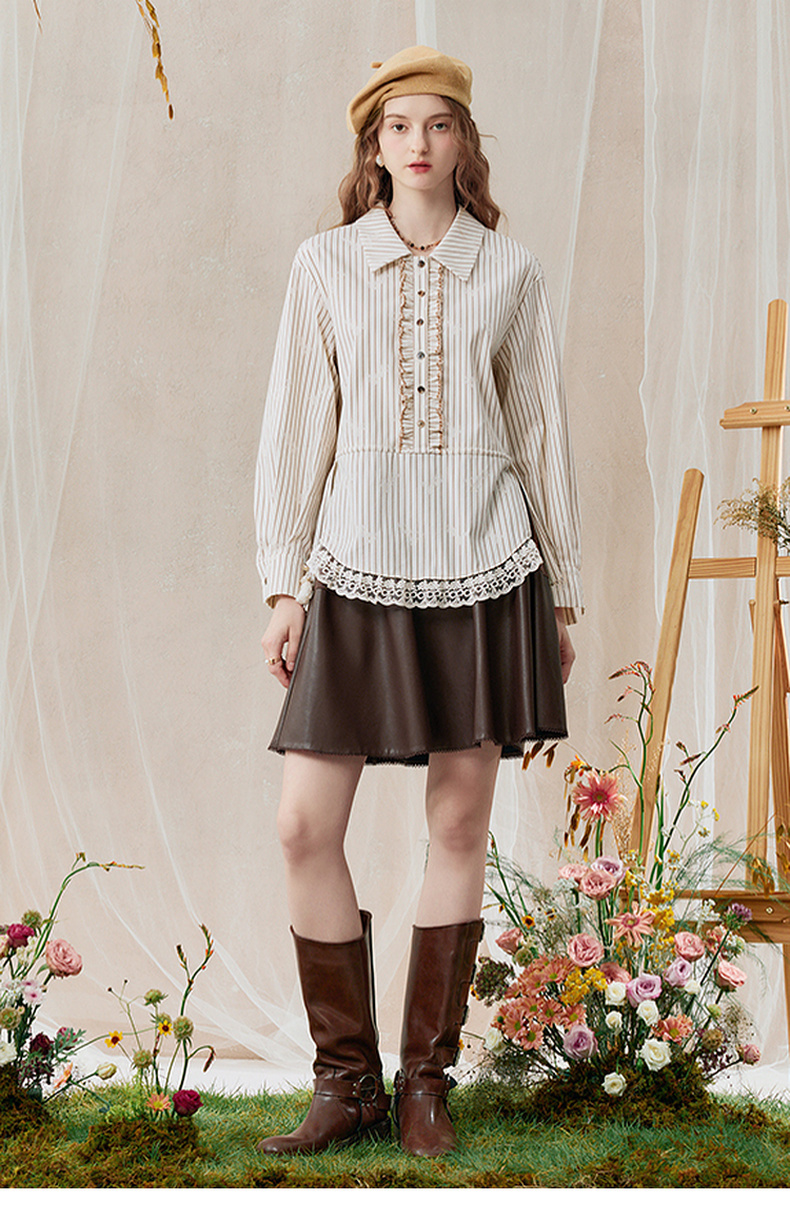 两三事 风染流年 2025秋季新款复古蕾丝拼接收腰绑带条纹衬衫女