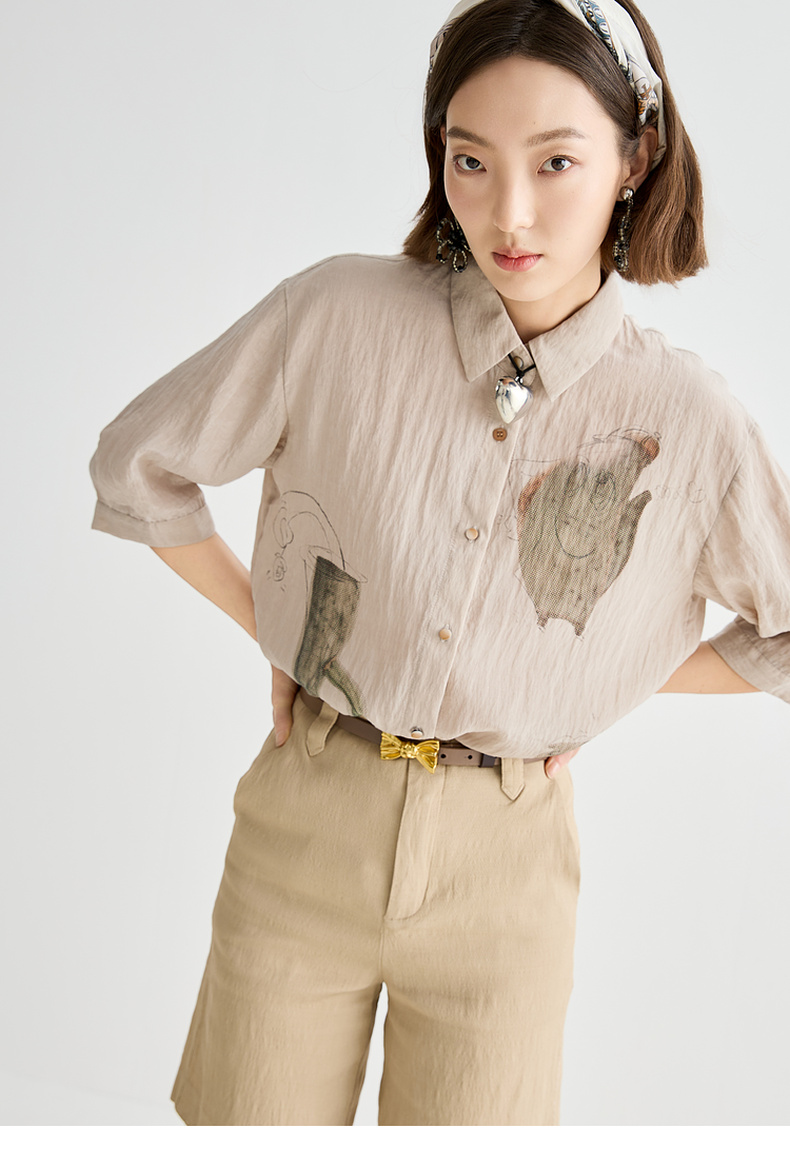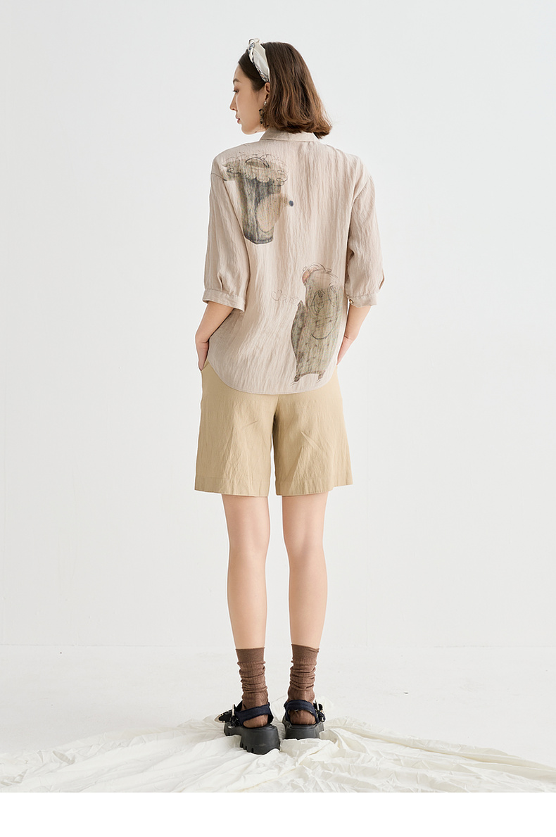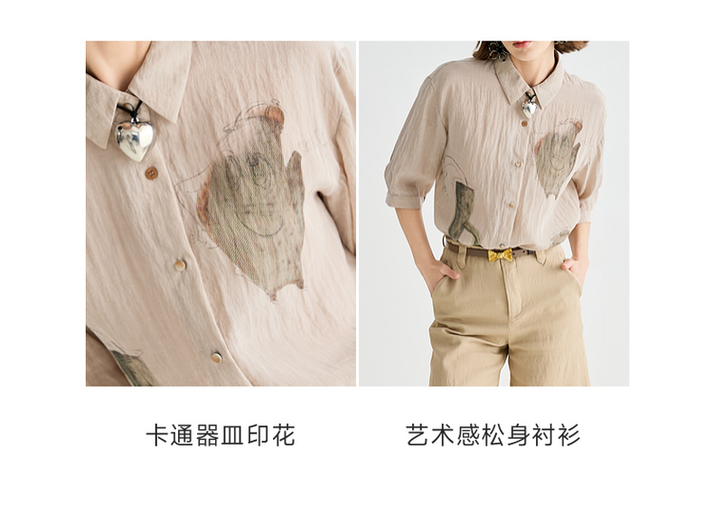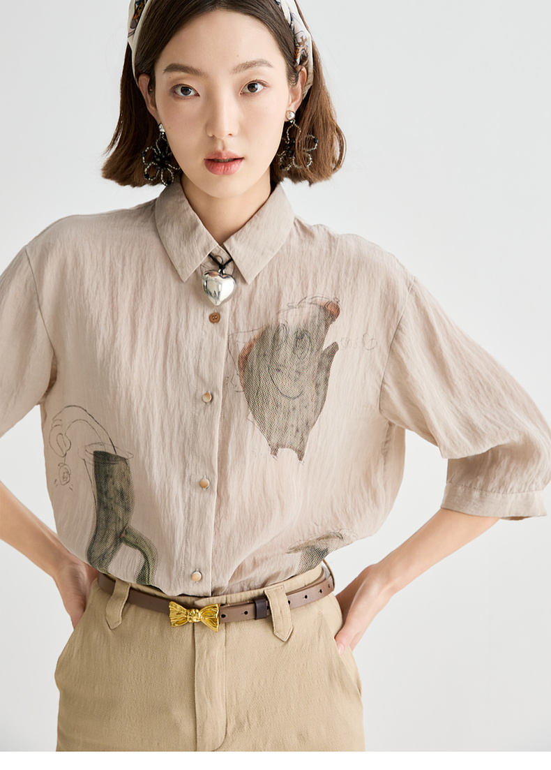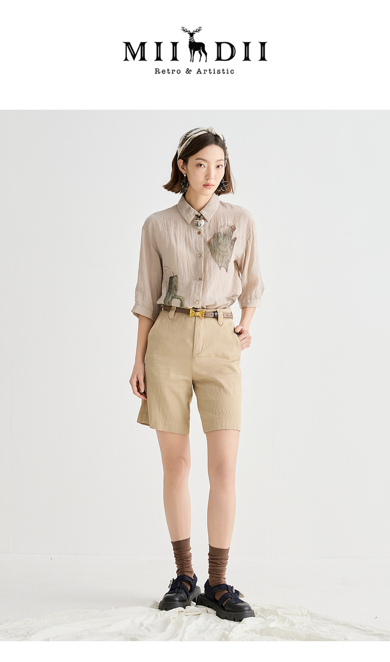 谜底衬衫分袖女2025夏季新品复古风通勤宽松H型中长衬衣252MC0682