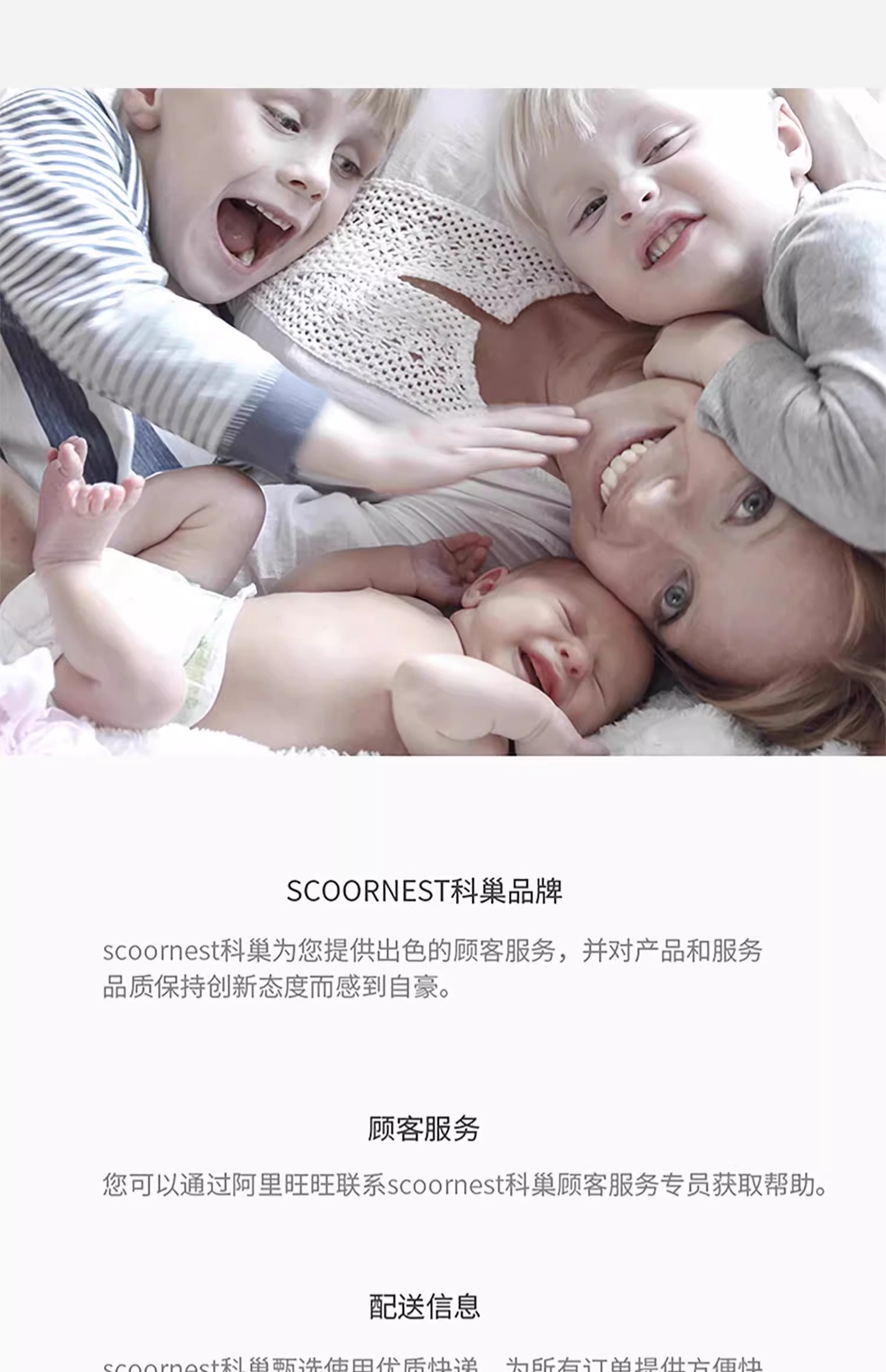 - Scoornest始终秉承给每一位宝宝送去科学的、关心的、创新的成长体验,通过提供商品和服务,使顾客形成守护、发展、巩固这种弥足珍贵的亲情的爱。