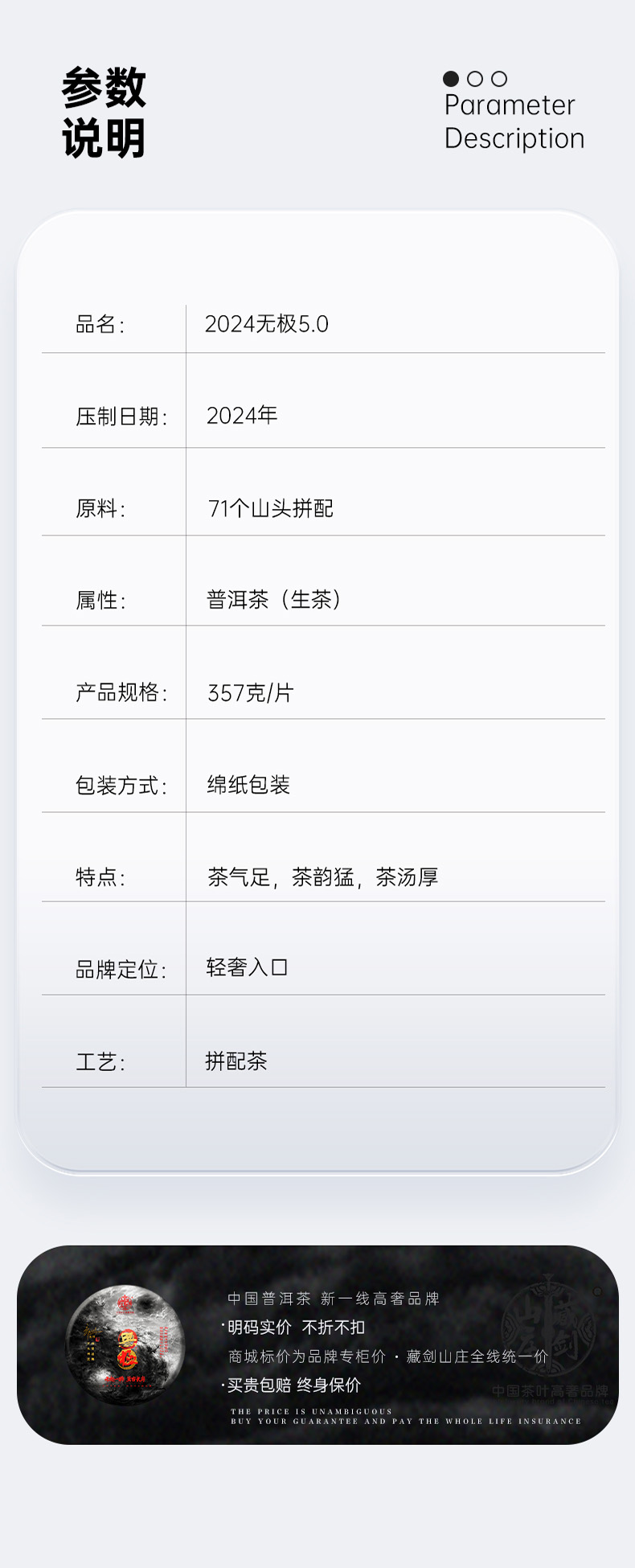 【藏剑山庄】5.0无极!73种原料拼配!皇品珍藏配方!拼配茶的领导者!普洱茶生茶357g/片