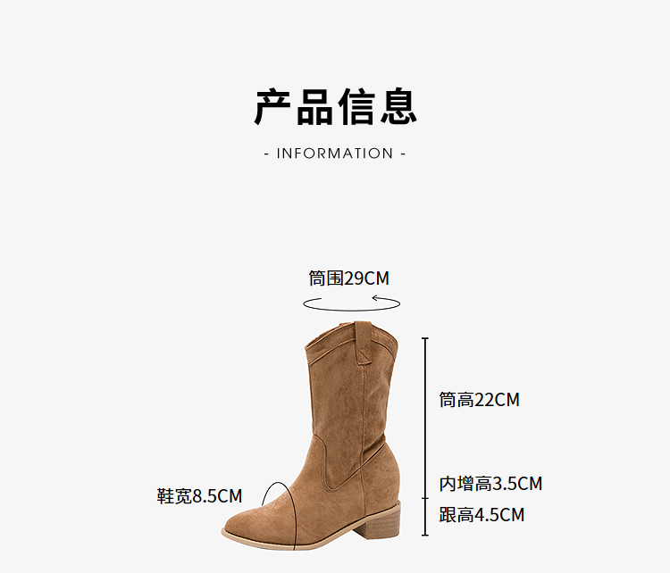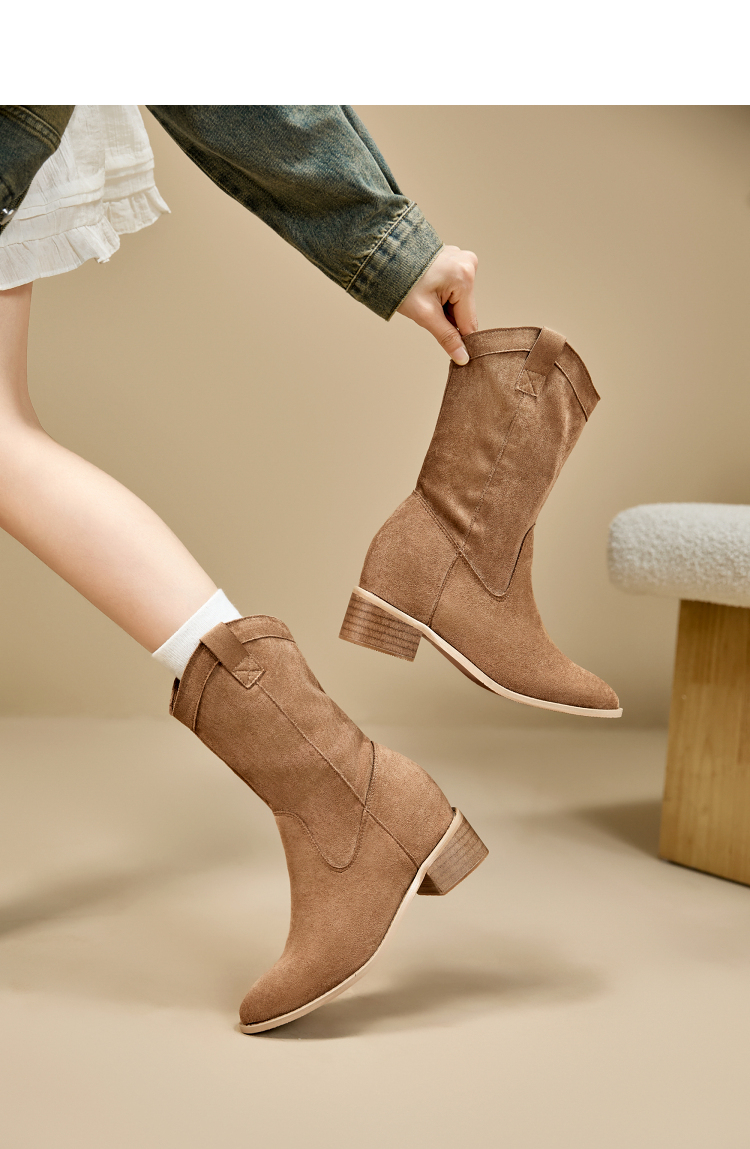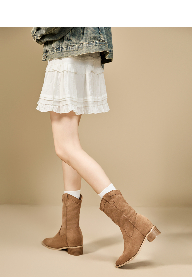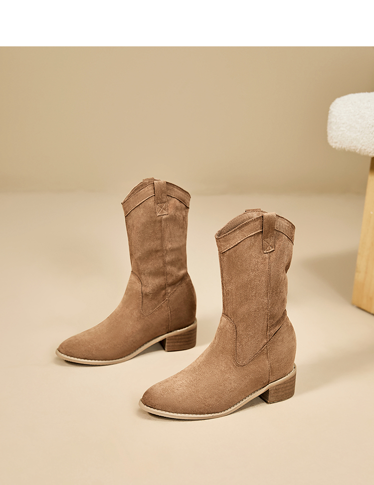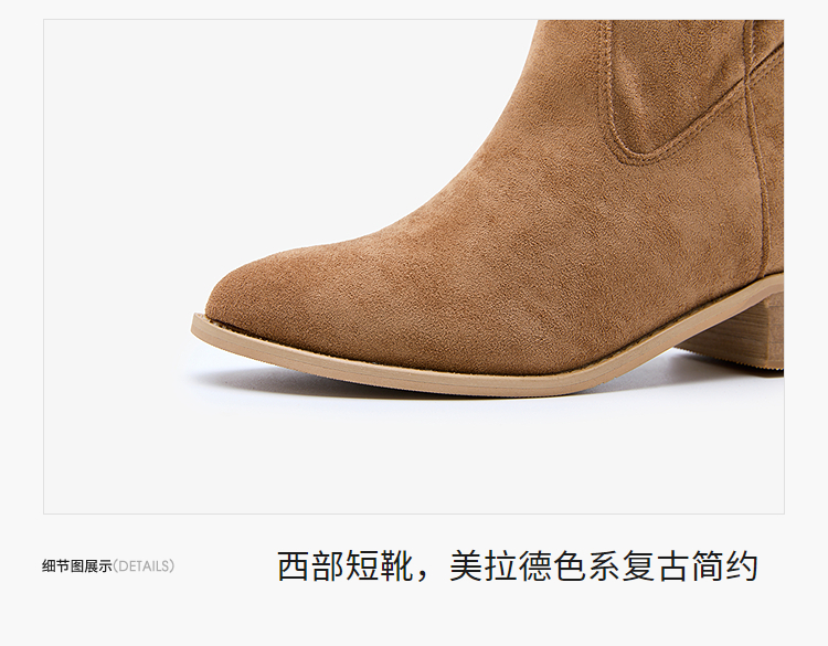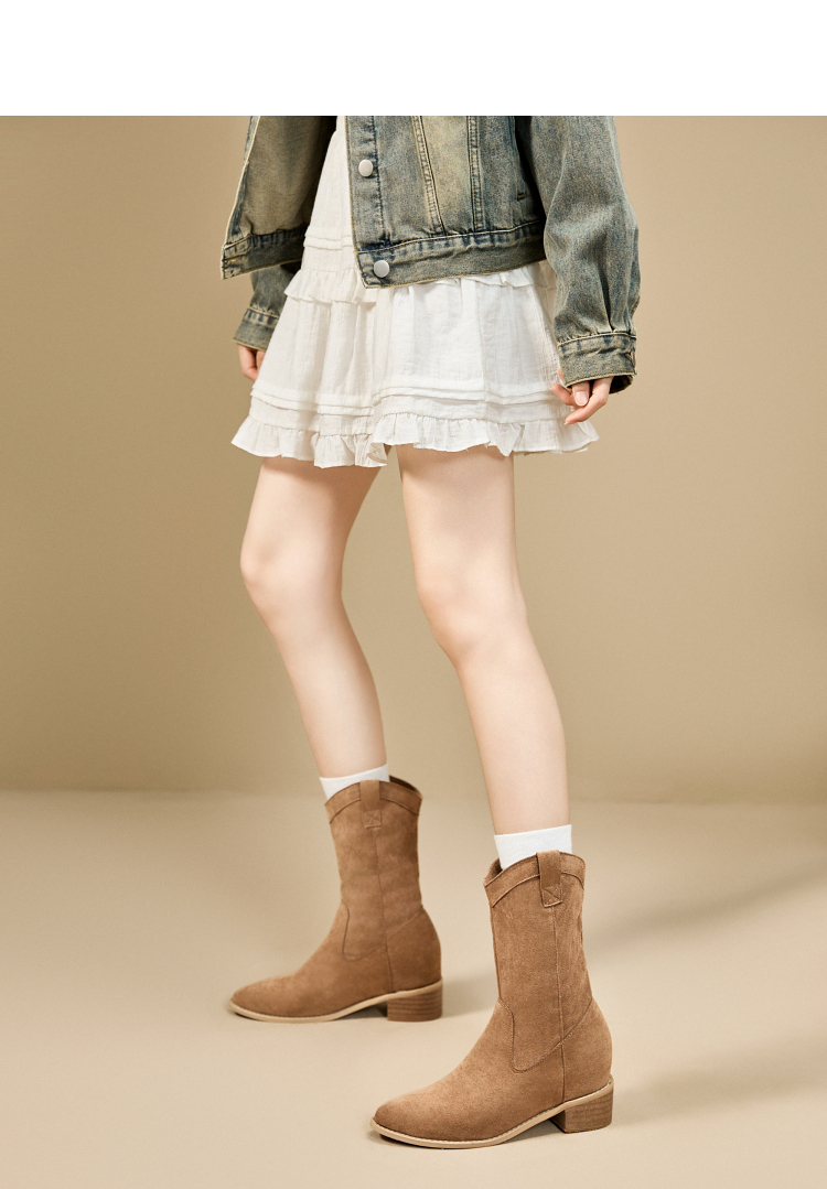 西遇内增高西部牛仔靴女新款秋冬复古废土风V口粗跟棕色短靴V2257224