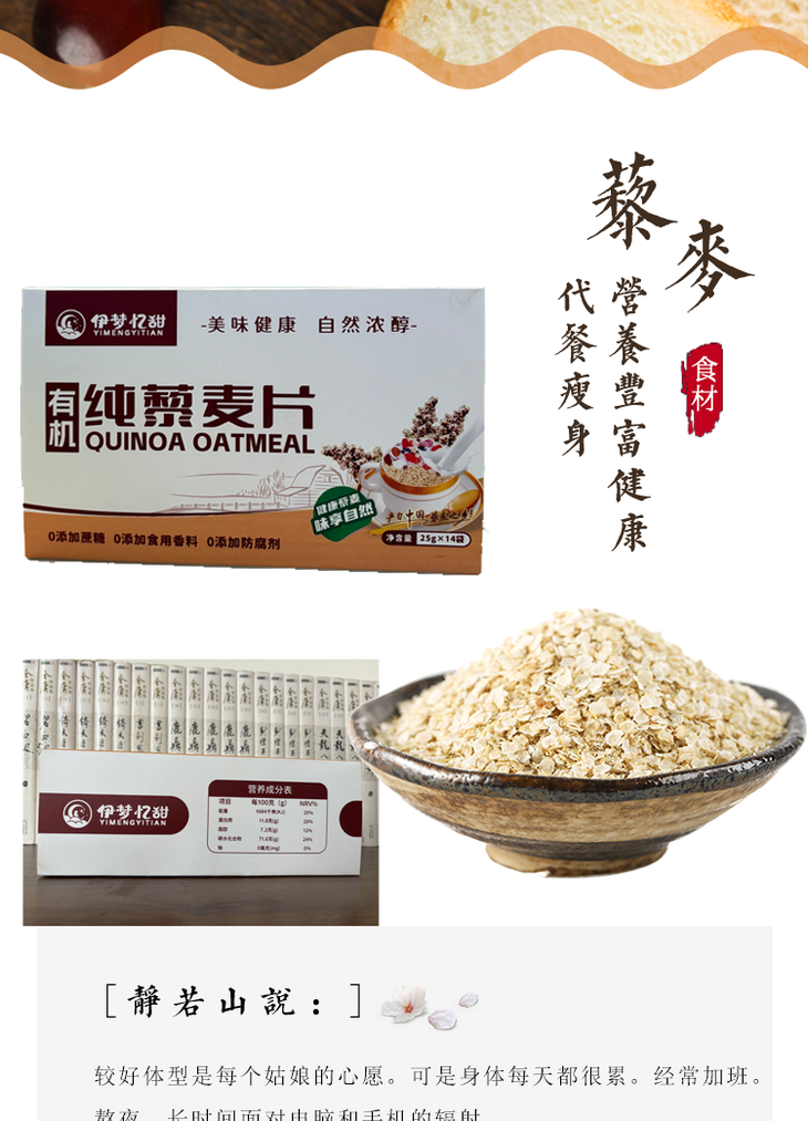 【产品规格】山西 有机藜麦片(每箱都是独立的包装,如购买多件分多个包裹发出,可能会前后陆续到货)。