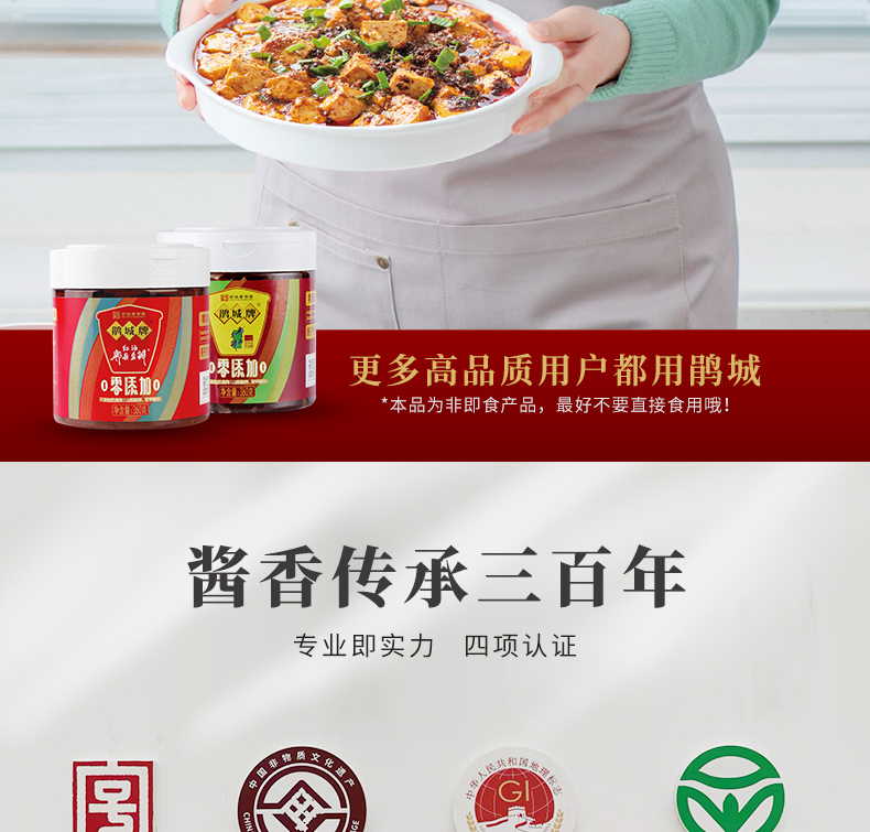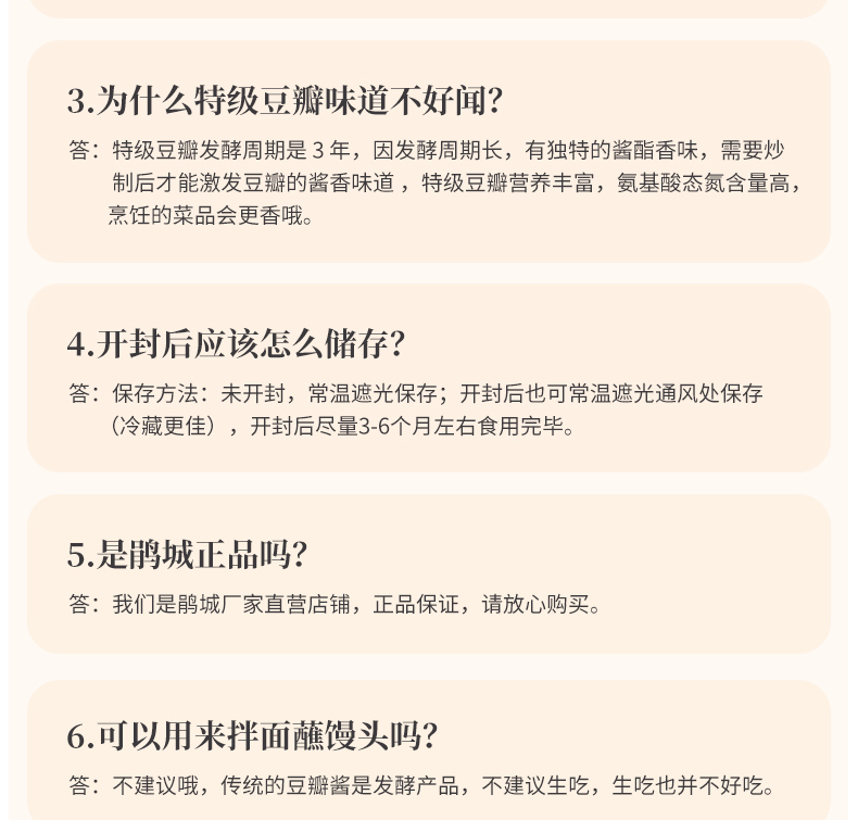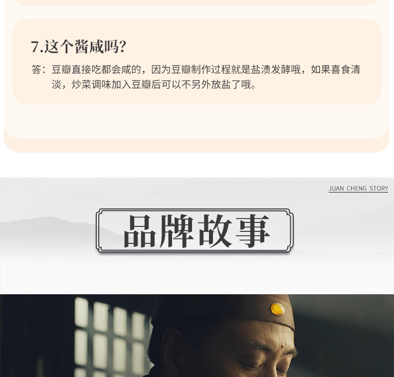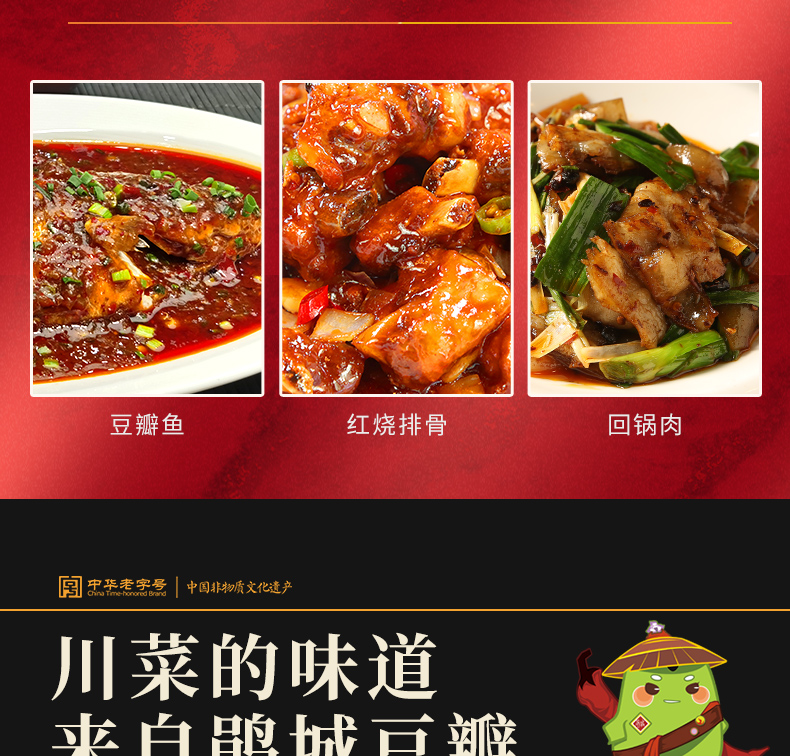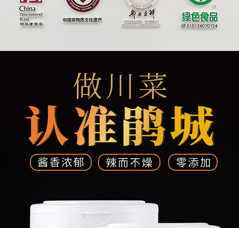 - “鹃城牌“郫县豆瓣,中华老字号企业,源于1688年,国有控股公司,郫县豆瓣行业龙头企业和行业标准化生产示范工厂,中国非物质文化遗产郫县豆瓣传统制作技艺传承企业。 获“中华老字号”、“中国非物质文化遗产