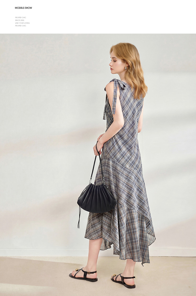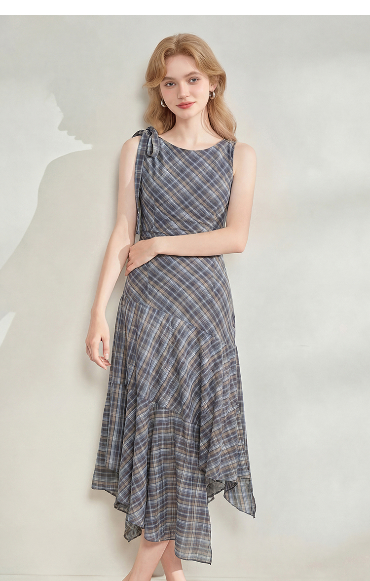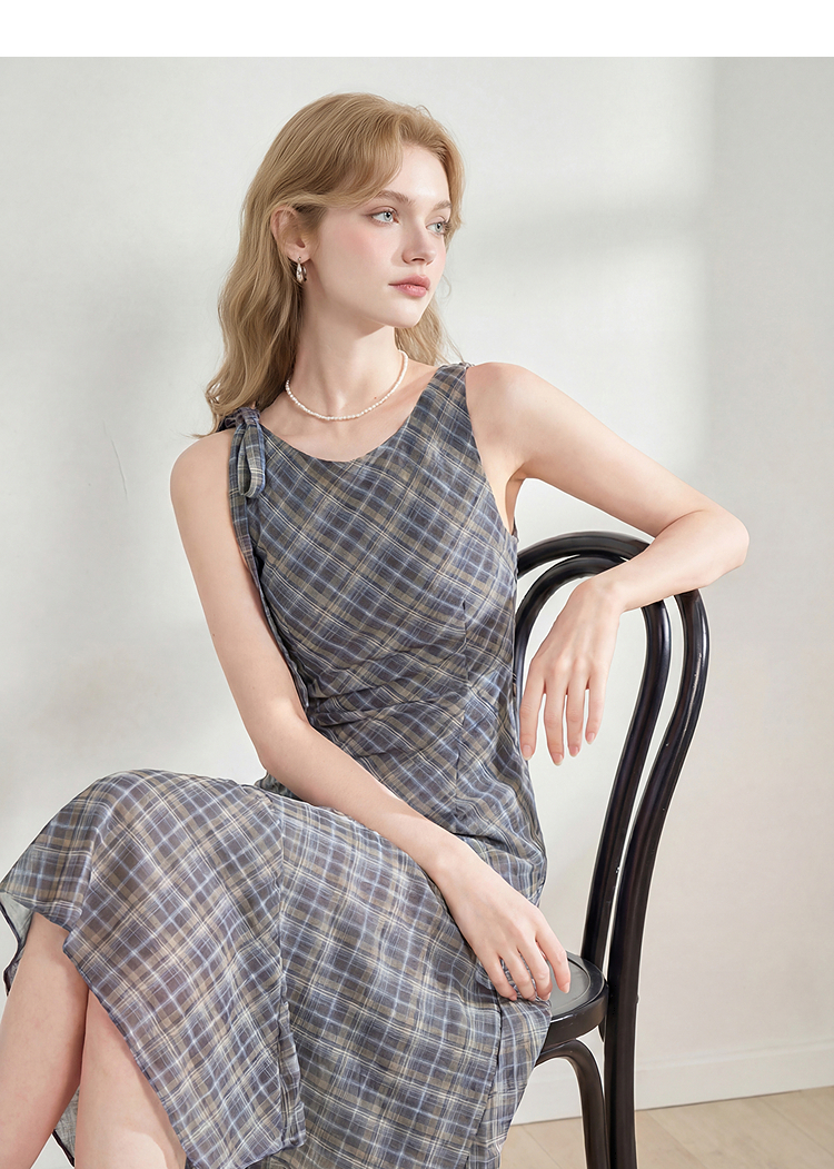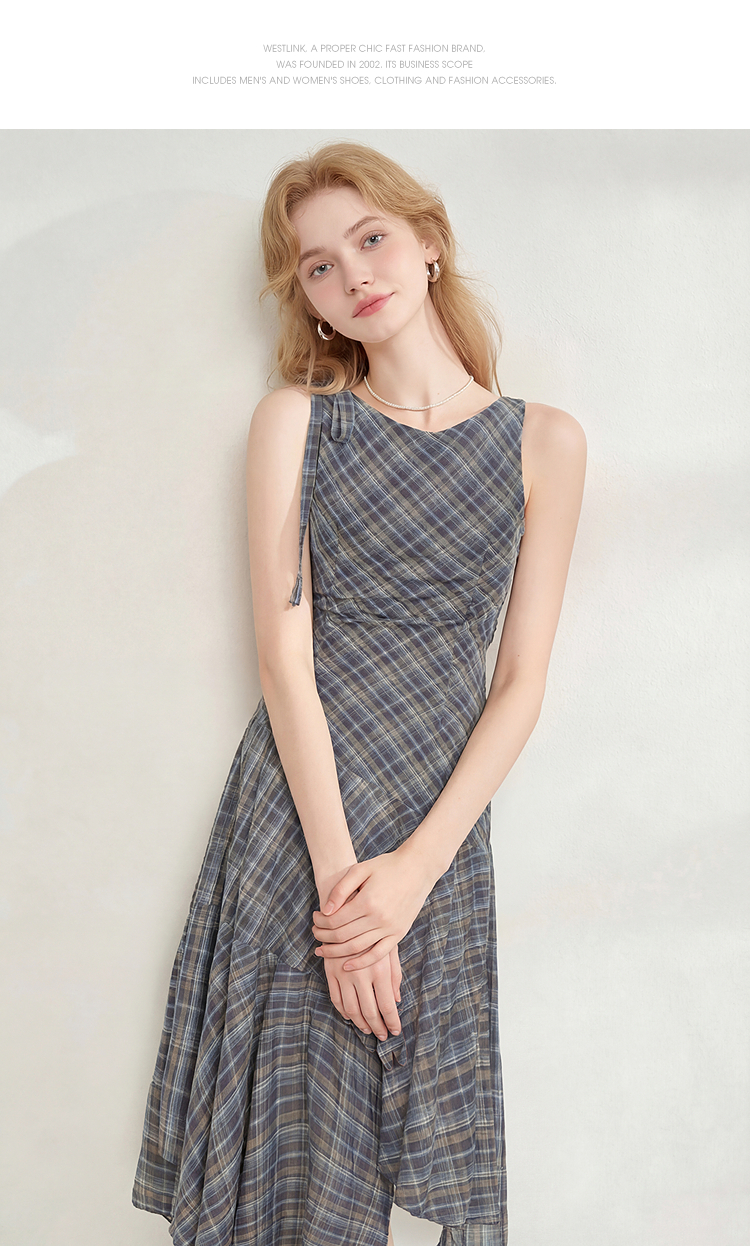 西遇2026夏新款复古挂脖格纹连衣裙女收腰系带不规则下摆气质长裙E0060268