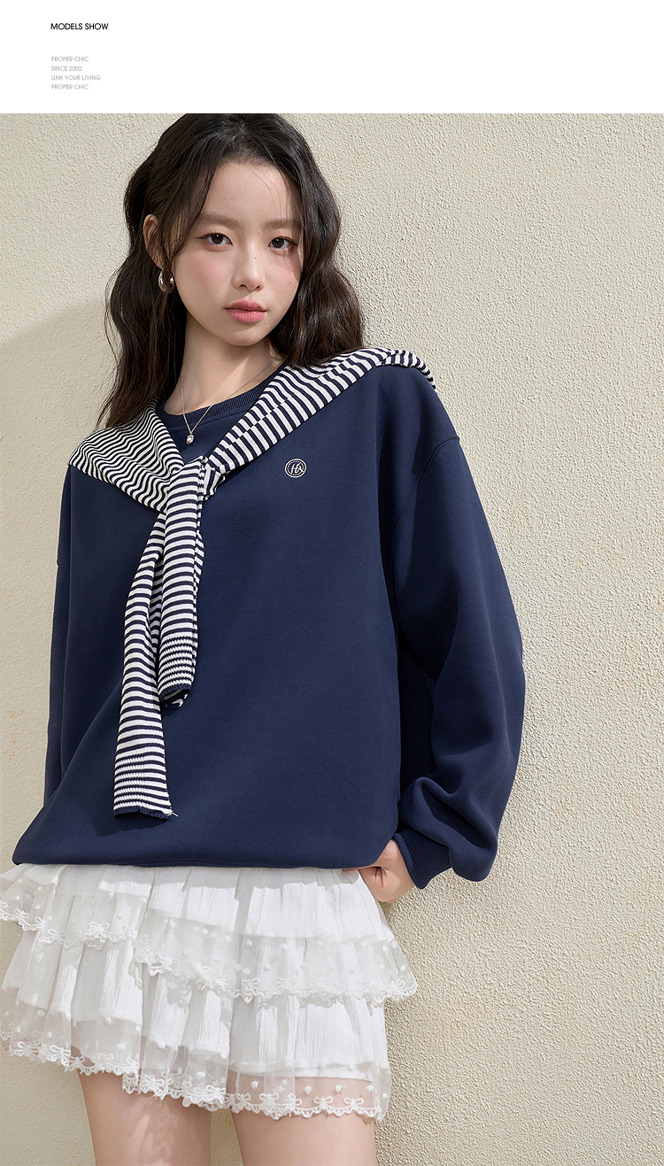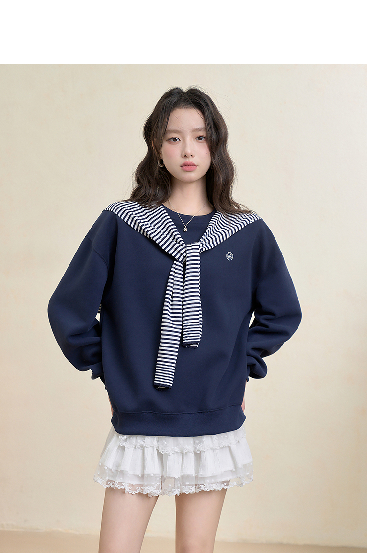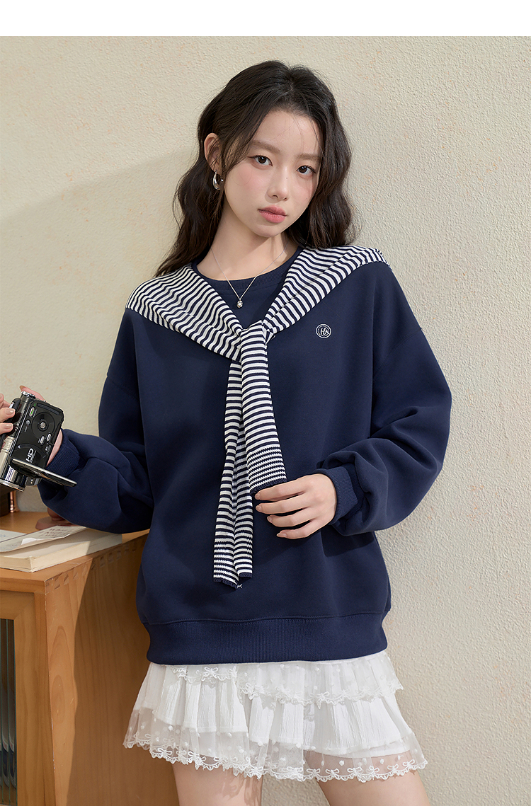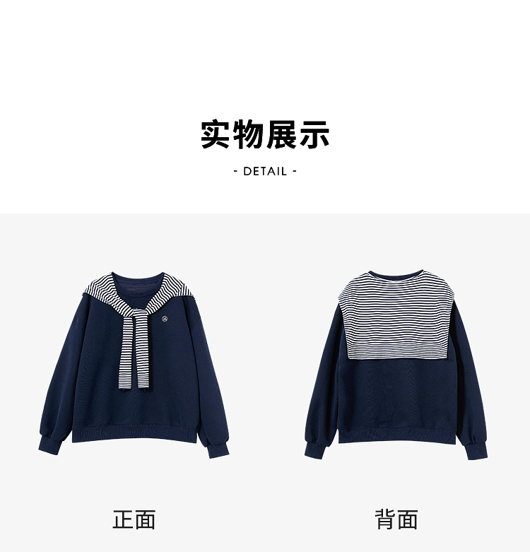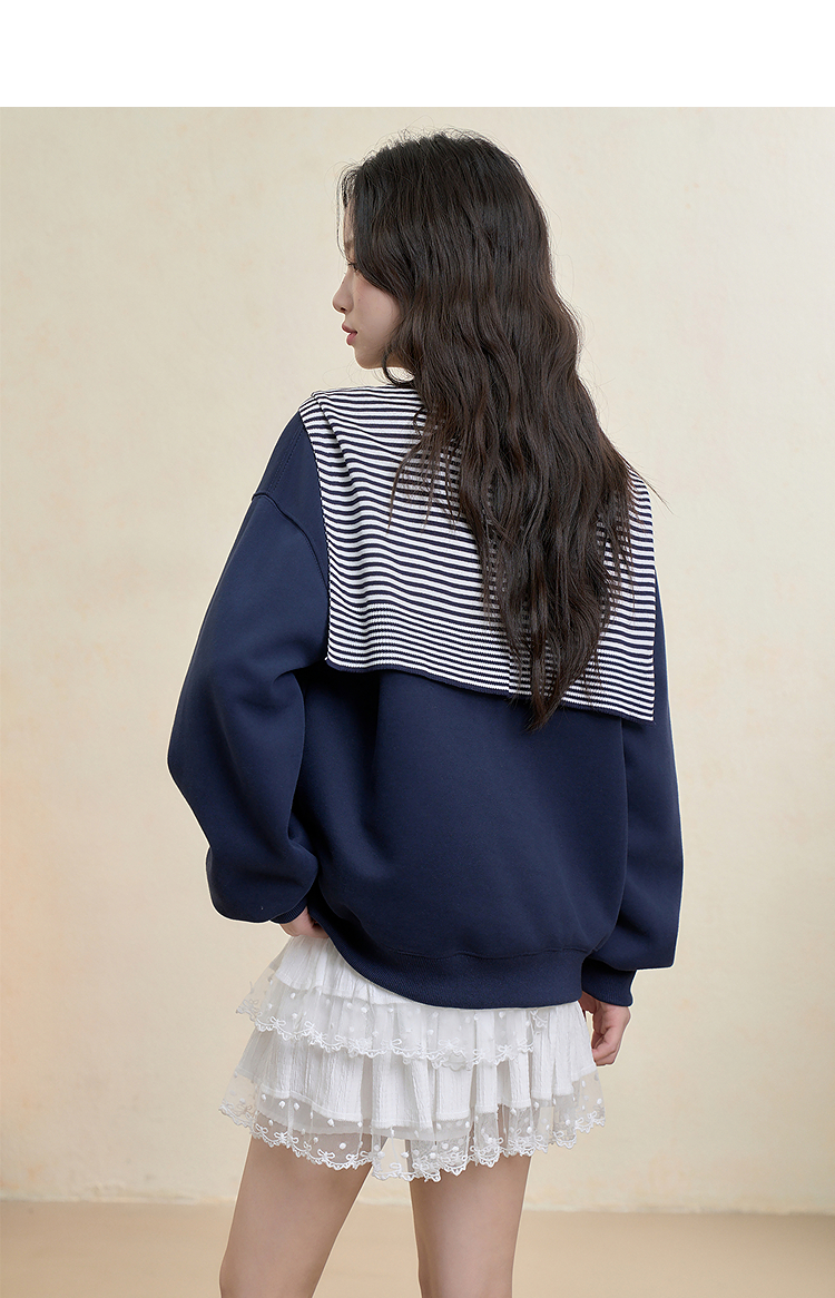 西遇宽松圆领卫衣女秋季新款学院风条纹披肩叠穿长袖上衣H0055271
