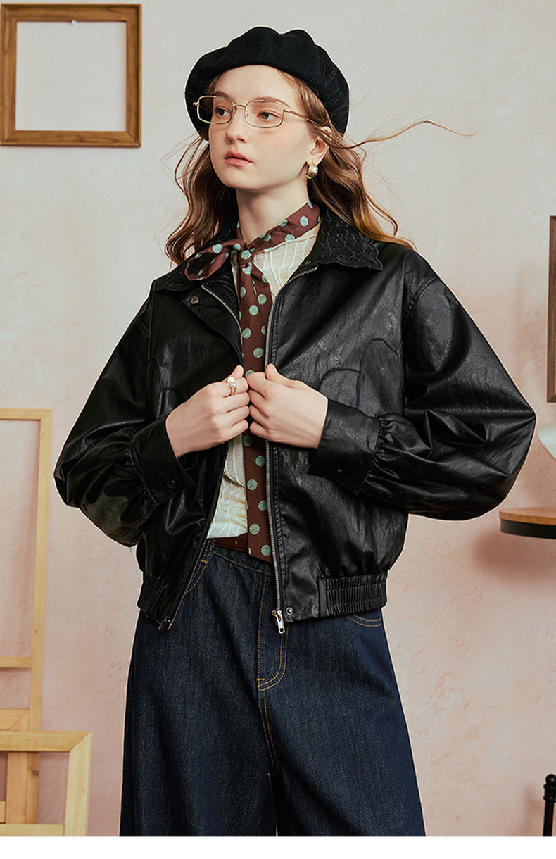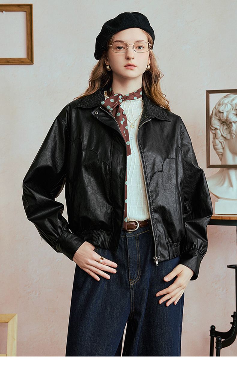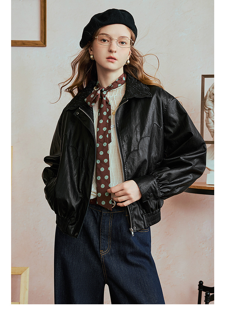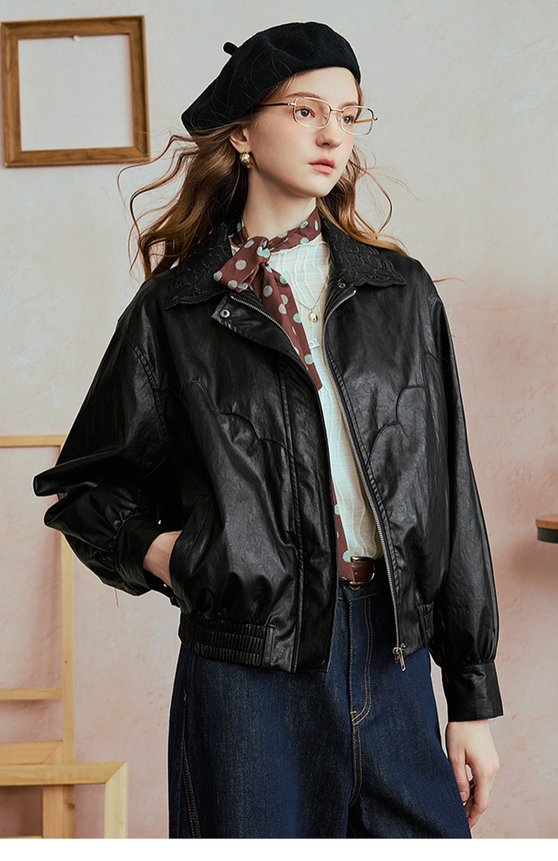 两三事暗夜荣耀2025秋季新款复古镂空花纹翻领短款皮衣外套女宽松