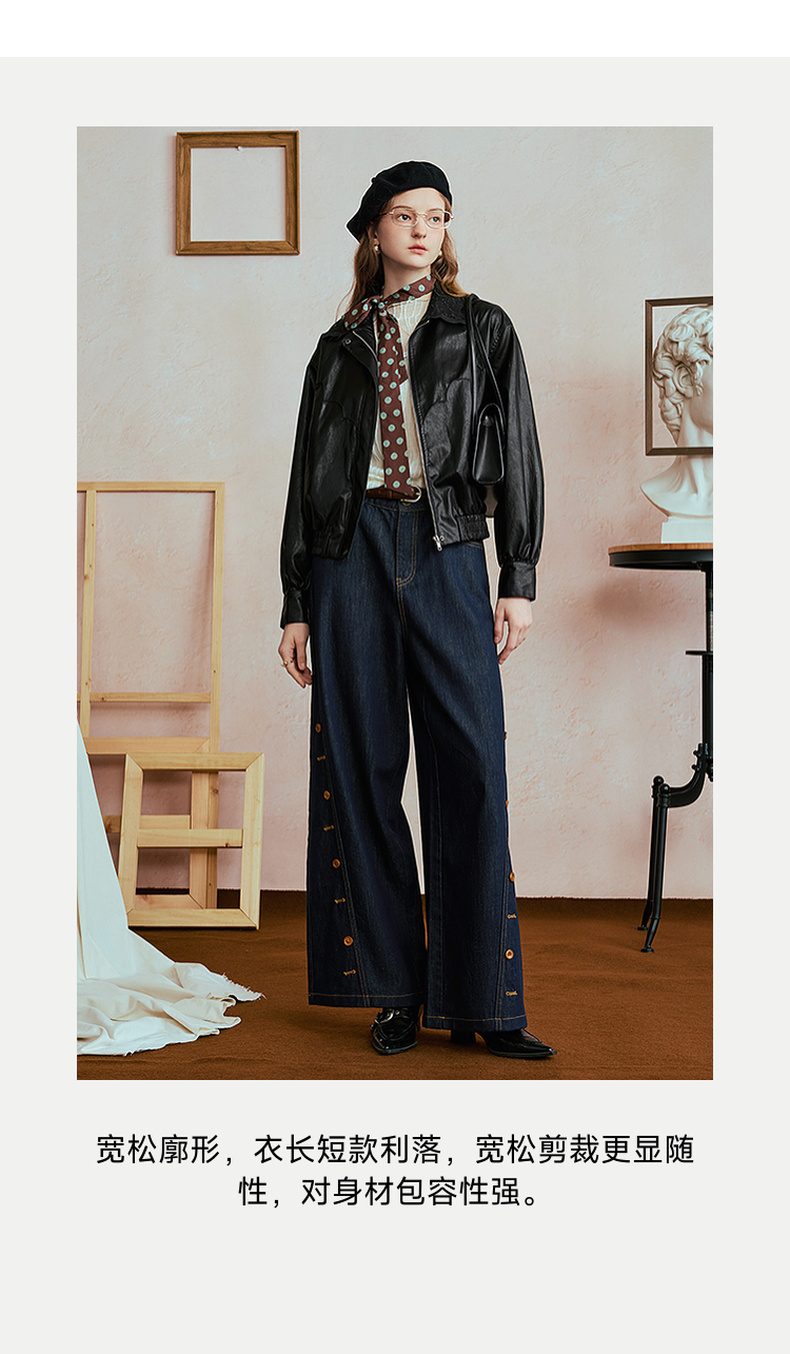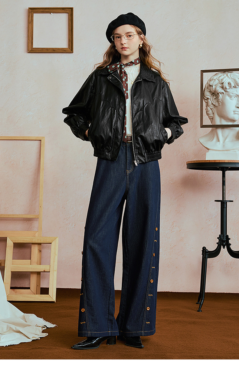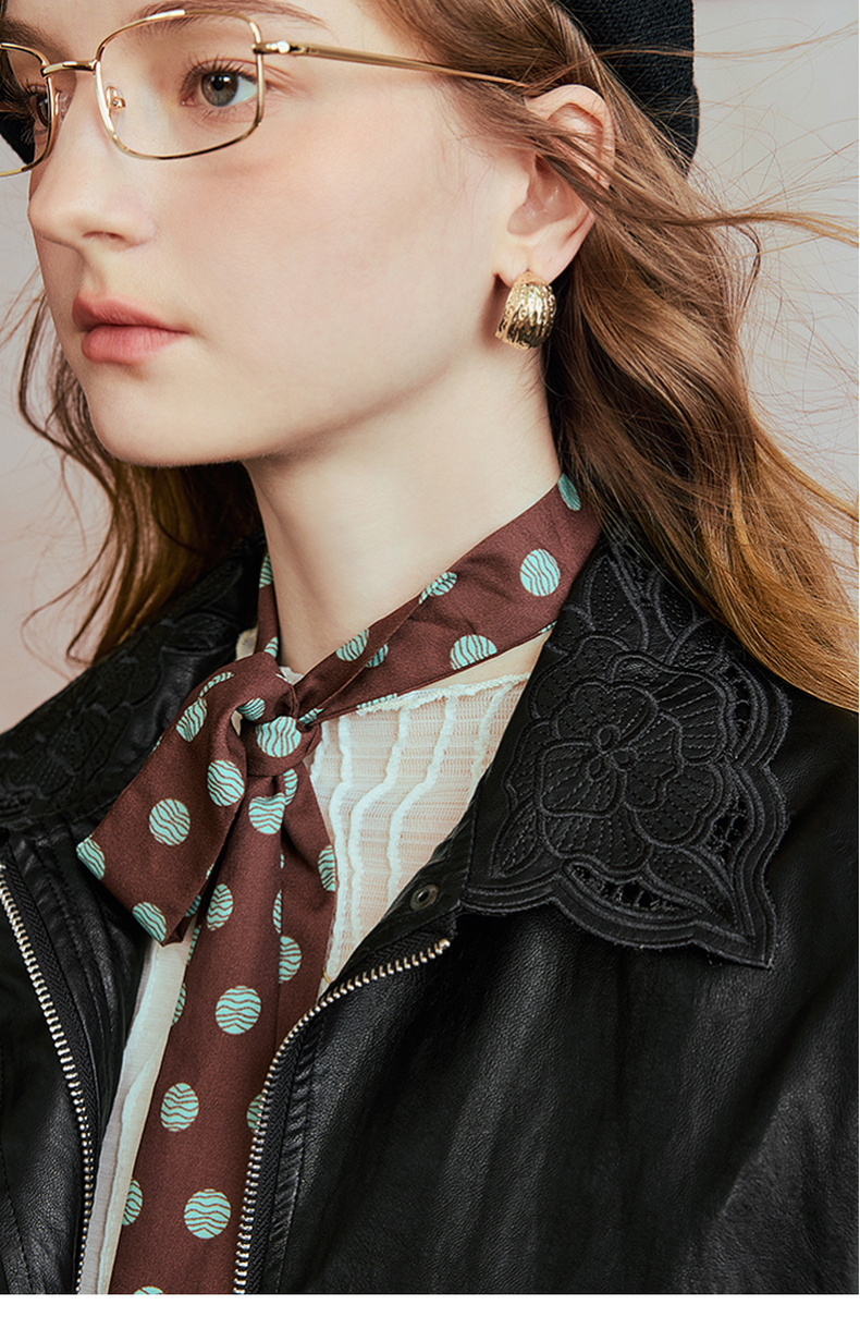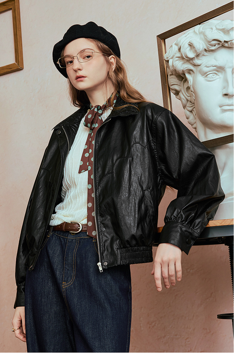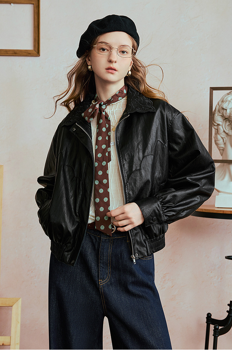 两三事暗夜荣耀2025秋季新款复古镂空花纹翻领短款皮衣外套女宽松