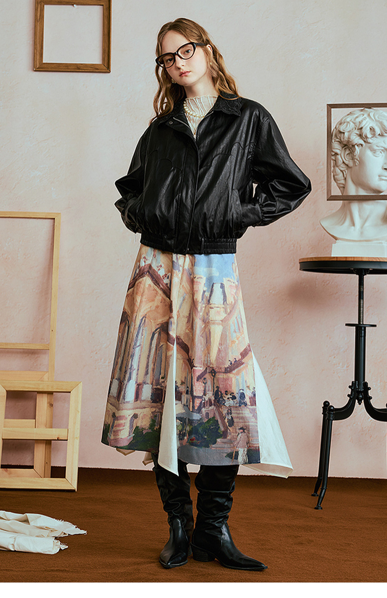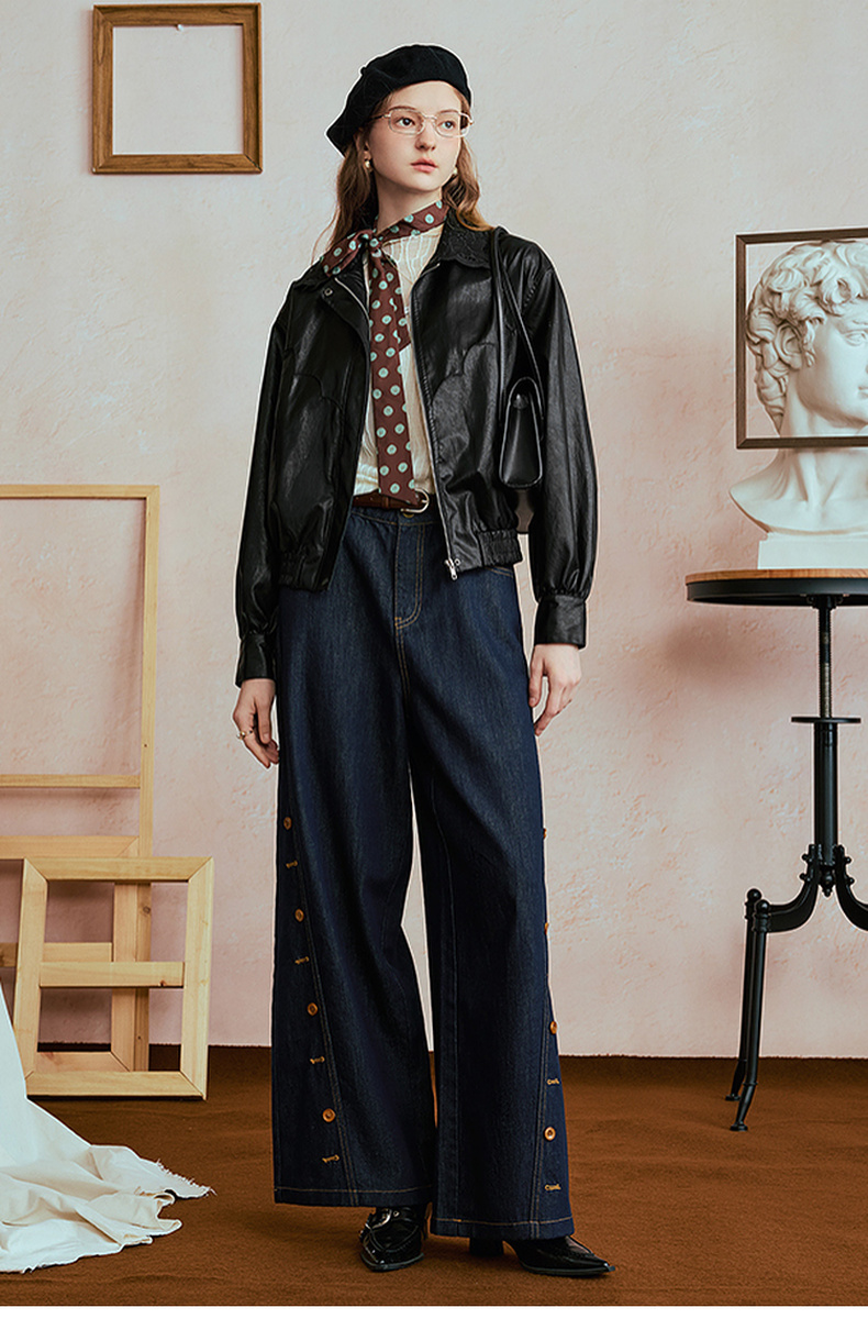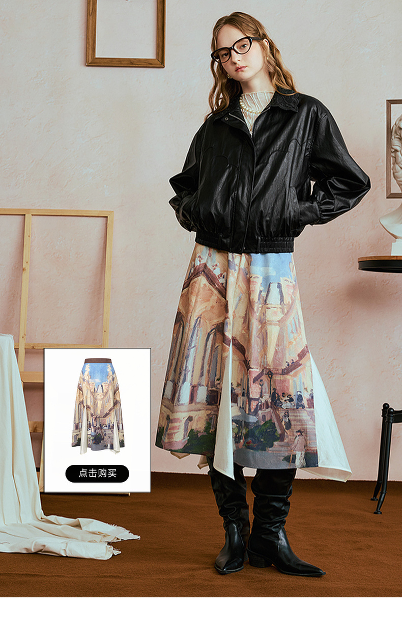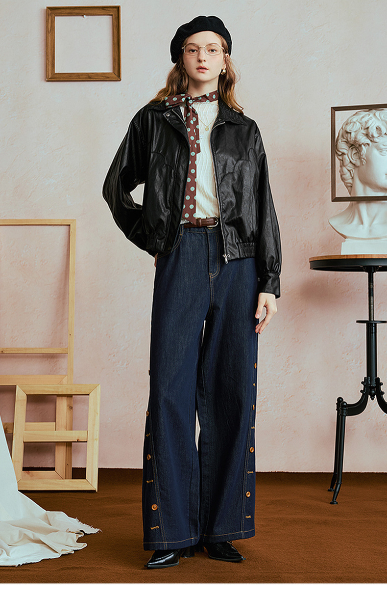两三事暗夜荣耀2025秋季新款复古镂空花纹翻领短款皮衣外套女宽松