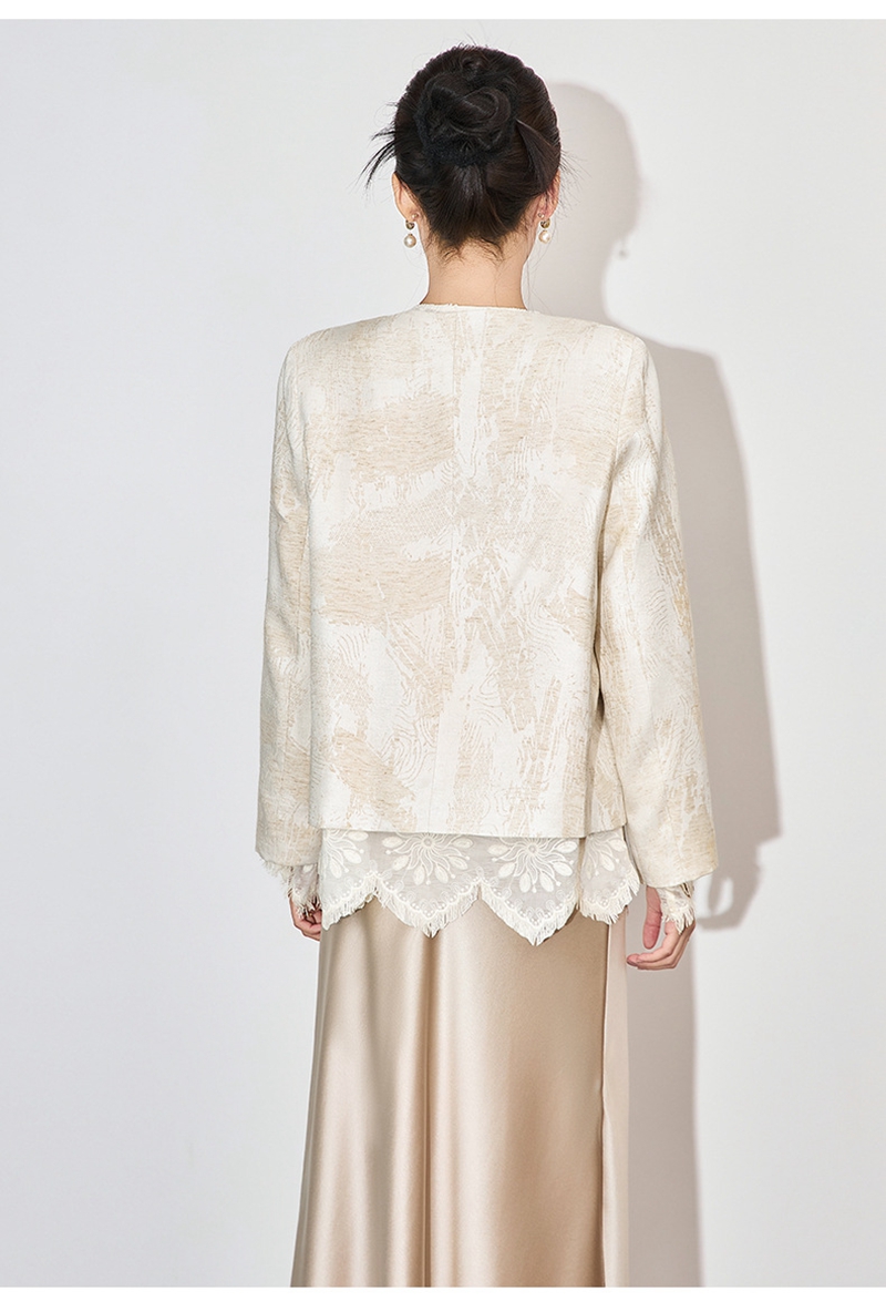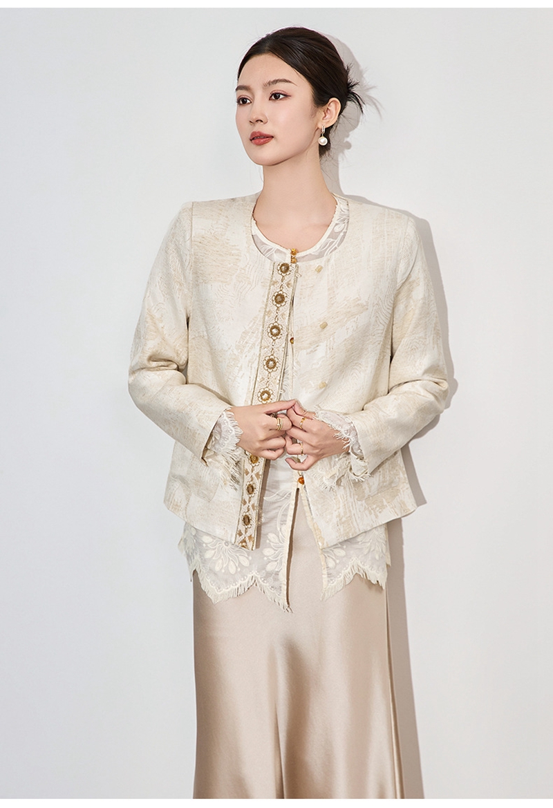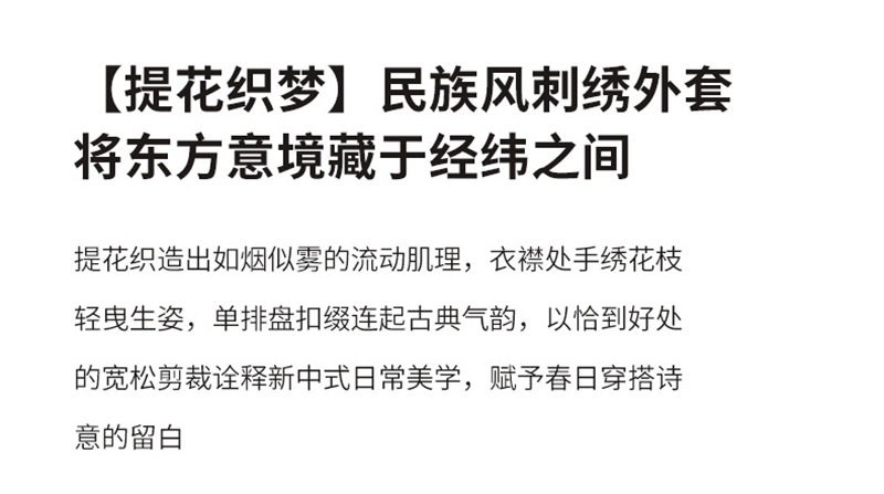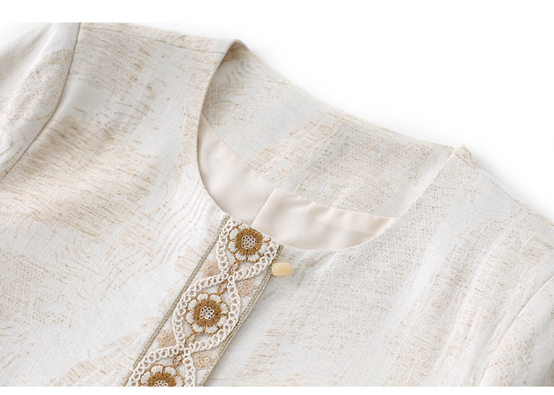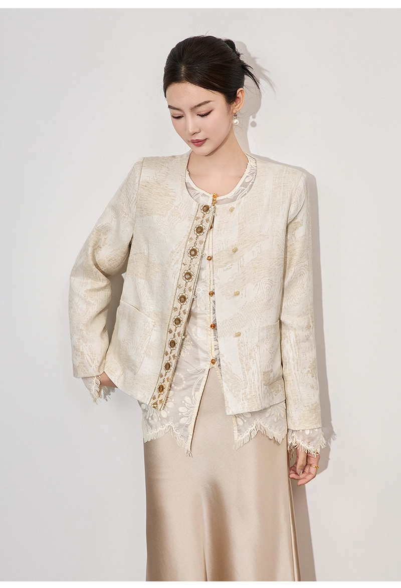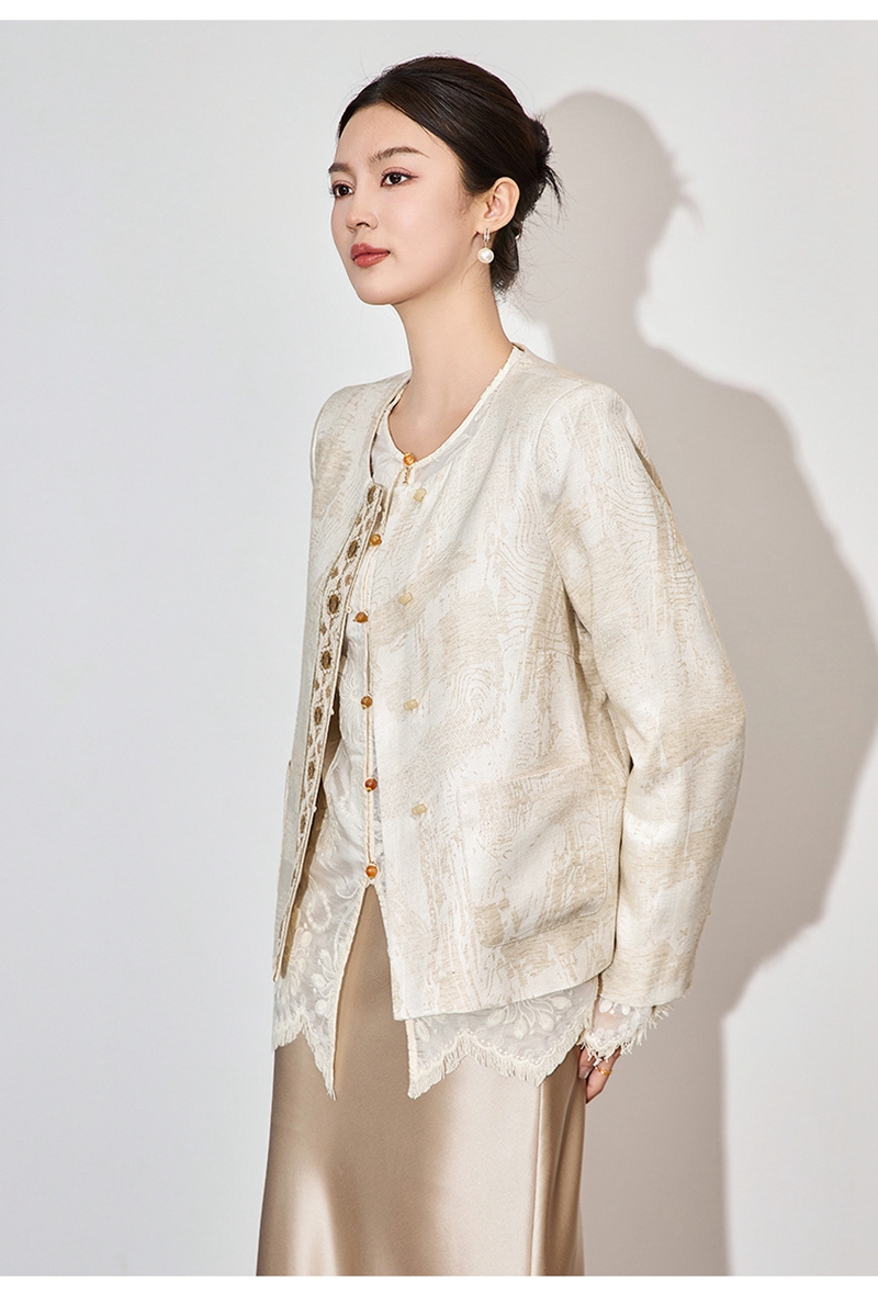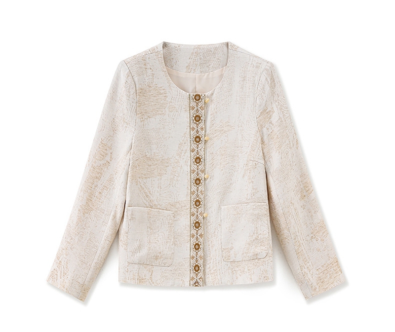 时尚新中式民族风图案提花圆领长袖单排扣丝麻外套