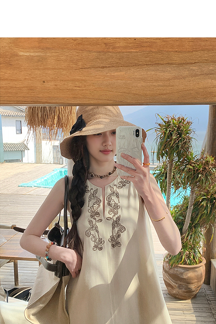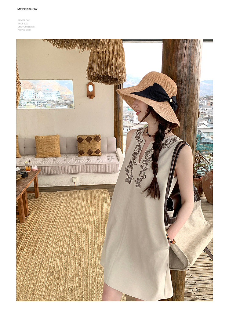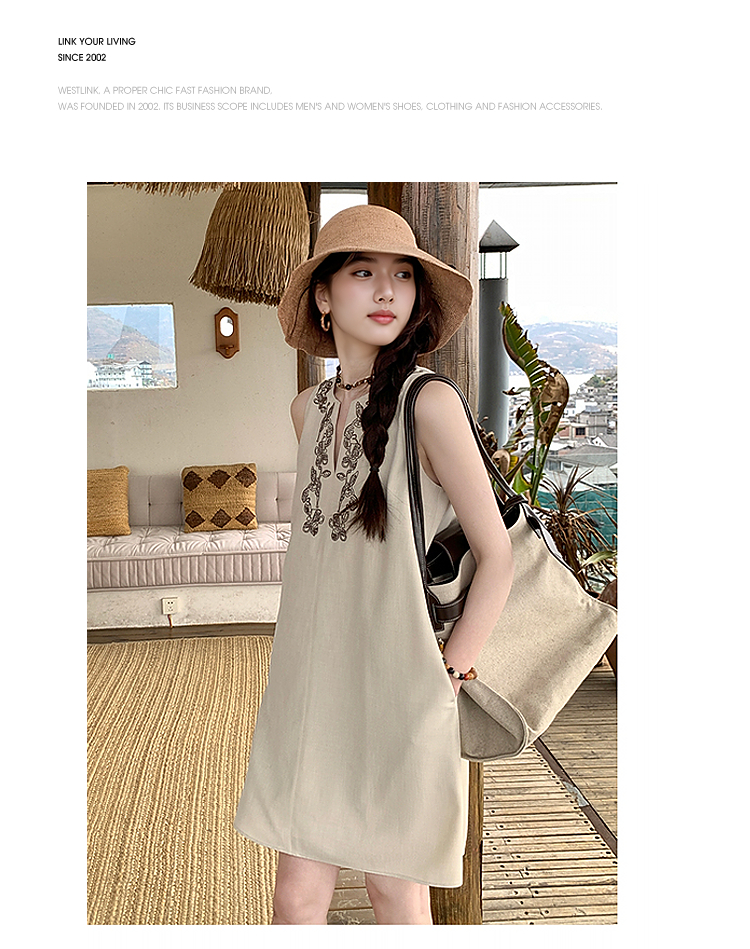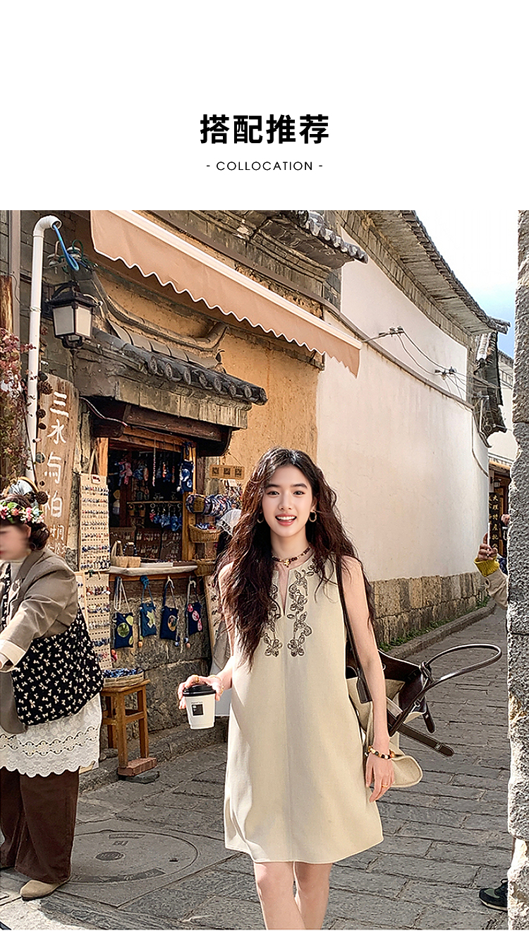 西遇民族风无袖连衣裙女夏季新款杏色云南旅游度假风裙子SS150330
