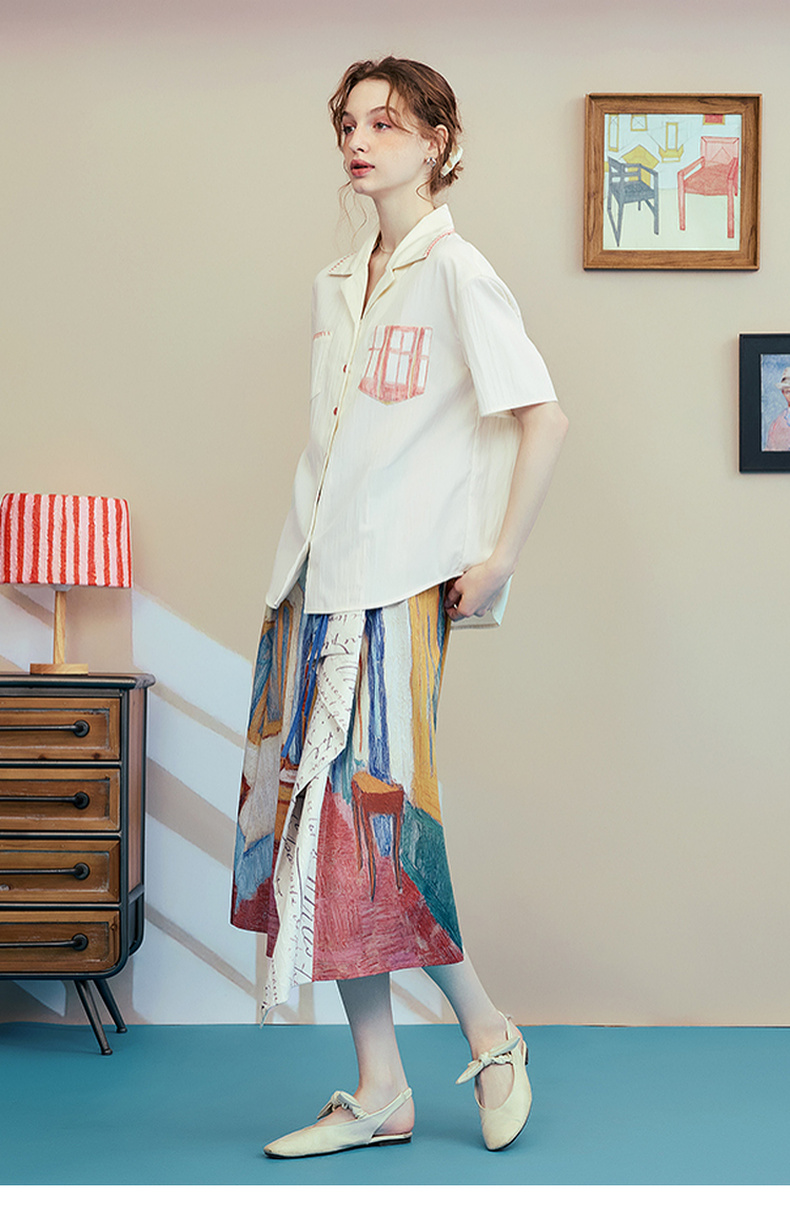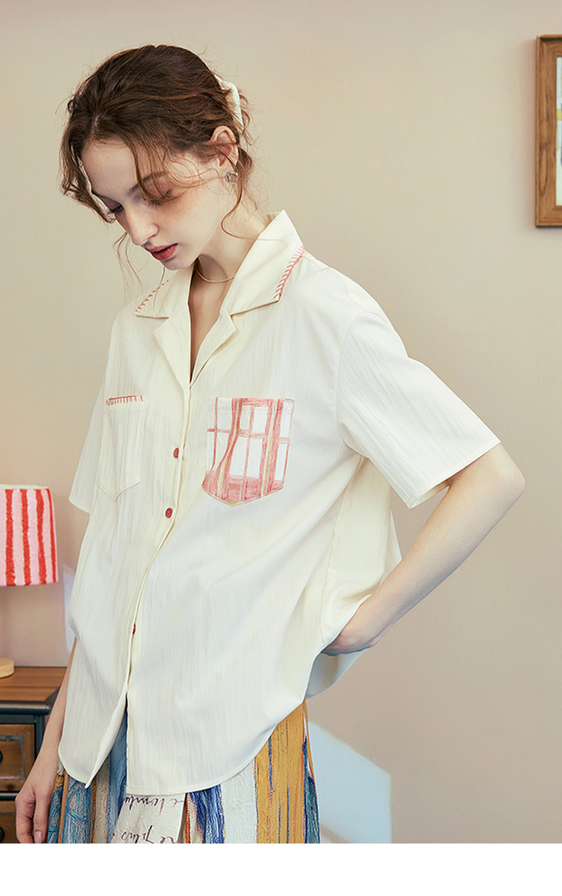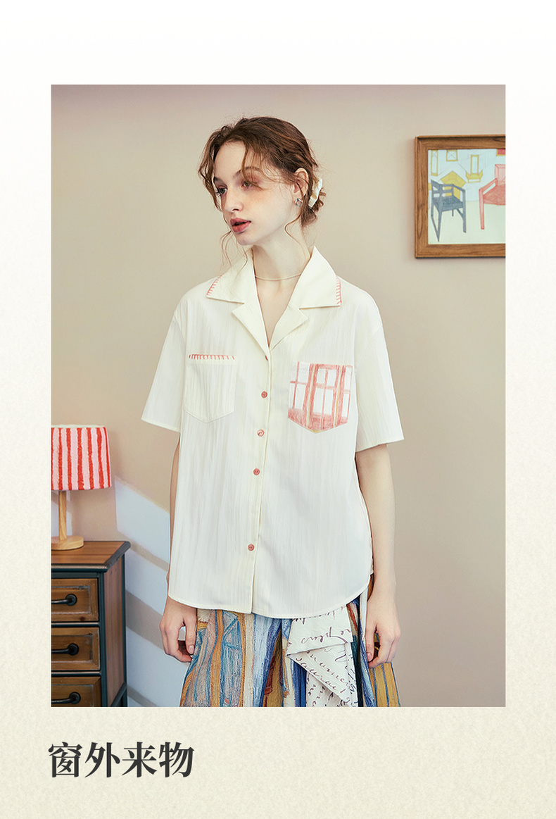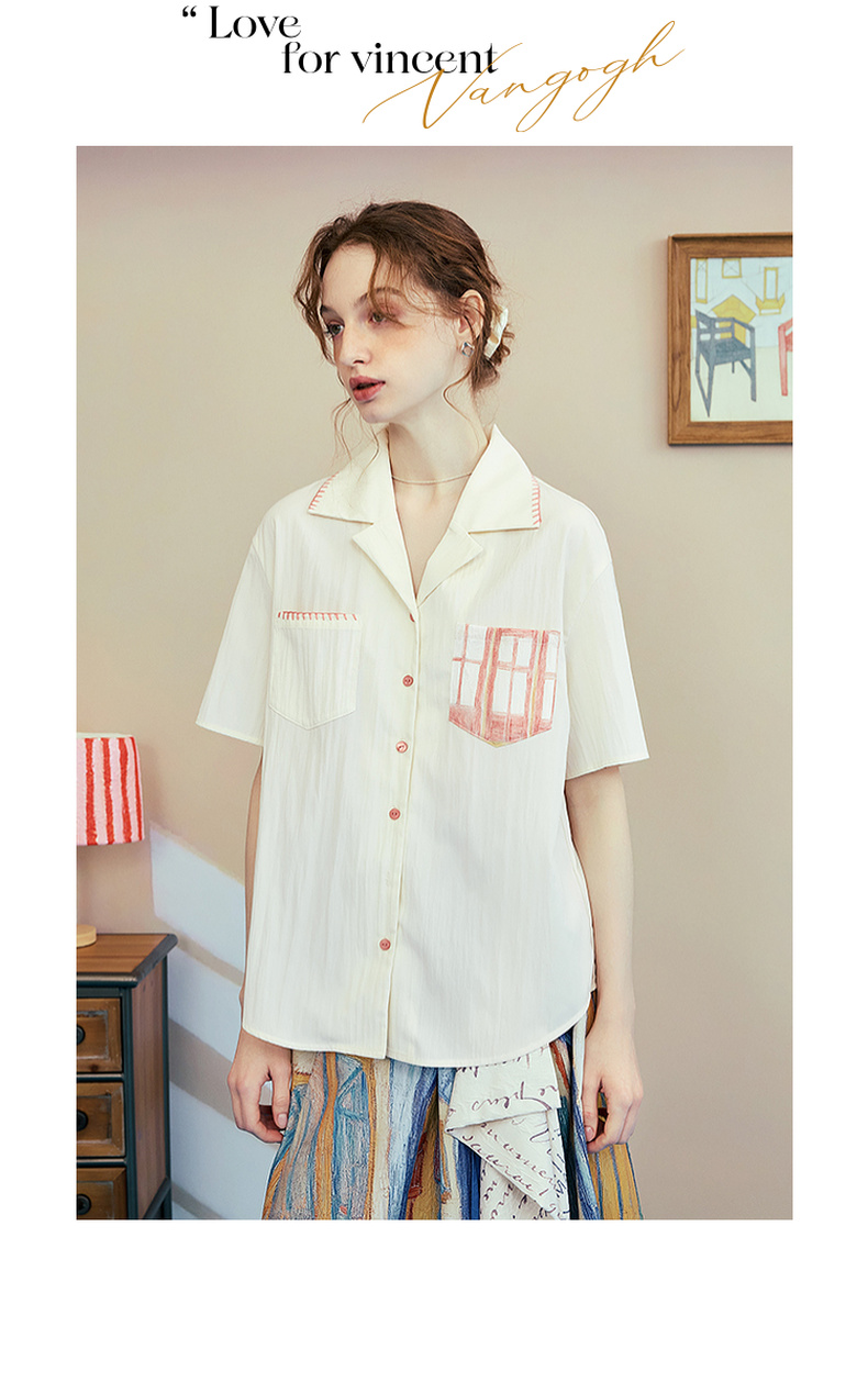两三事梵高文艺 窗外来物 2025夏季新款复古印花口袋翻领衬衫女