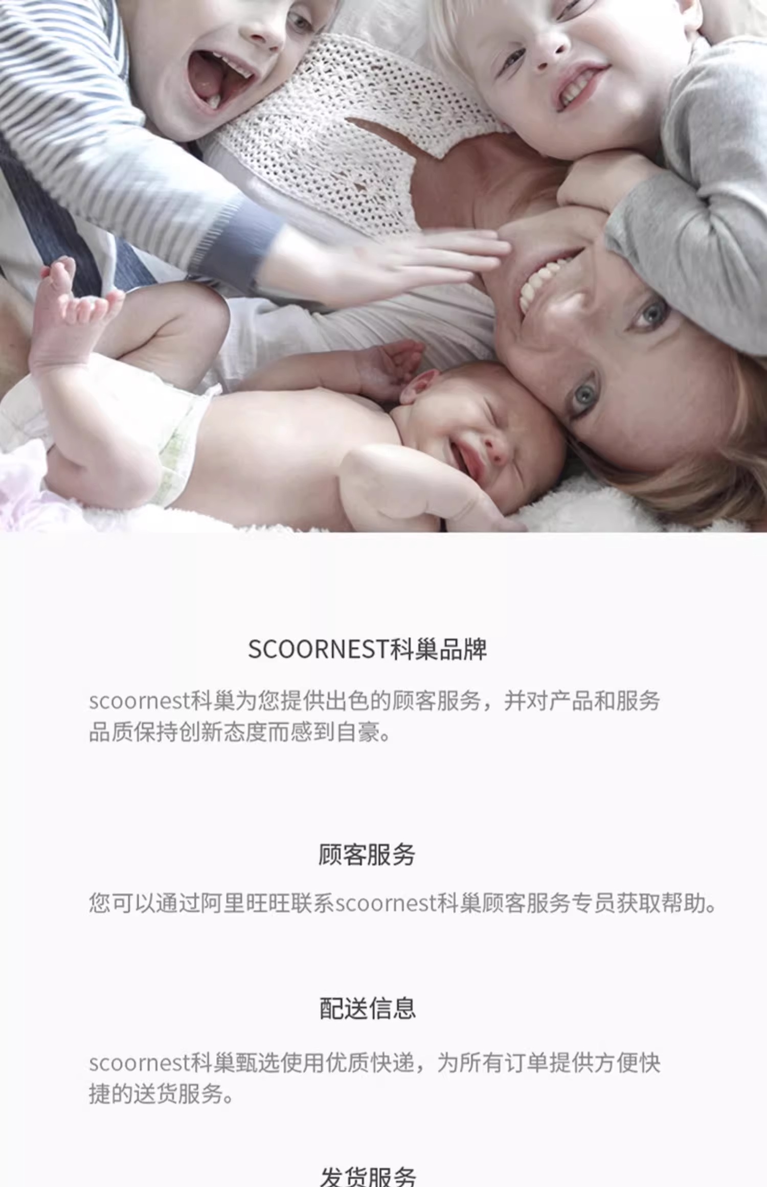 - Scoornest始终秉承给每一位宝宝送去科学的、关心的、创新的成长体验,通过提供商品和服务,使顾客形成守护、发展、巩固这种弥足珍贵的亲情的爱。