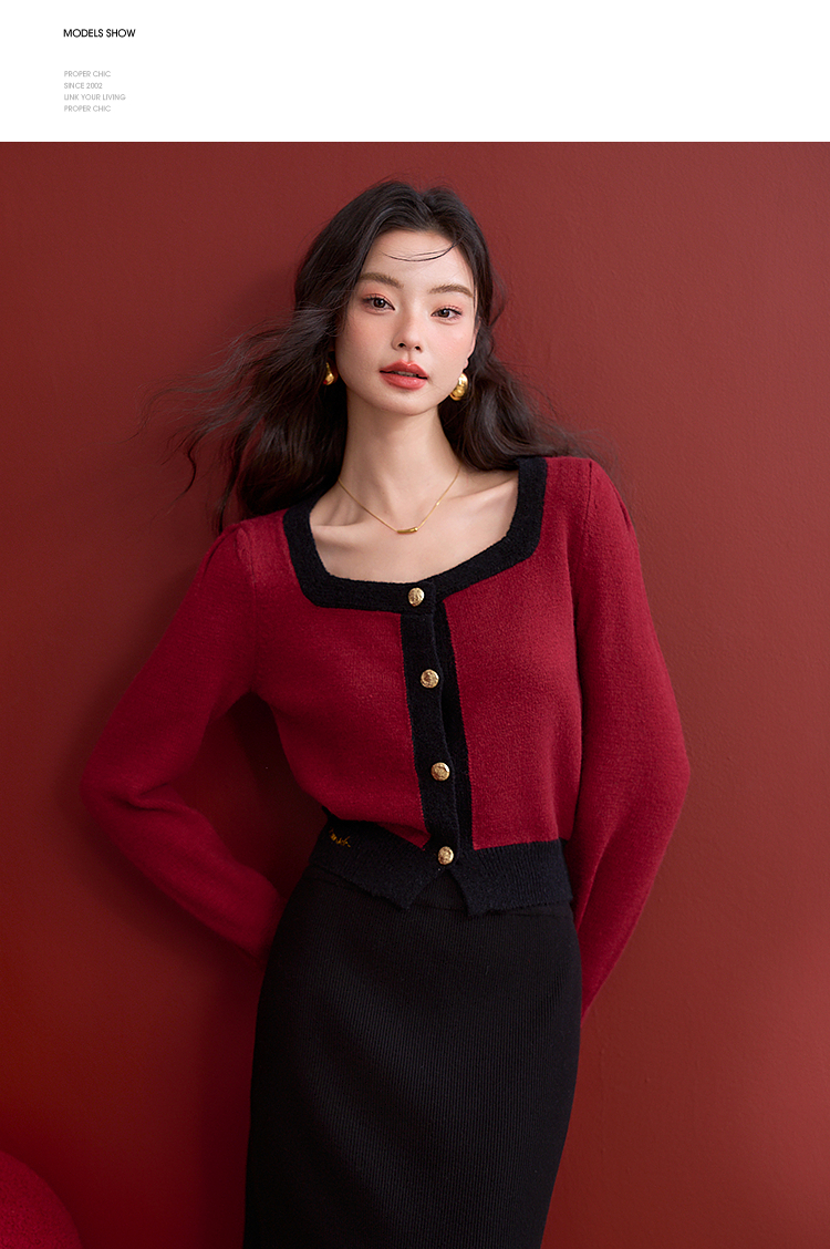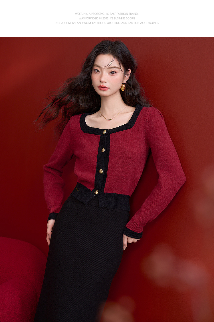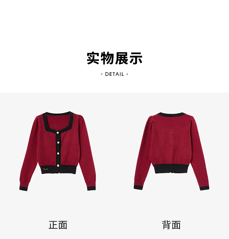 法式复古撞色小香风针织衫女方领高弹软糯内搭上衣V0150001