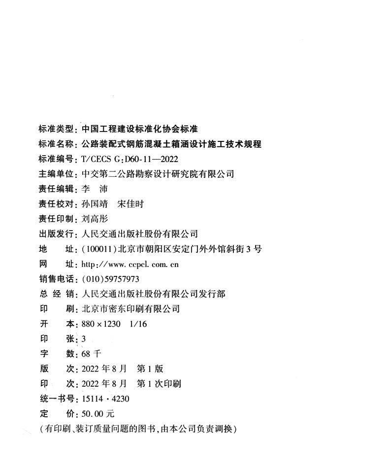 书名:公路装配式钢筋混凝土箱涵设计施工技术规程(T/CECS G:D60-11—2022)