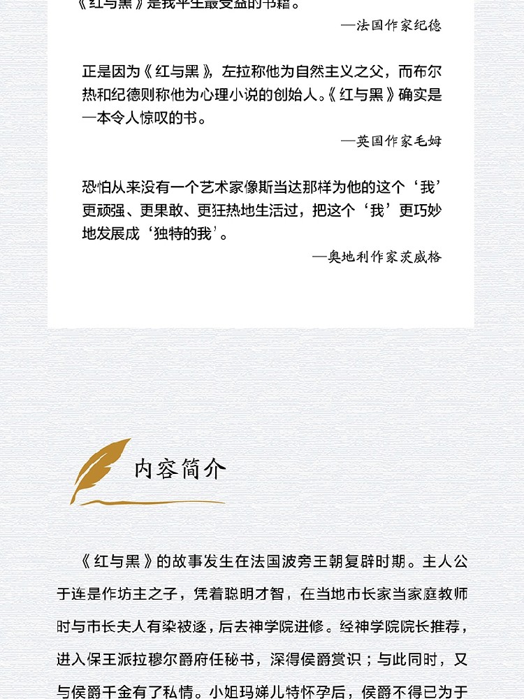 正是因为《红与黑》,左拉称他为自然主义之父,而布尔热和纪德则称他为心理小说的创始人。《红与黑》确实是一本令人惊叹的书。