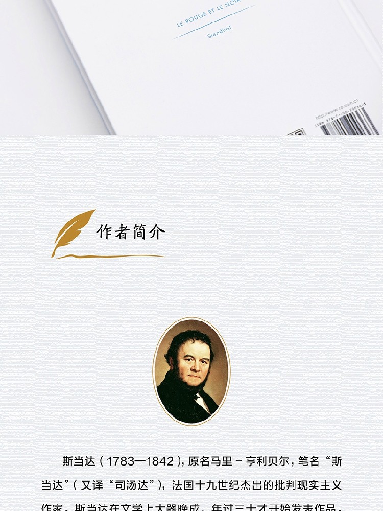 斯当达(1783—1842),原名马里-亨利贝尔,笔名“斯当达”(又译“司汤达”),法国十九世纪杰出的批判现实主义作家。斯当达在文学上大器晚成,年过三十才开始发表作品。然而,他却给世界文学留下了丰厚的遗产。他以准确的人物心理分析和凝练的笔法而闻名,被誉为批判现实主义的奠基人。其墓志铭上刻着:活过、爱过、写过。代表作有《阿尔芒斯》《红与黑》《巴马修道院》等。