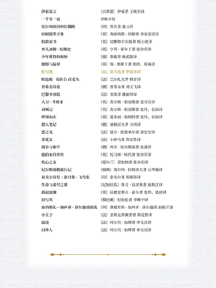 第一辑30种:《伊索寓言》《一千零一夜》《托尔梅斯河的拉撒路》《培根随笔全集》《伯爵家书》《弃儿汤姆•琼斯史》《少年维特的烦恼》《傲慢与偏见》《红与黑》《欧也妮•葛朗台 高老头》《普希金诗选》《巴黎圣母院》《大卫•考坡菲》《双城记》《呼啸山庄》《猎人笔记》《恶之花》《茶花女》《战争与和平》《德伯家的苔丝》《伤心之家》《尼尔斯骑鹅旅行记》《泰戈尔诗集:新月集•飞鸟集》《生命与希望之歌》《孤寂深渊》《泪与笑》《血的婚礼:加西亚•洛尔迦戏剧选》《小王子》《鼠疫》《局外人》。