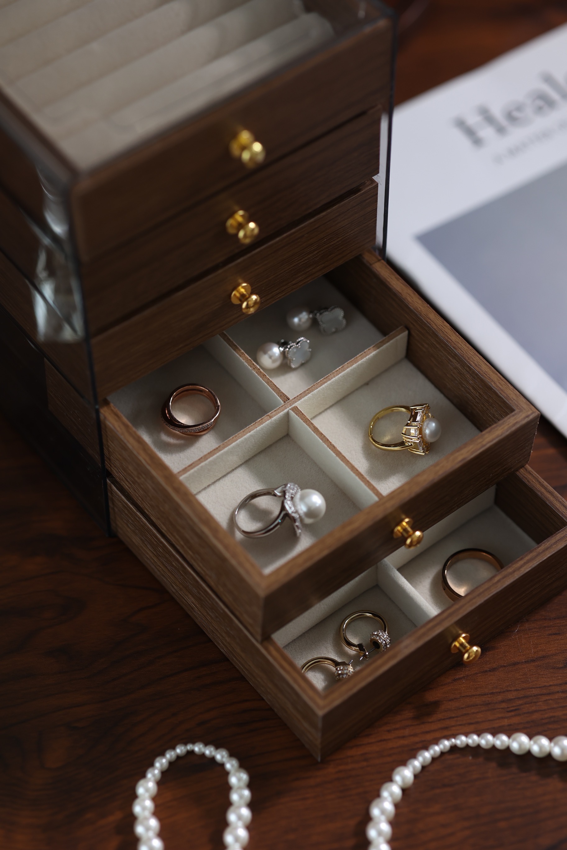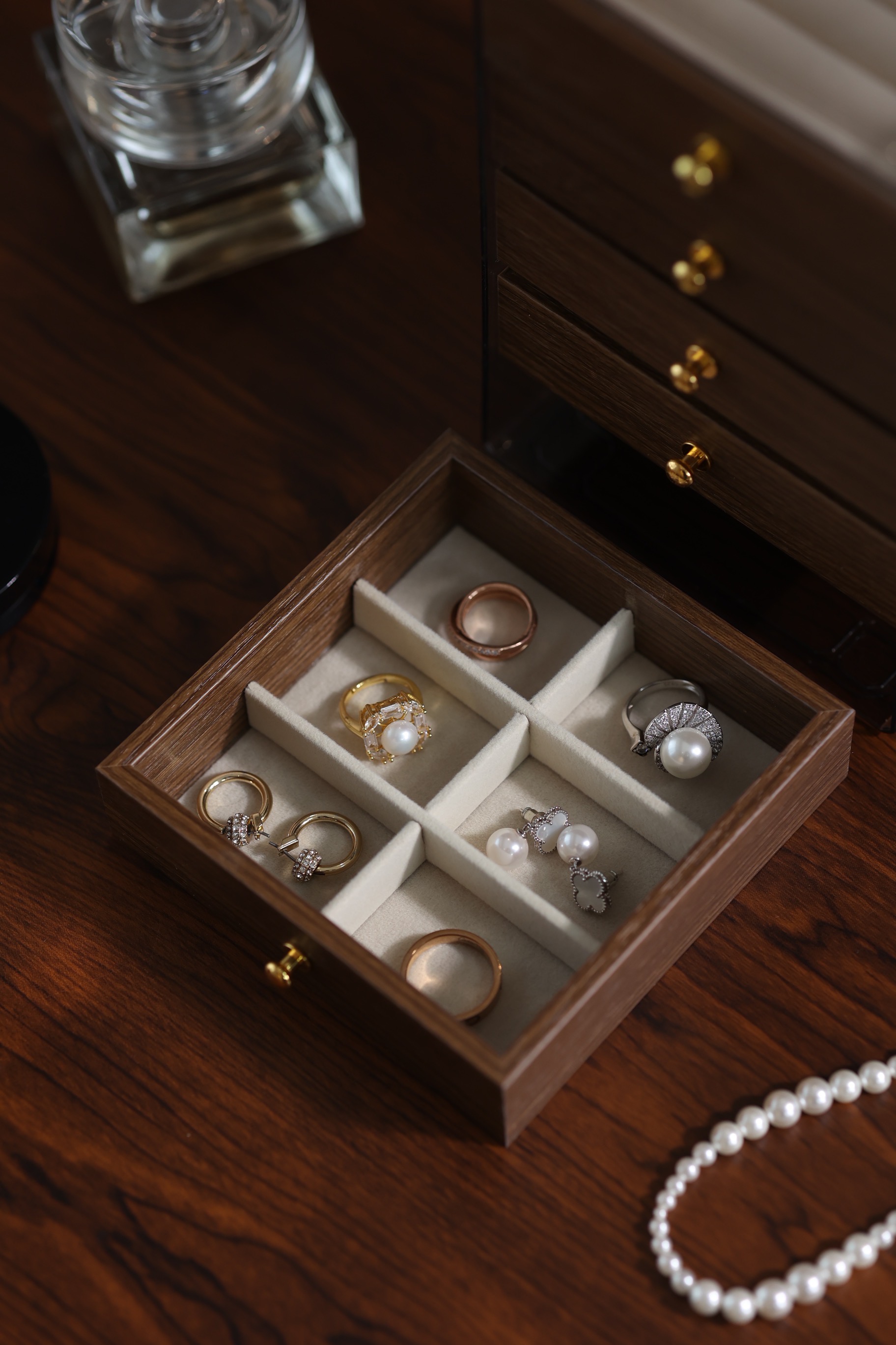 近期常用的配饰按戒指、项链、耳环、手链放在收纳盒里
