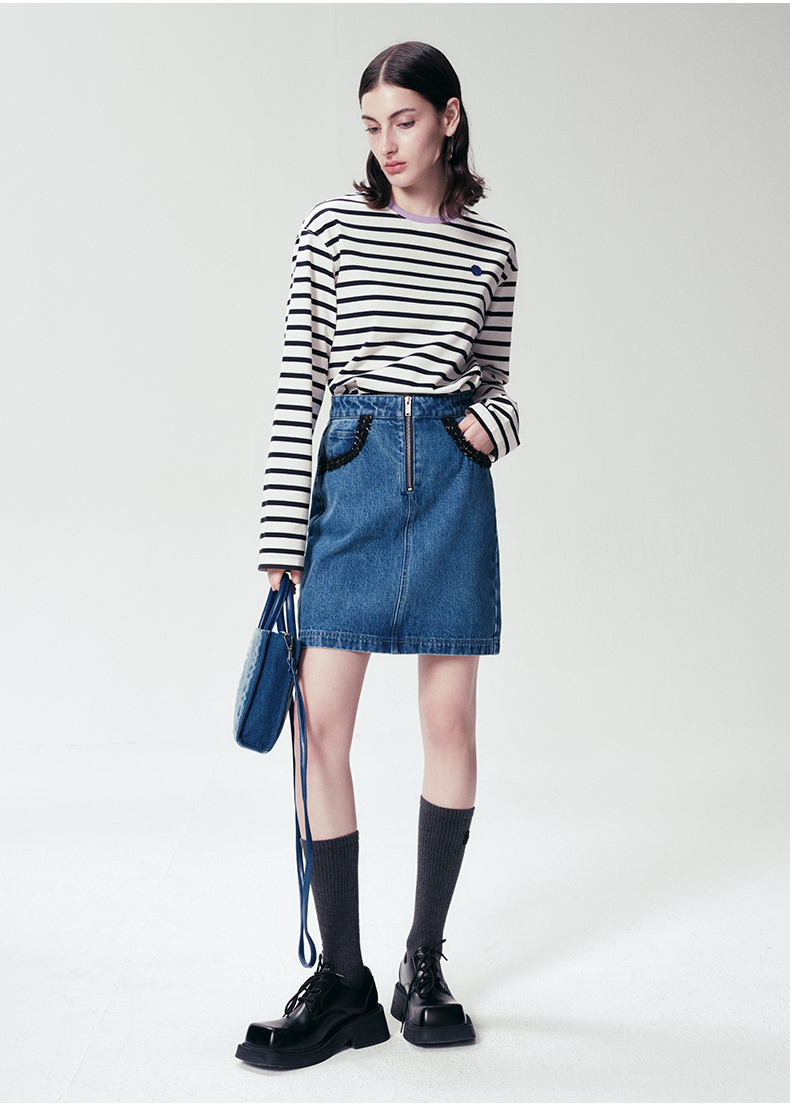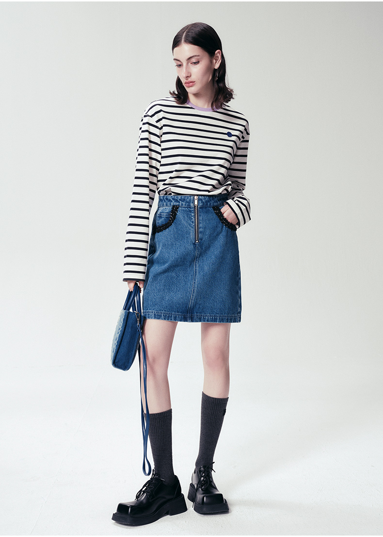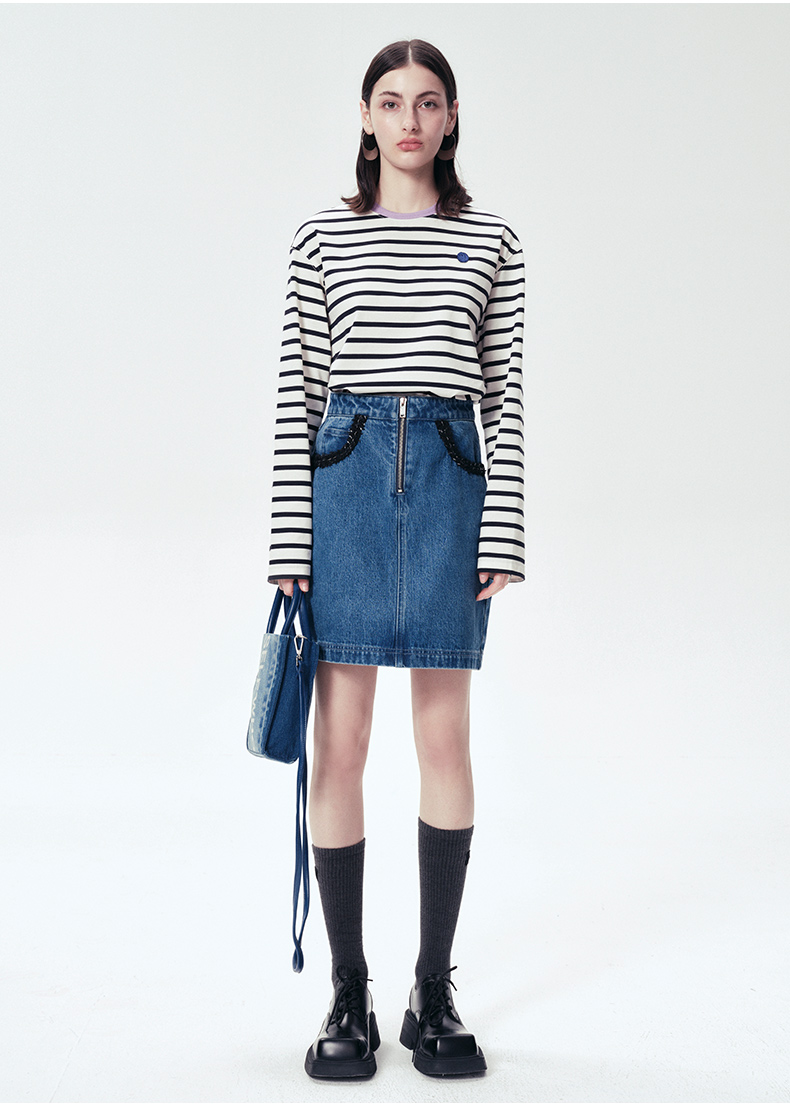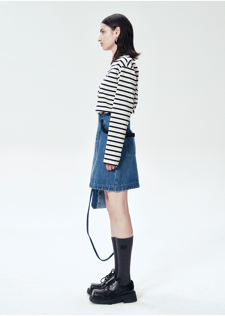 Self Who100%棉蓝色牛仔半裙女2024春新款设计感收腰显瘦a字短裙