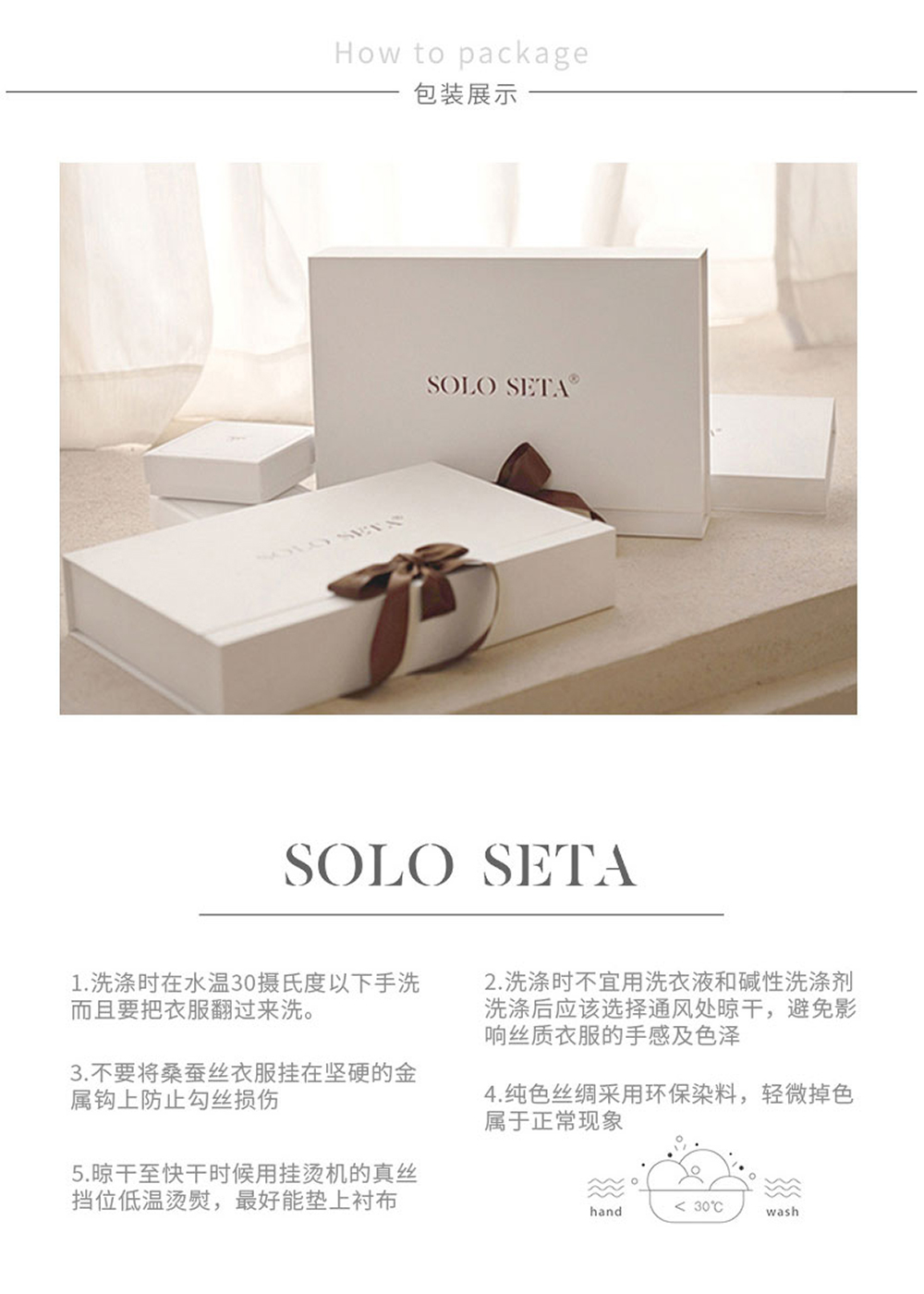 - soloseta专注于真丝织物,灵感源自意大利语,中文含义为“只做真丝”的意思。让睡衣变时尚,居家和外出瞬间切换,使其更具有出街,度假,参加宴会等功能。