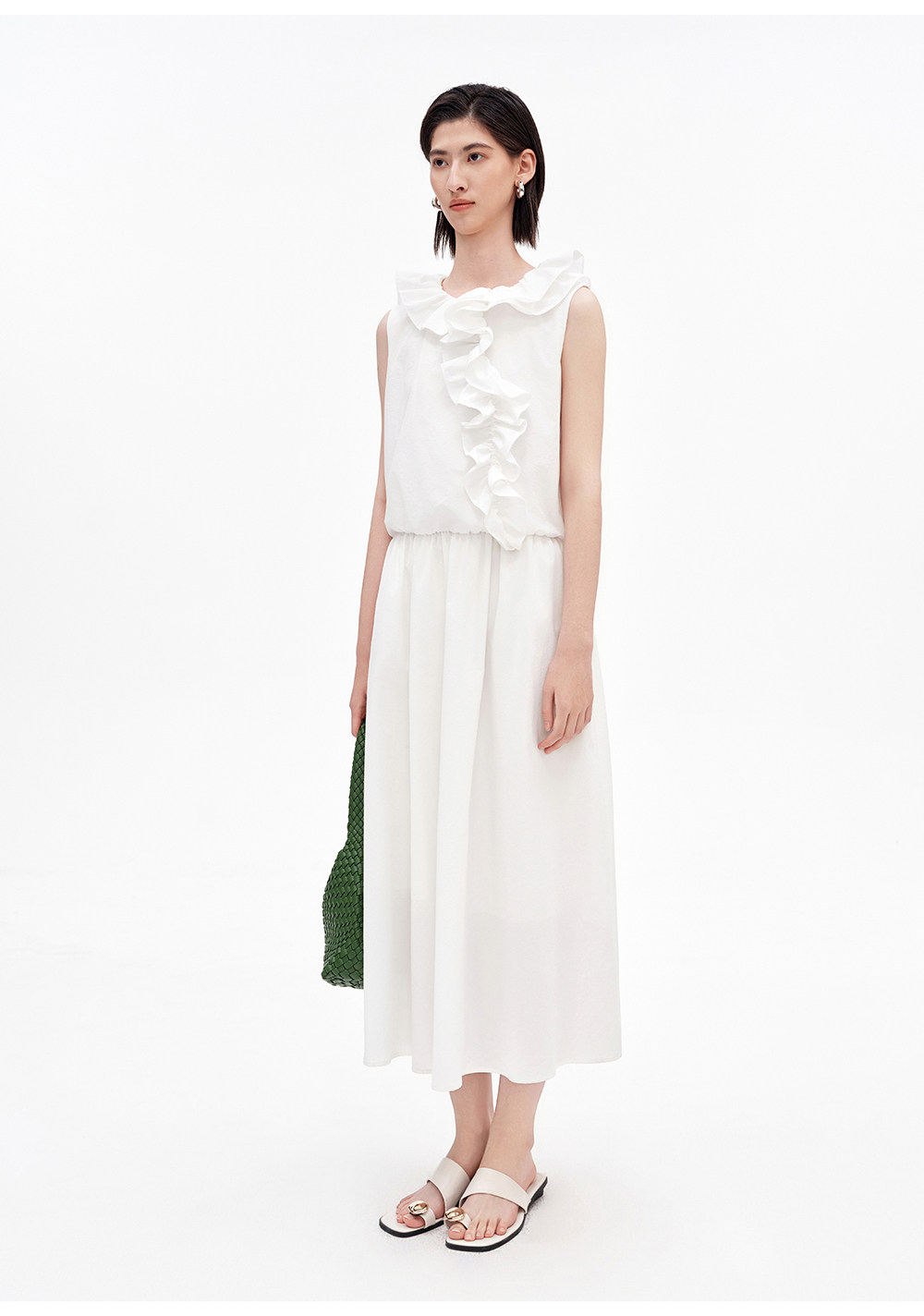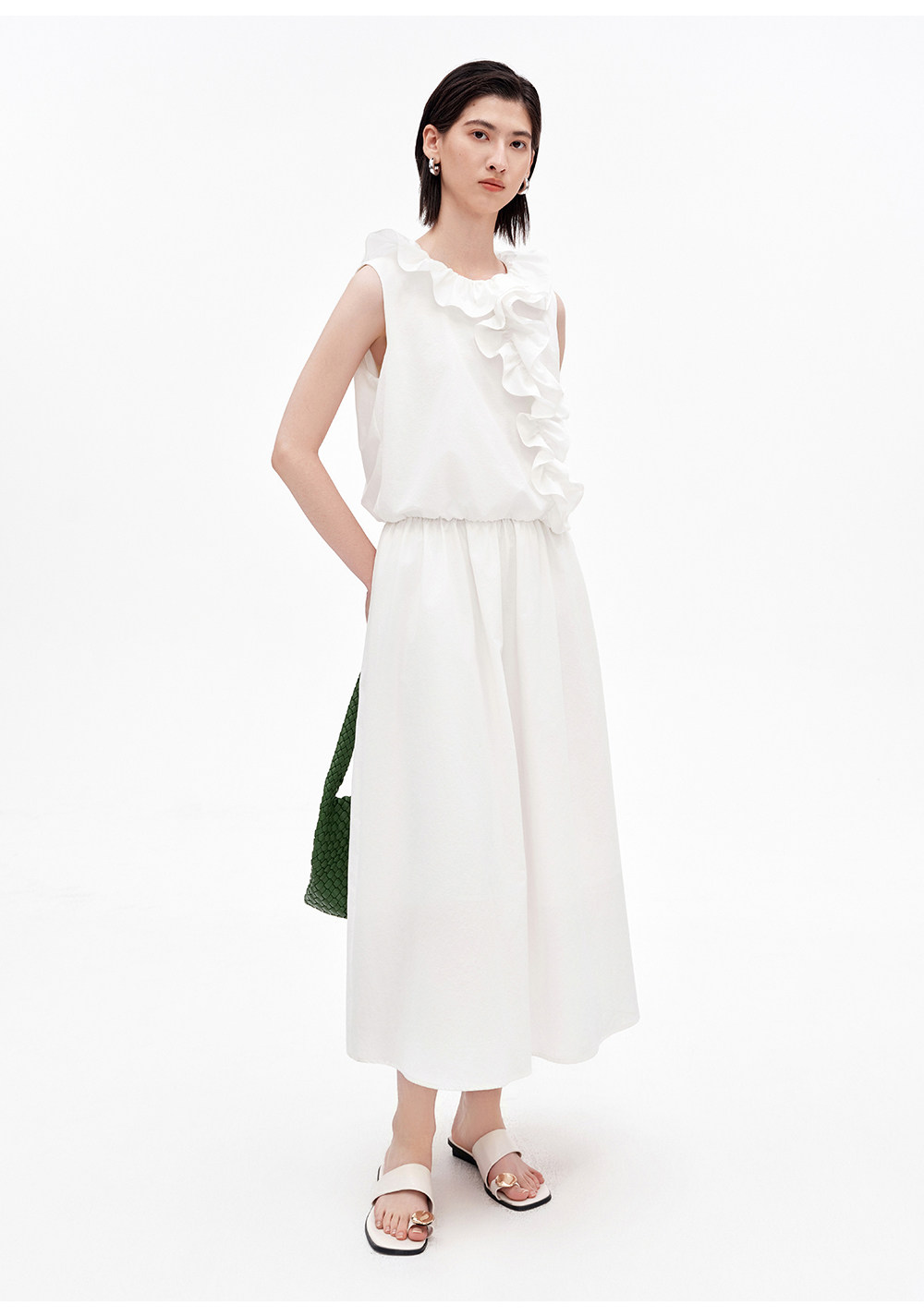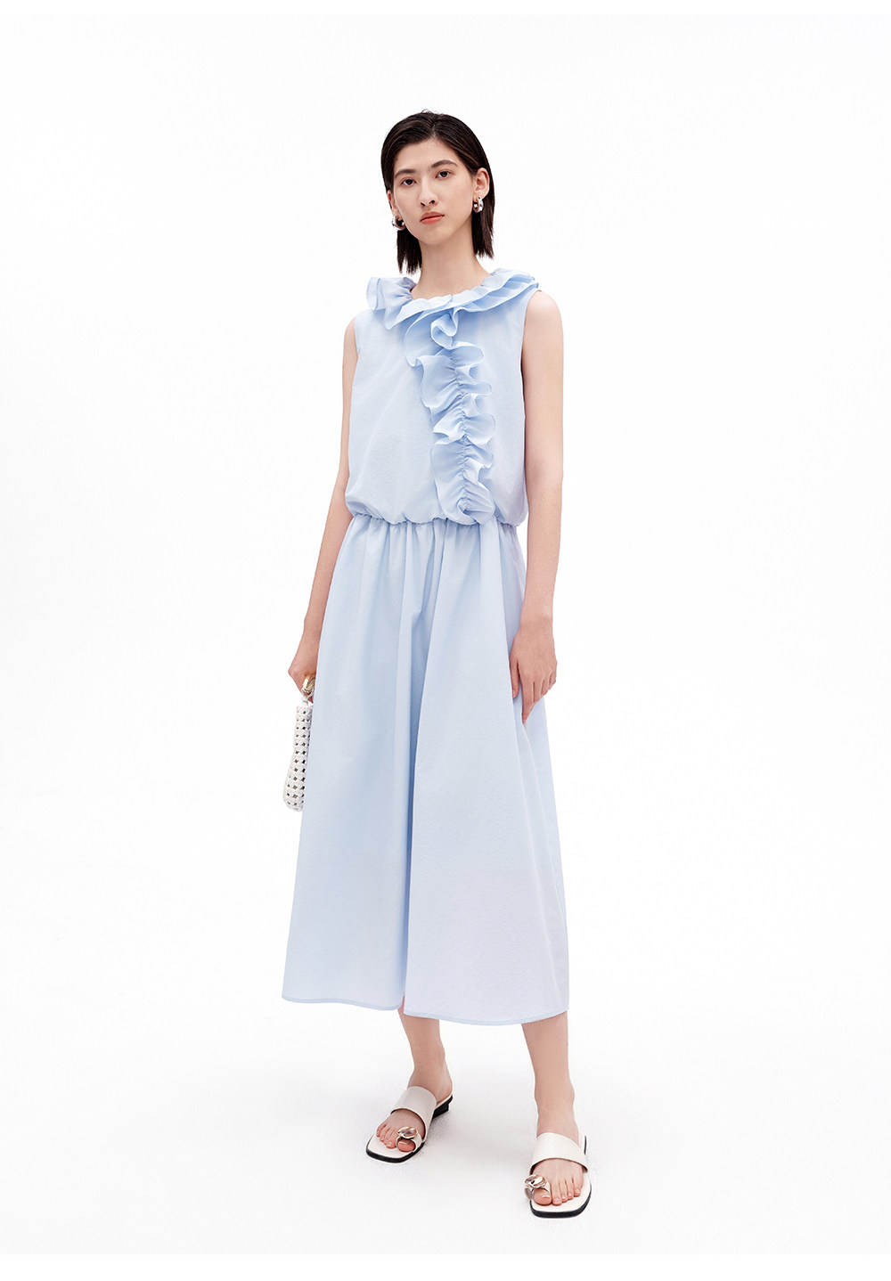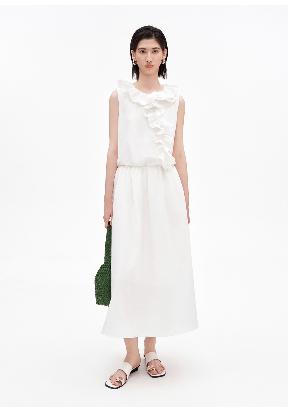 SELFWHO棉混纺双层荷叶边装饰连衣裙女2026夏新款法式优雅无袖裙