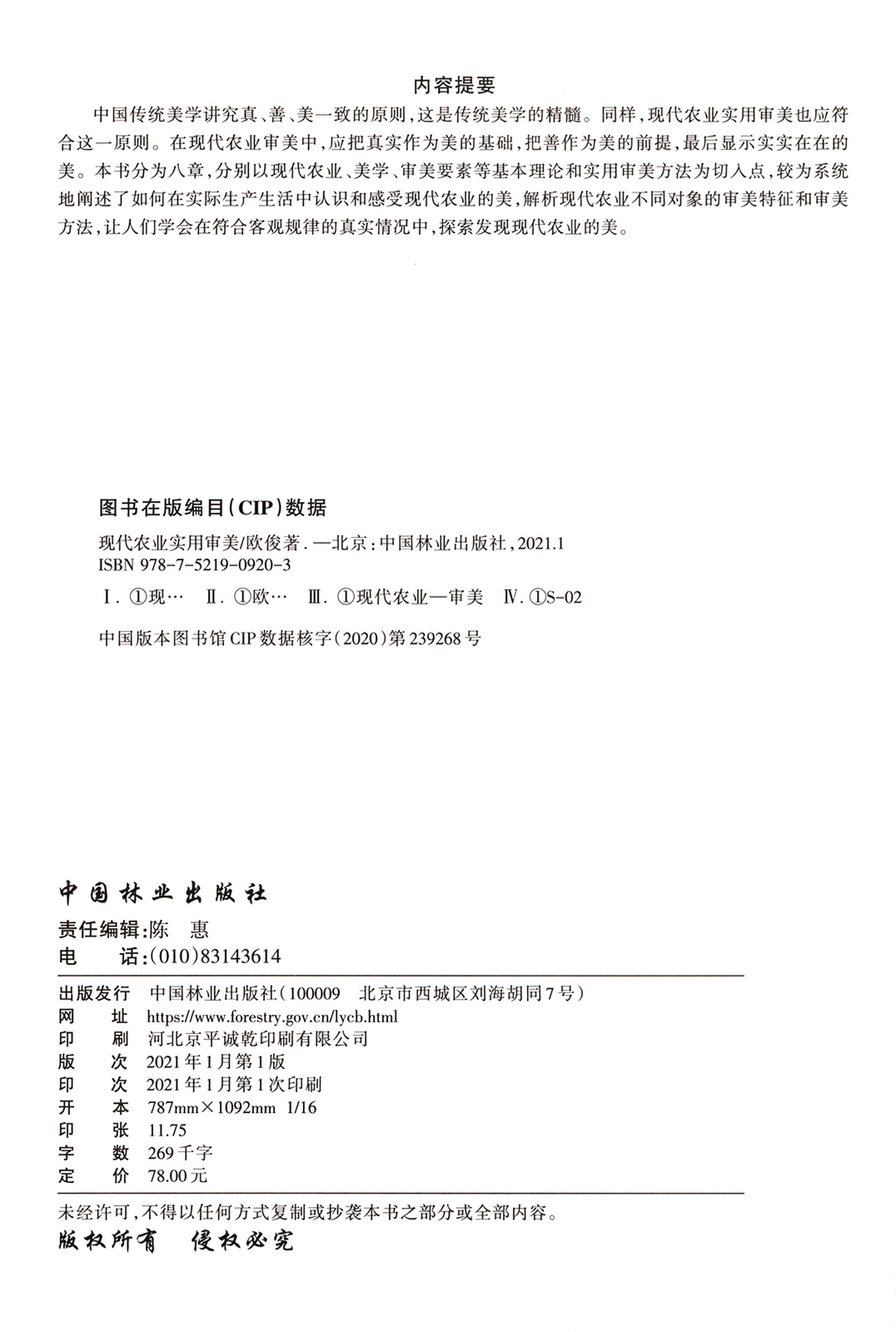 中国传统美学讲究真、善、美一致的原则,这是传统美学的精髓。同样,现代农业实用审美也应符合这一原则。在现代农业审美中,应把真实作为美的基础,把善作为美的前提,最后显示实实在在的美。本书分为八章,分别以现代农业、美学、审美要素等基本理论和实用审美方法为切入点,较为系统地阐述了如何在实际生产生活中认识和感受现代农业的美,解析现代农业不同对象的审美特征和审美方法,让人们学会在符合客观规律的真实情况中,探索发现现代农业的美。