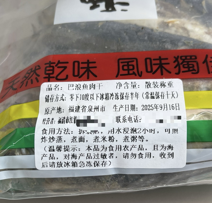【产品名称】巴浪鱼肉干 【克重】 250g/袋 【生产日期】:2025年10月(日期滚动最新) 【保质日期】常温10天,-10℃冷冻保存半年(因产品常温可保存10天,收到货后需发冷冻保存‼️】 【发货地】:福建福州 【快递】圆通 【不发货地区】新疆、西藏、内蒙古、青海、宁夏、甘肃、海南、吉林,黑龙江,内蒙古 【温馨提示⚠️】 收到后有略微发软属于正常,请及时放入冰箱冷冻!介意者勿拍 【拦截费用】:产品发出来不支持拦截❗️ 💗售后处理💗 ✅个人口味问题(不好吃、等)不售后; ✅由于是食品类产品,产品发货后不支持7天无理由退换货 ✅ 因暴力快递造成的外包装瑕疵,轻微碎渣,不影响食用,不在售后范围内 ✅因客户客人原因(实际收件地为不发货区域、地址不详、电话无法接通、未取件放置超时等)导致的产品变质及快递退回不售后!!