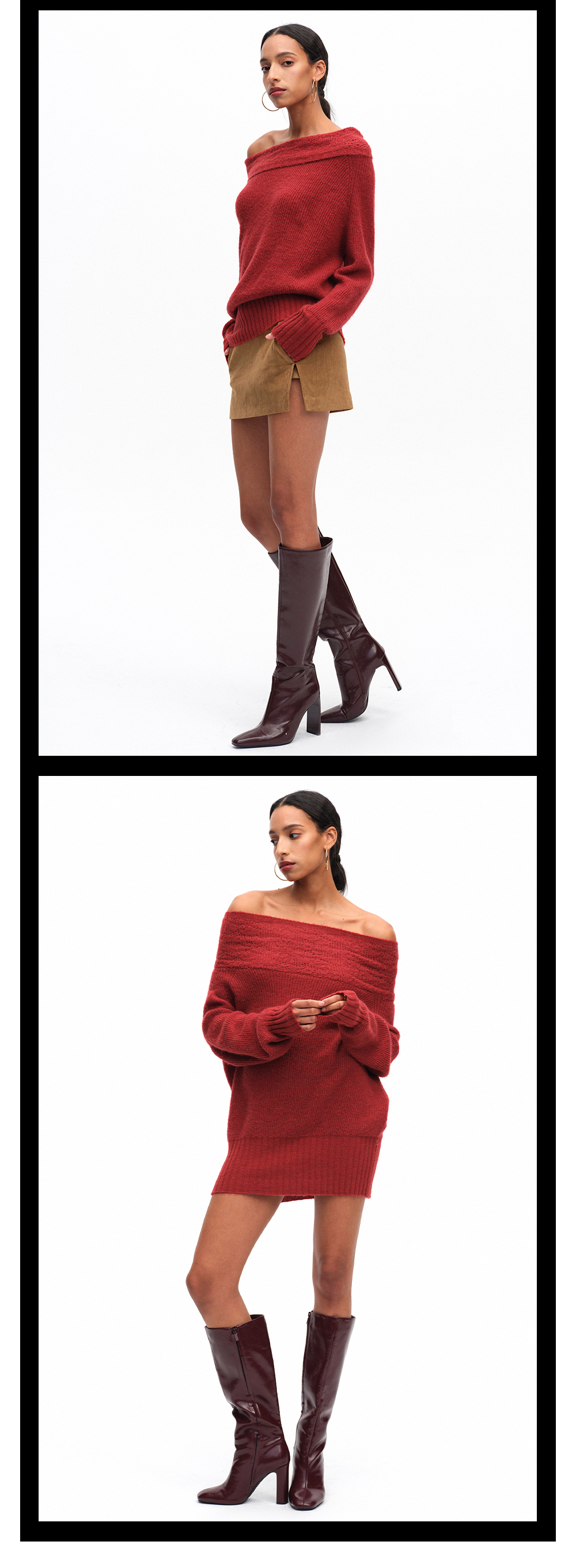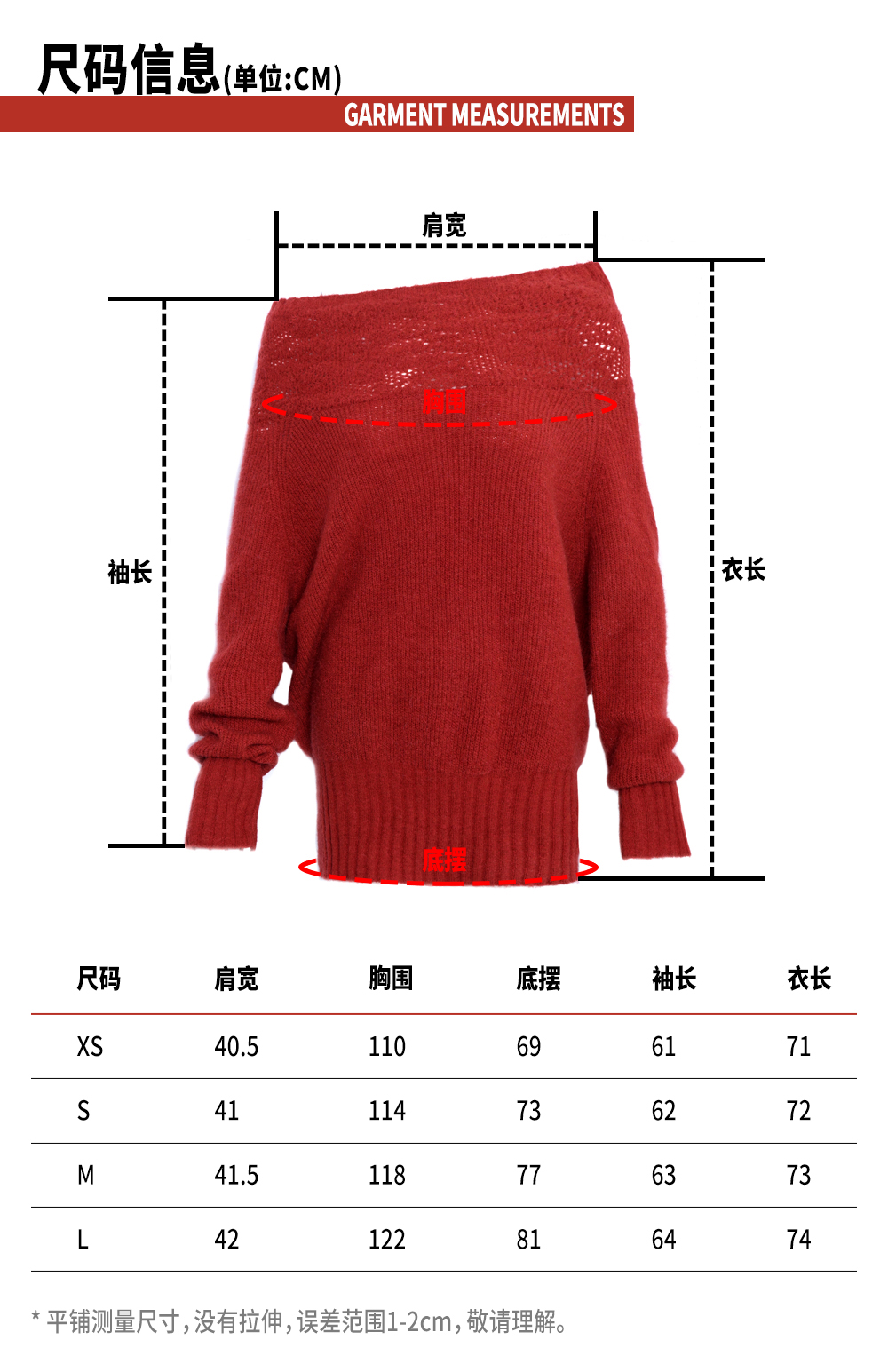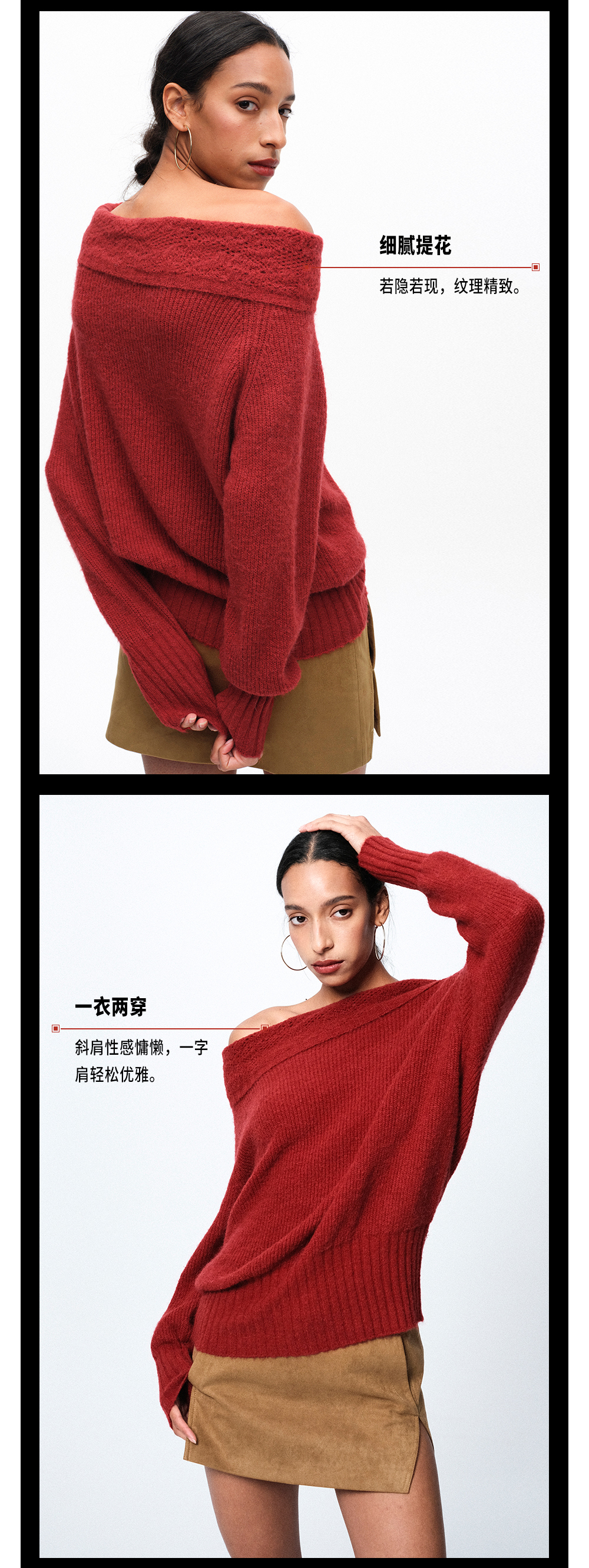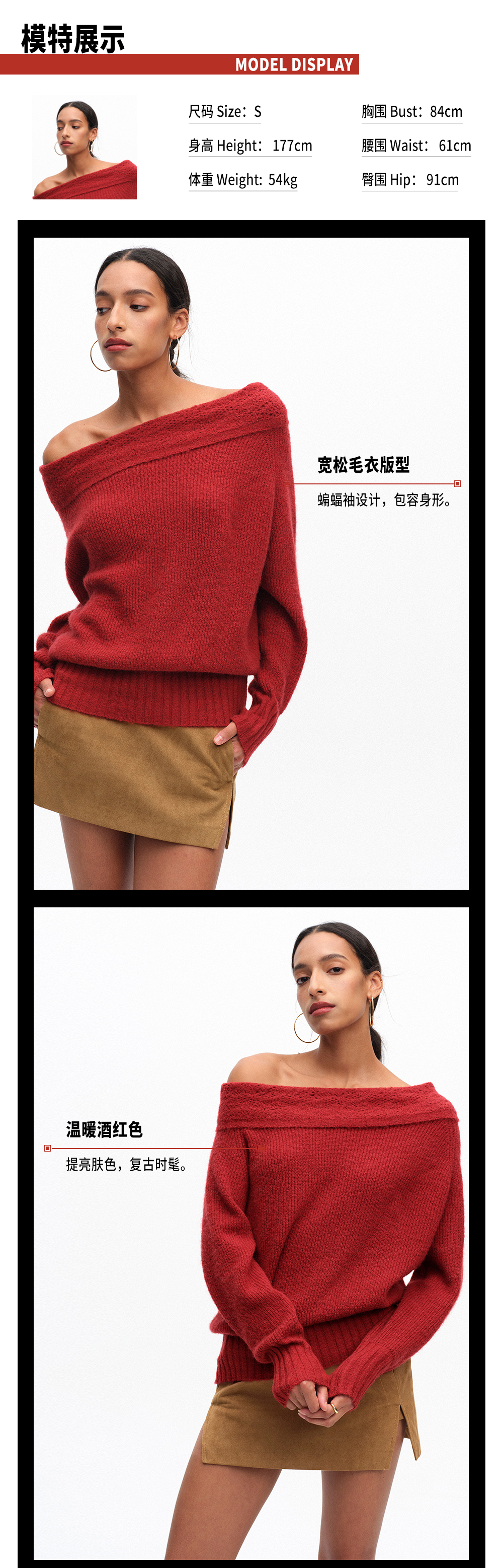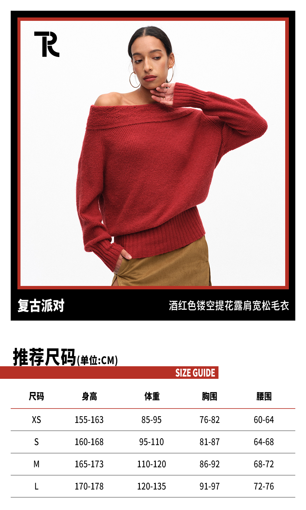 TR她热 复古派对 酒红色羊毛针织提花复古一字肩蝙蝠袖毛衣上衣