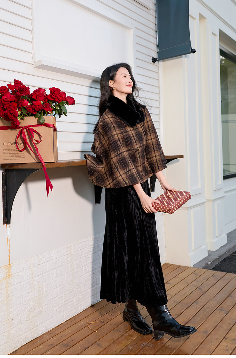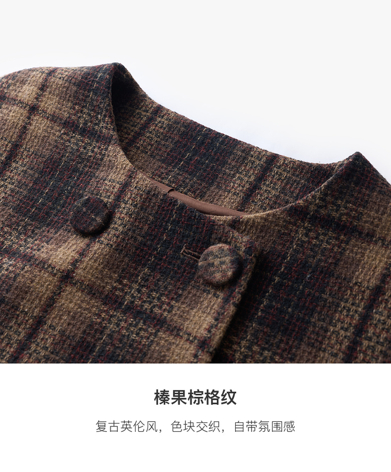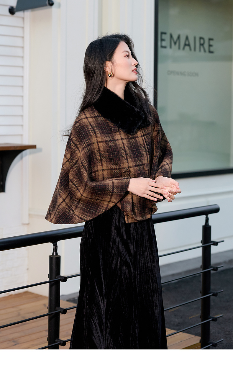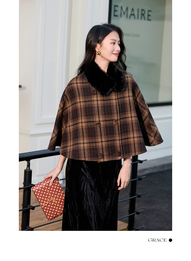 【绵羊毛】三彩2026新款英伦风棕格纹毛呢披肩毛绒围脖复古双排扣