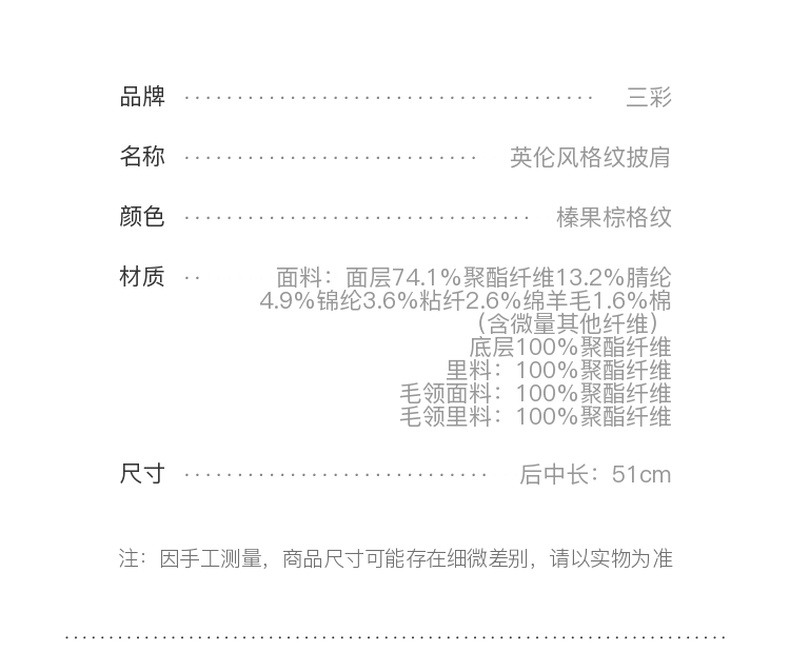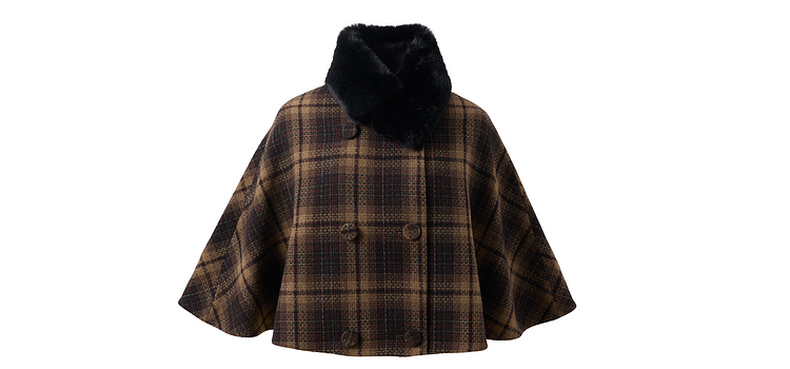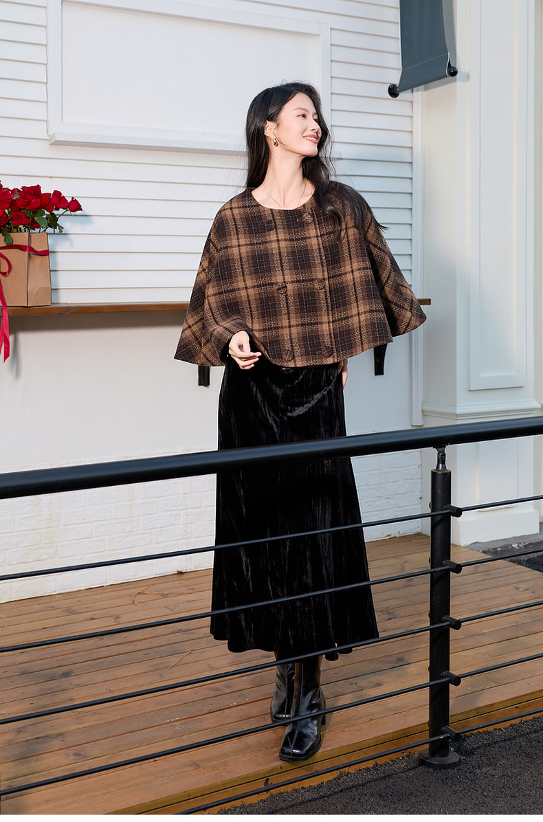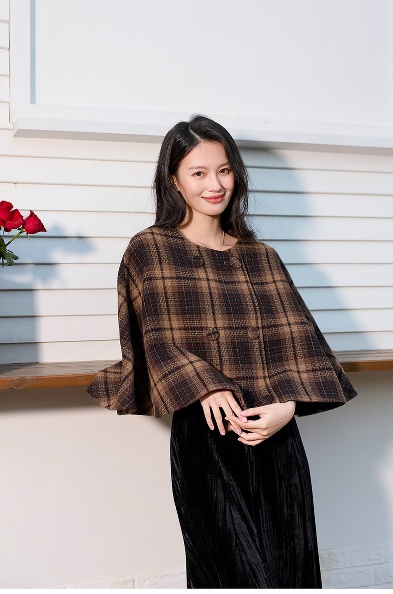 【绵羊毛】三彩2026新款英伦风棕格纹毛呢披肩毛绒围脖复古双排扣