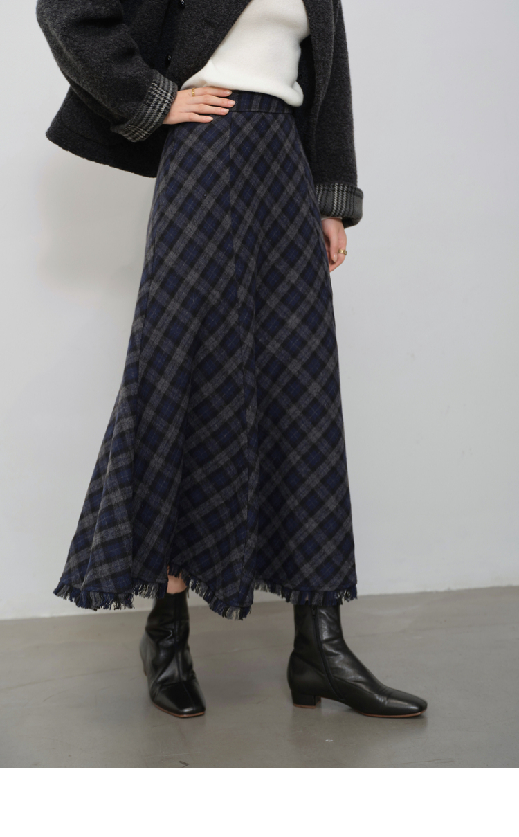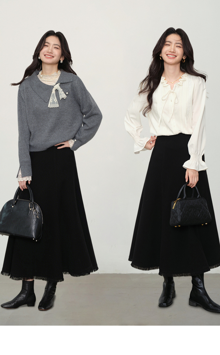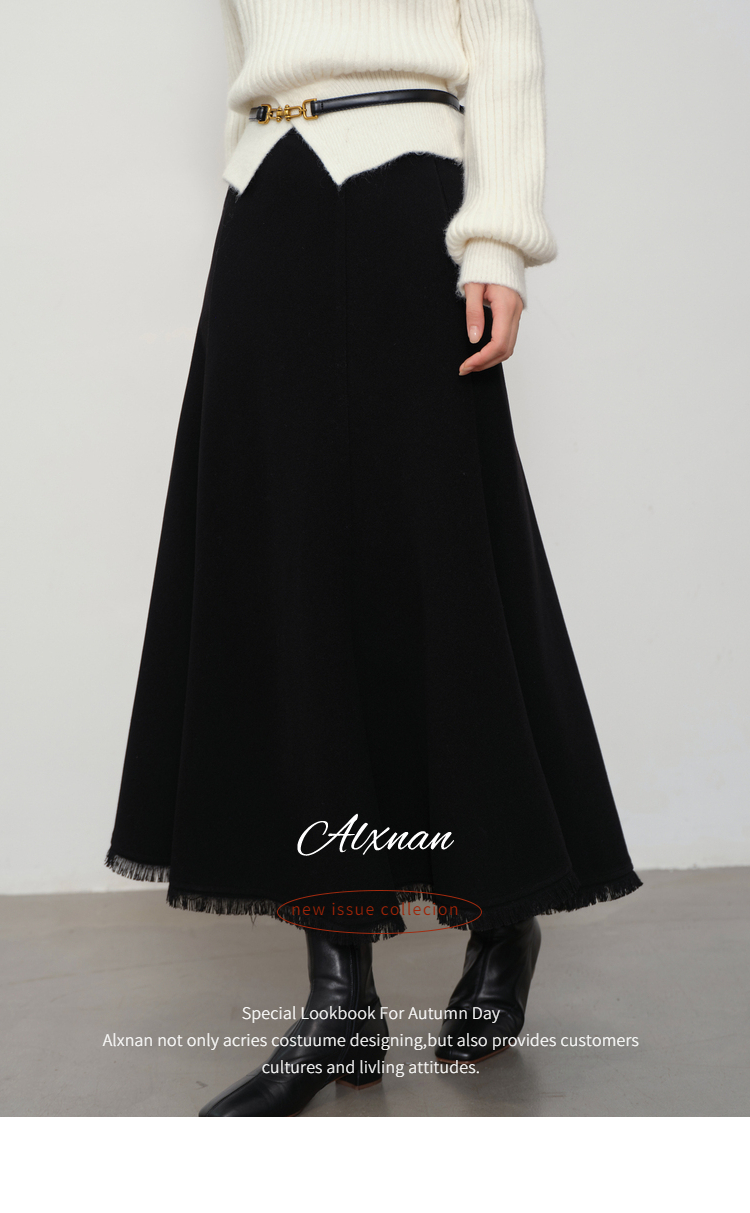 鹿向南「雅致书卷」黑色高腰A字流苏毛边半身裙女秋显瘦垂感长裙