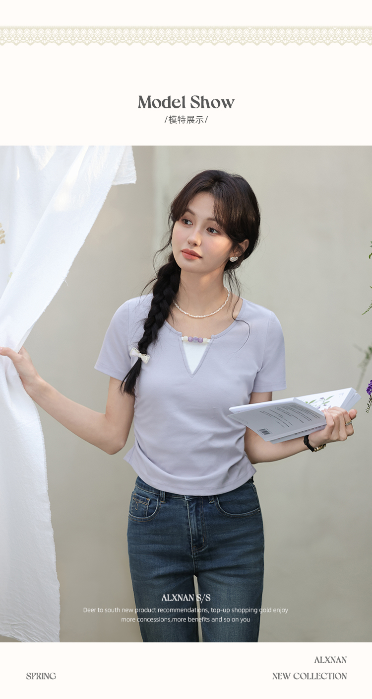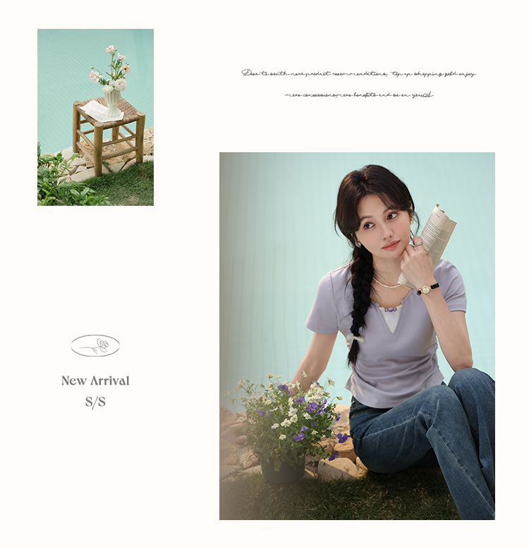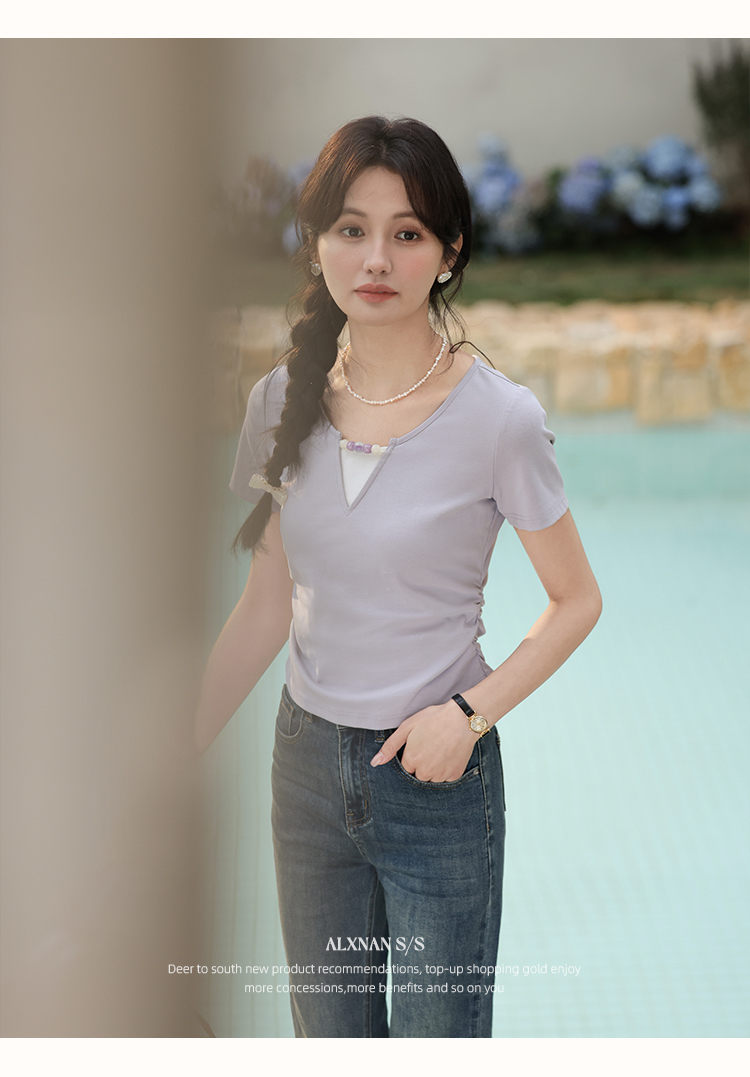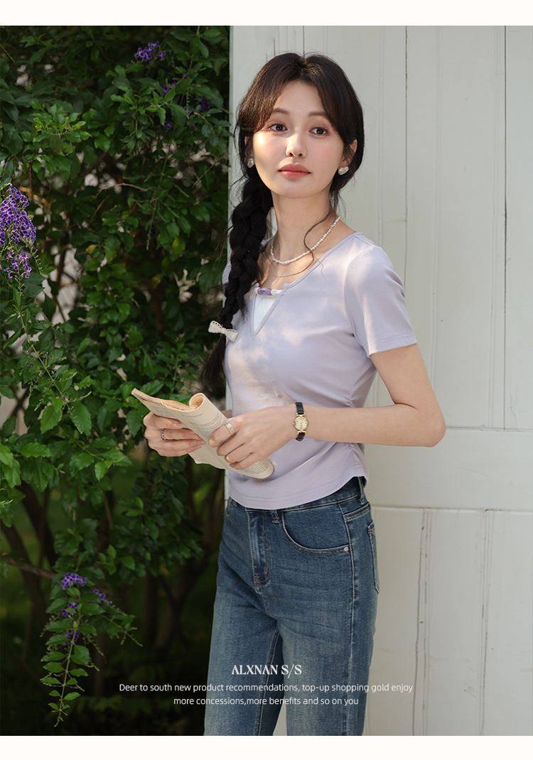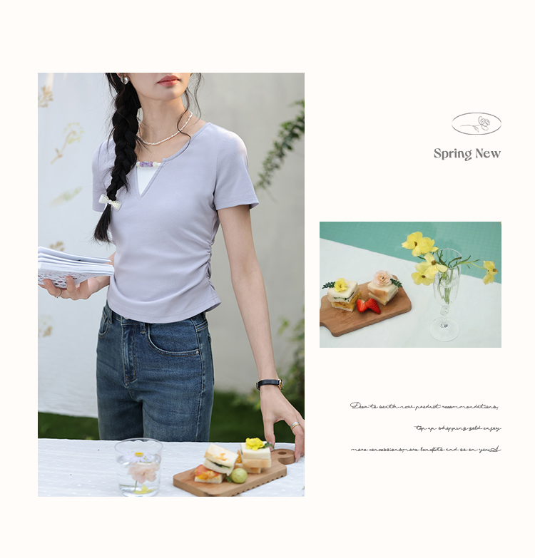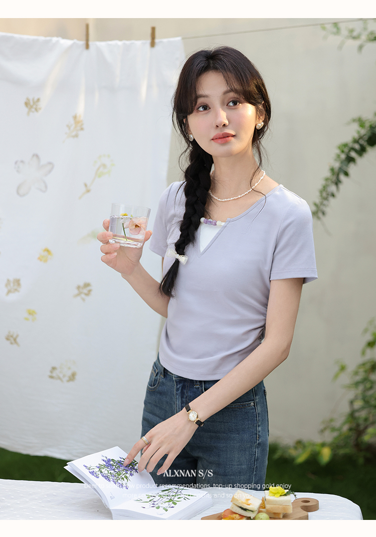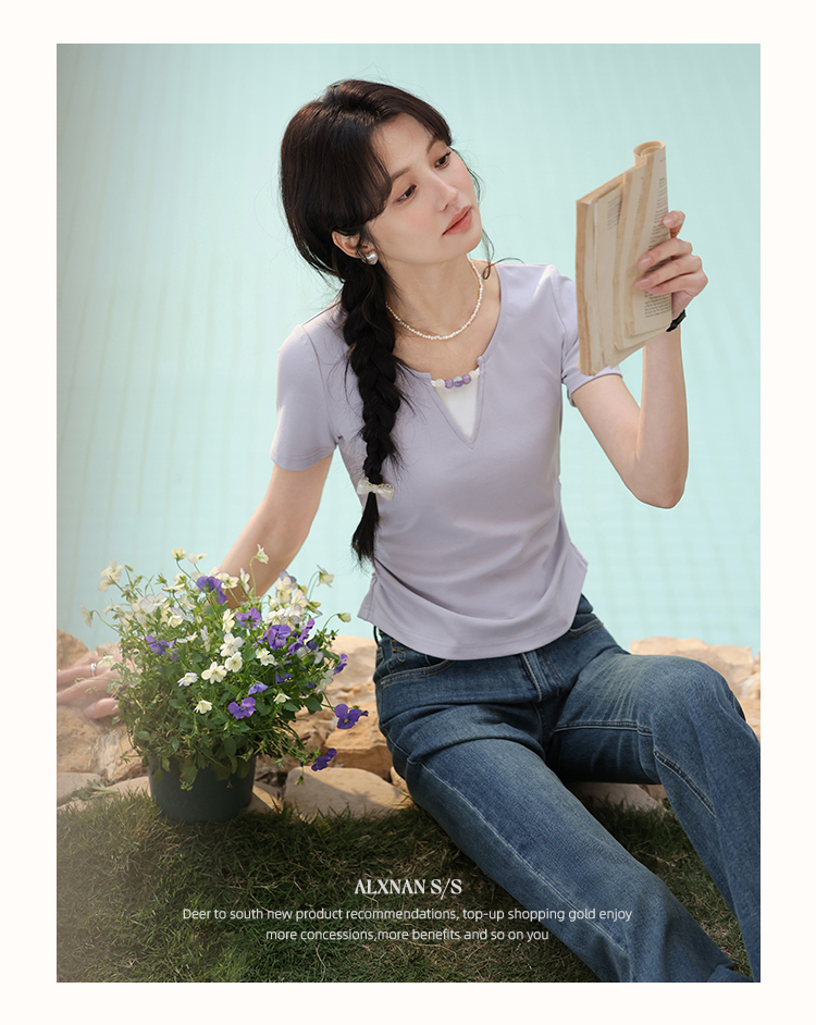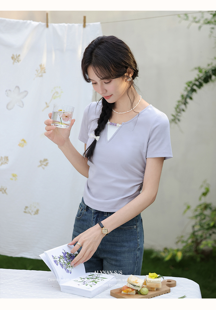 【65折秒杀】鹿向南「雾紫晚棠」紫色圆领T恤女夏季设计感短袖正肩显瘦上衣L537110