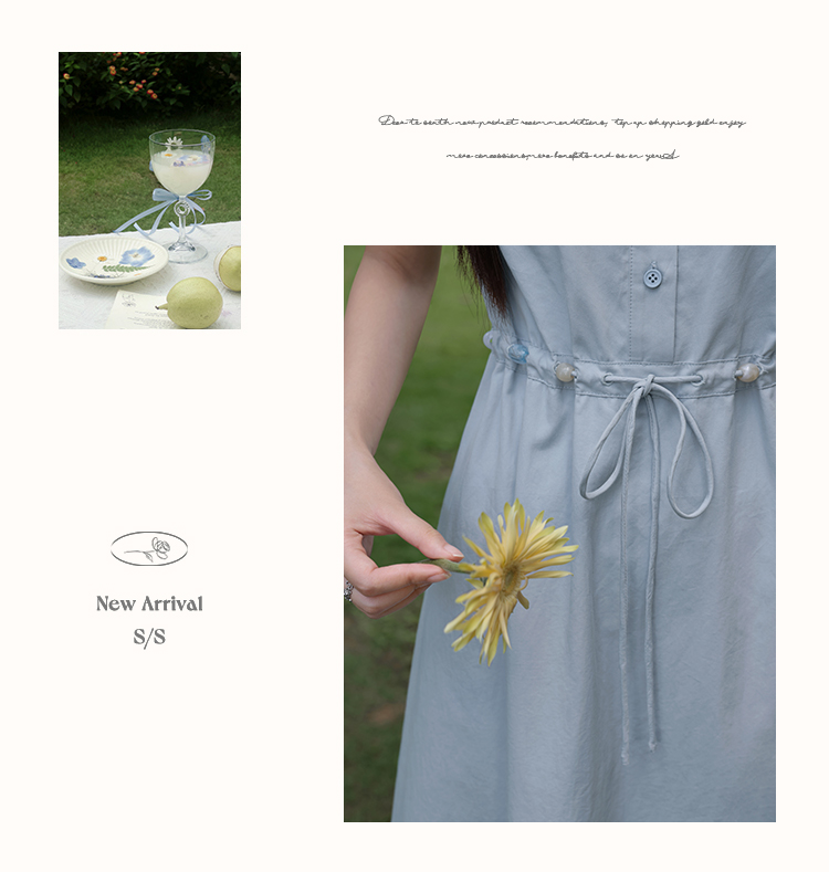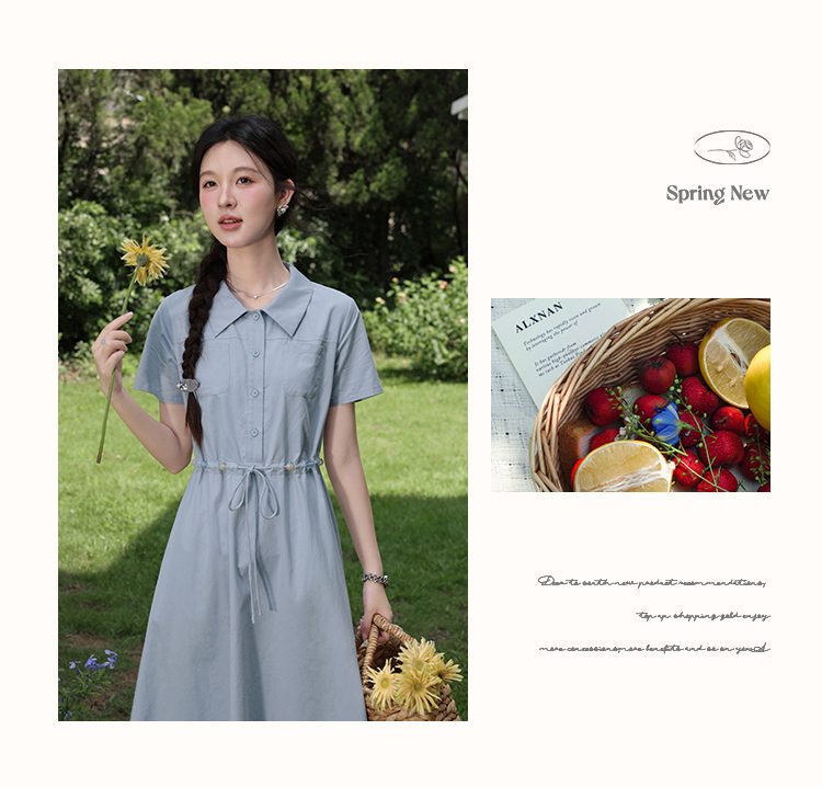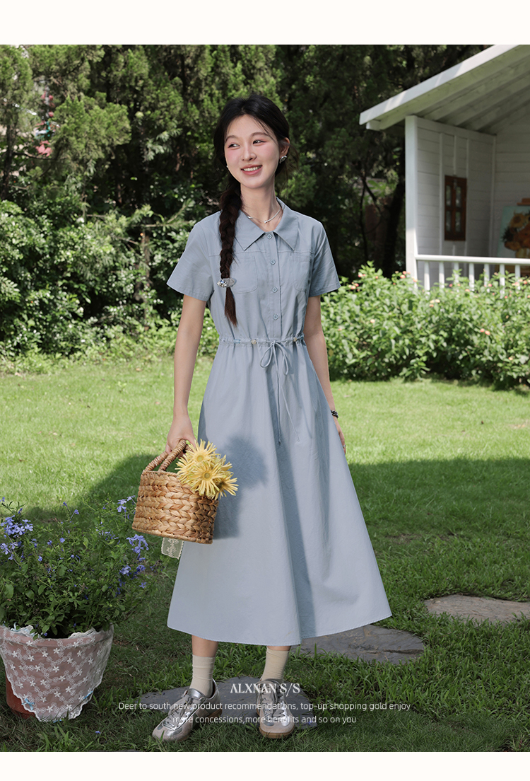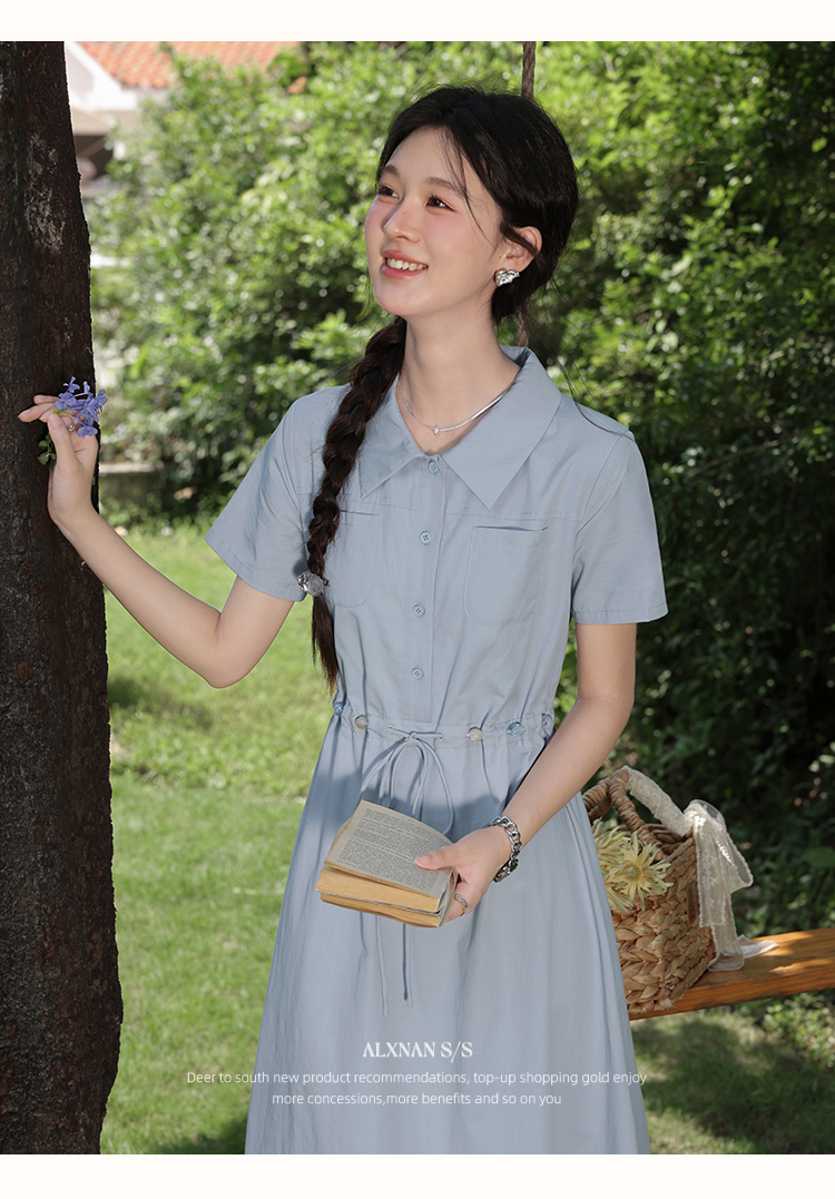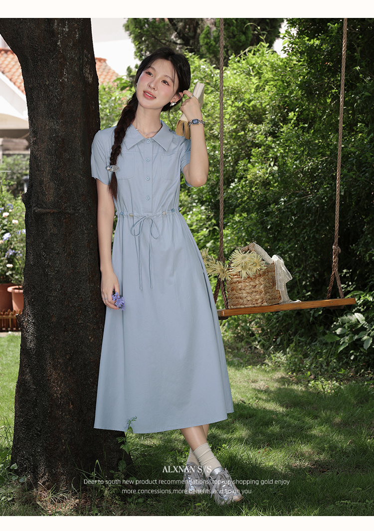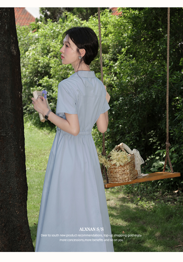【6折秒杀】鹿向南「风起时分」蓝色法式气质短袖连衣裙女夏通勤翻领衬衫长裙L56110-1