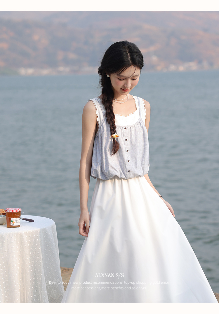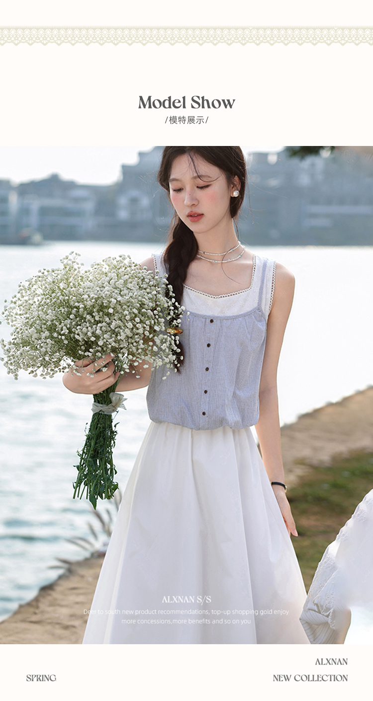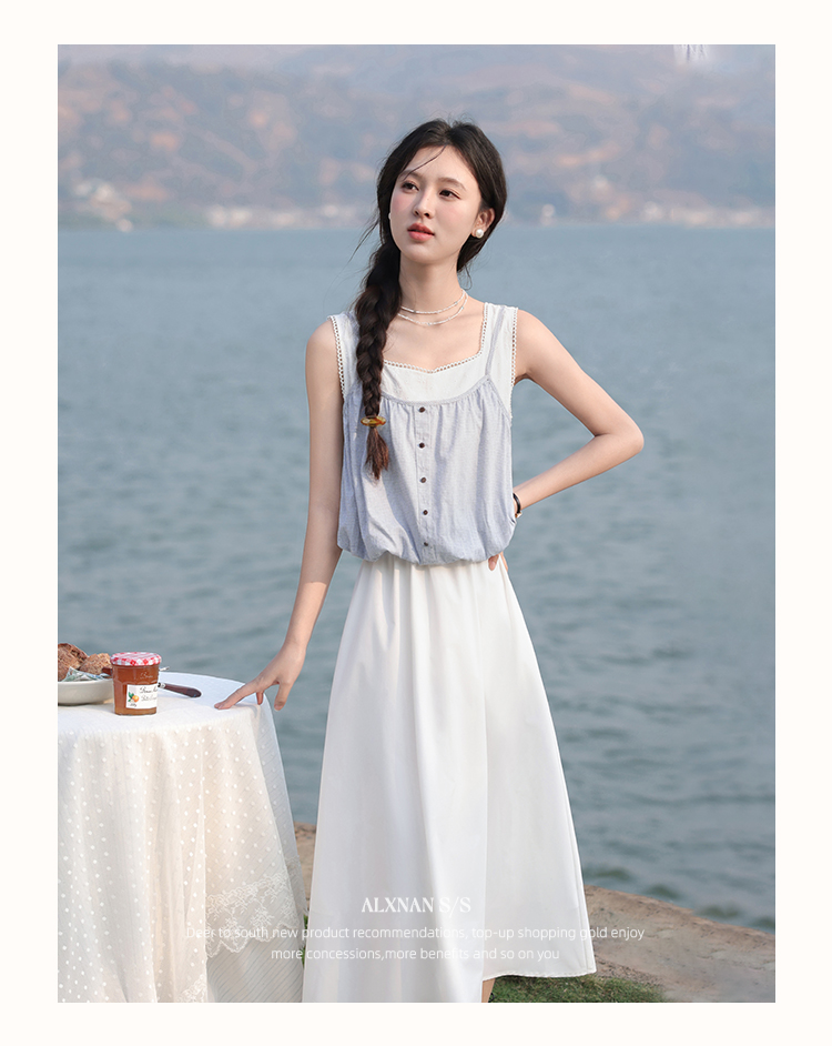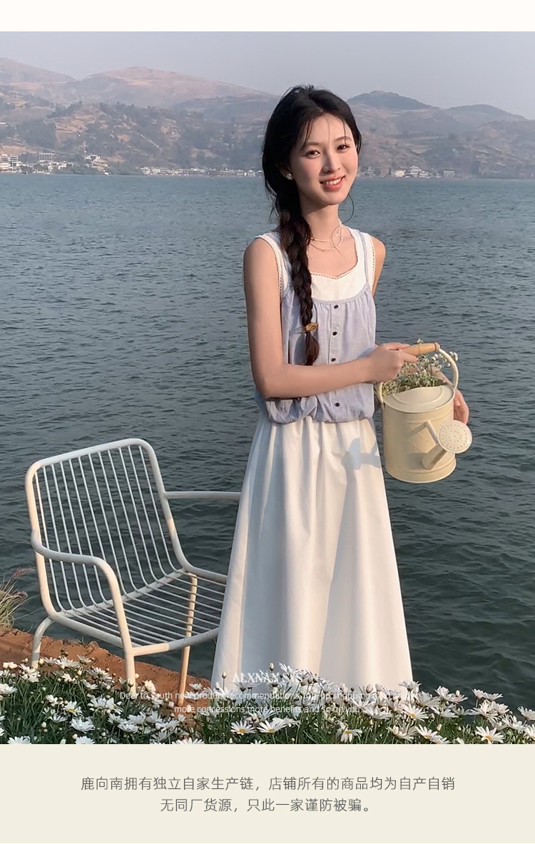 【6折秒杀】鹿向南「夏日乐悠悠」蓝白无袖假两件背心连衣裙夏新款时尚长裙女L55527