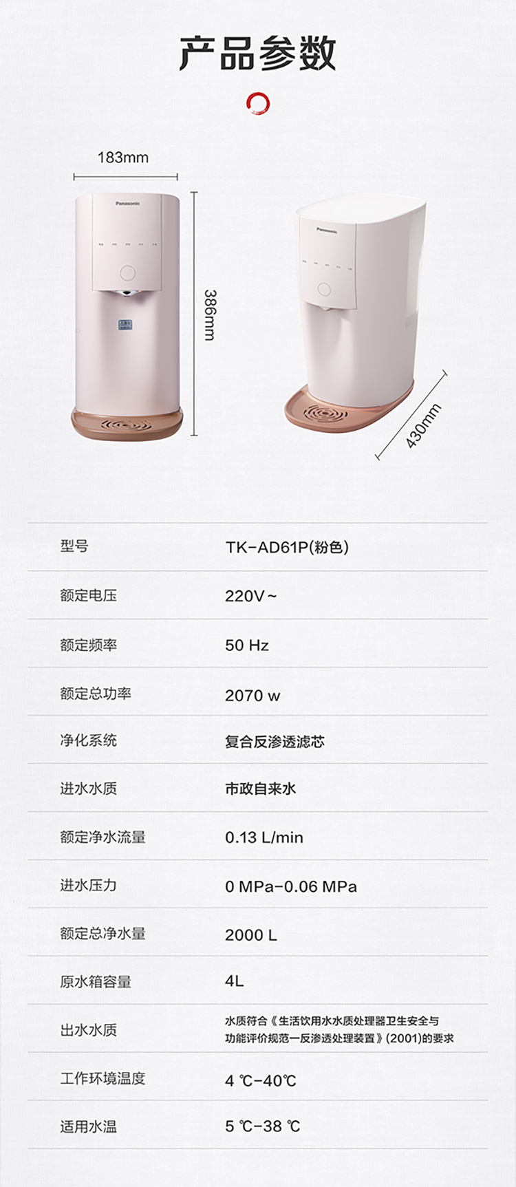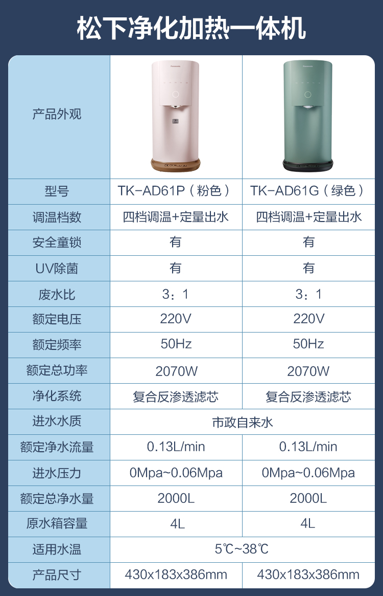 松下(Panasonic) 净水器 即热式RO反渗透净饮水一体机 家用直饮机 台上式免安装 多档定温 TK-AD61G(绿色)新升级UV工艺
