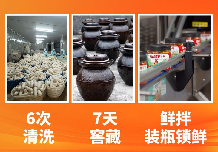 ✅同时品牌还拥有自研的发酵工艺 萝卜经过三洗三榨的工艺 手工土坛+农家自制香料发酵萝卜干7天 让萝卜干在自然发酵的过程中 脆感倍增,十分入味 而且这种传统的制作工艺 给味道添加了家的感觉 爱吃辣和不爱吃辣的🥰 都会爱上这款萝卜干