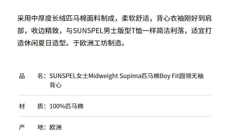 - Sunspel 成立于 1860 年,是具有现代气息的创新英国品牌,专注为客户提供耐穿不过时的基础款,同时满足摩登品味。服饰采用优质的、可追本溯源的原材料 —— 棉、亚麻和羊毛制作。