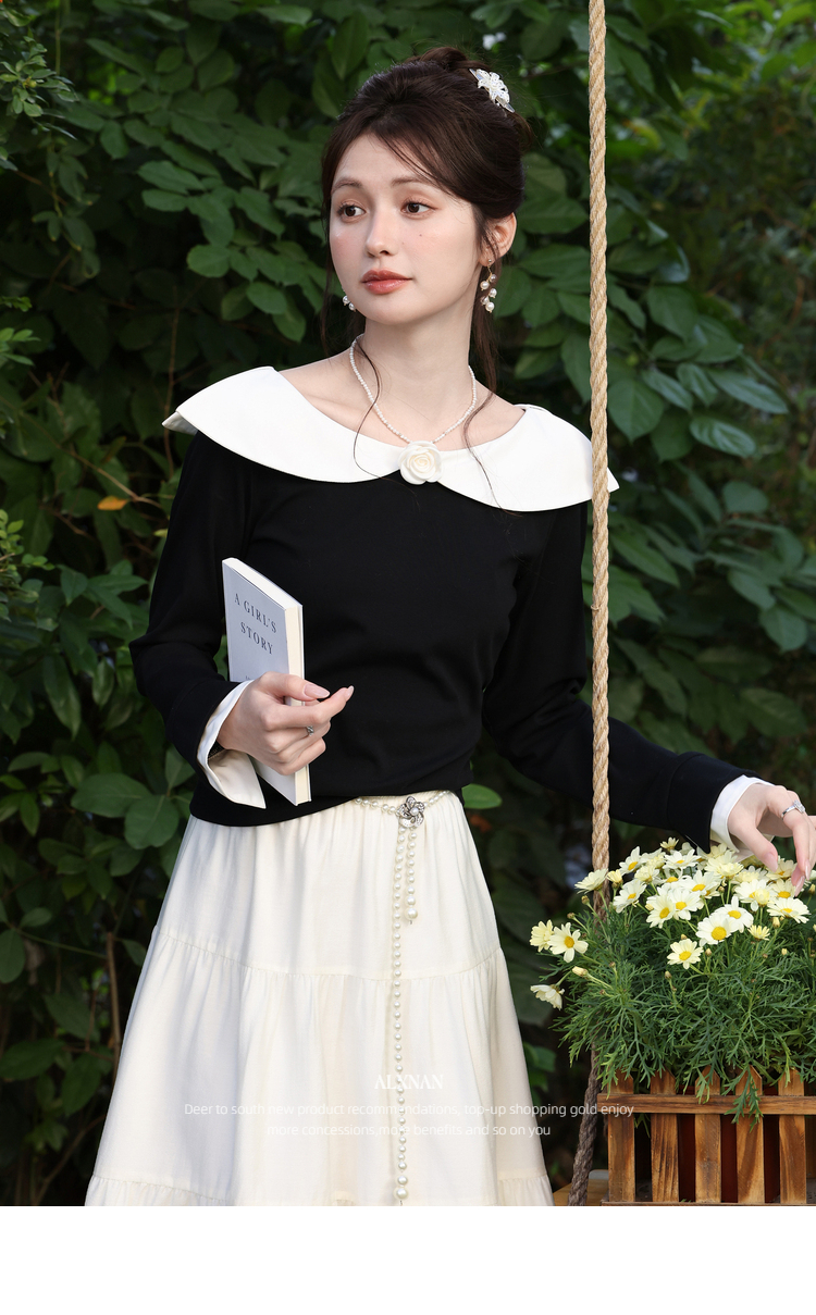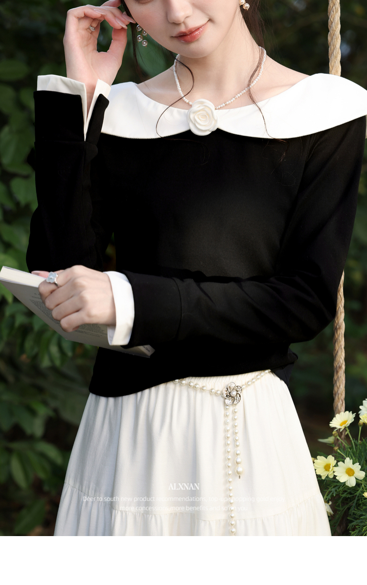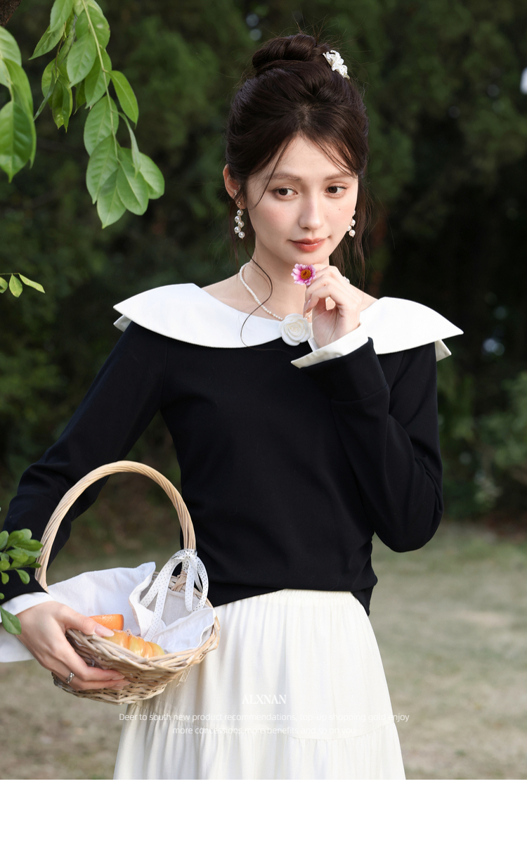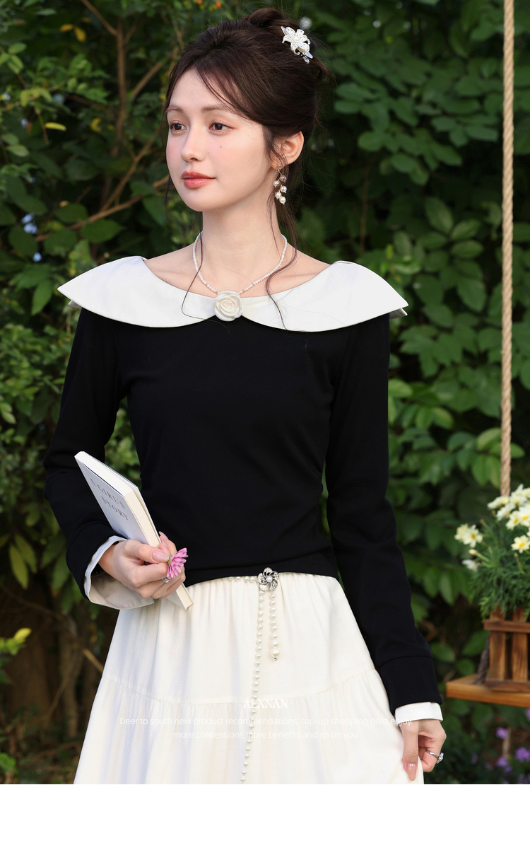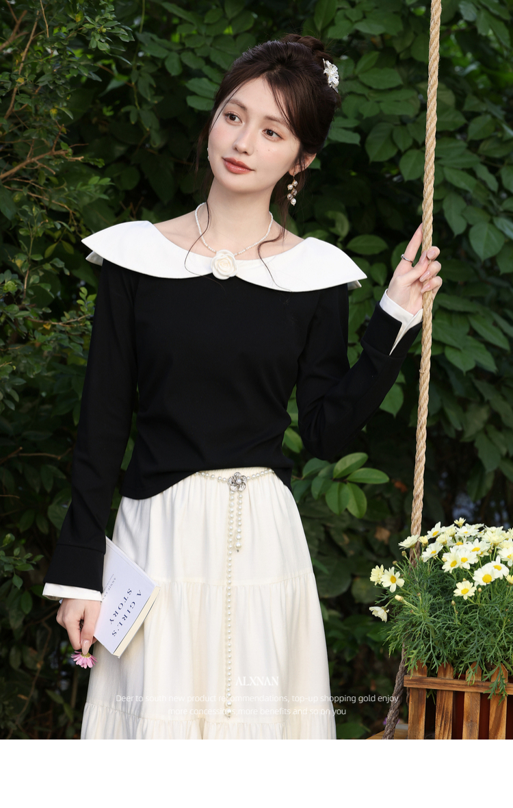 鹿向南「山茶墨韵」黑色假两件t恤女春季小众设计感法式长袖上衣