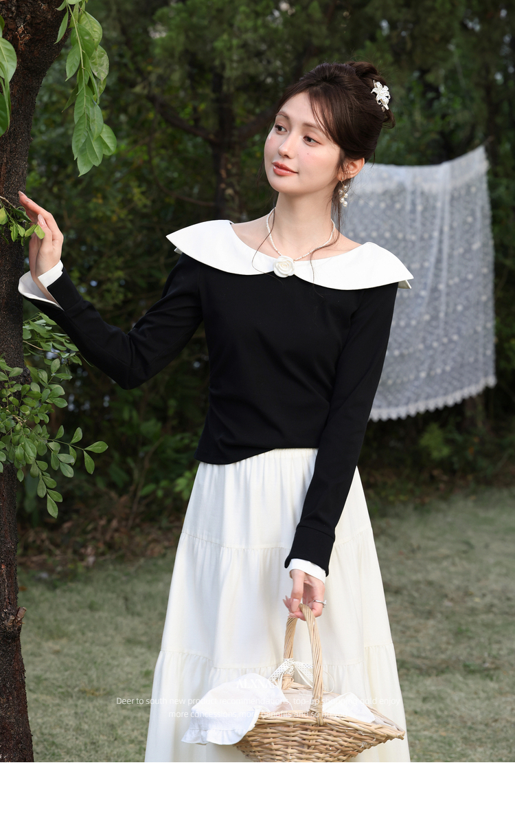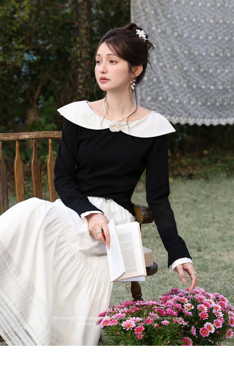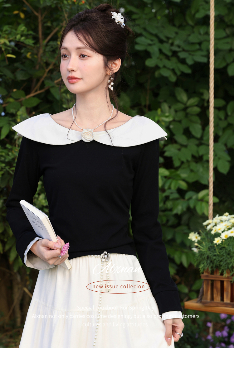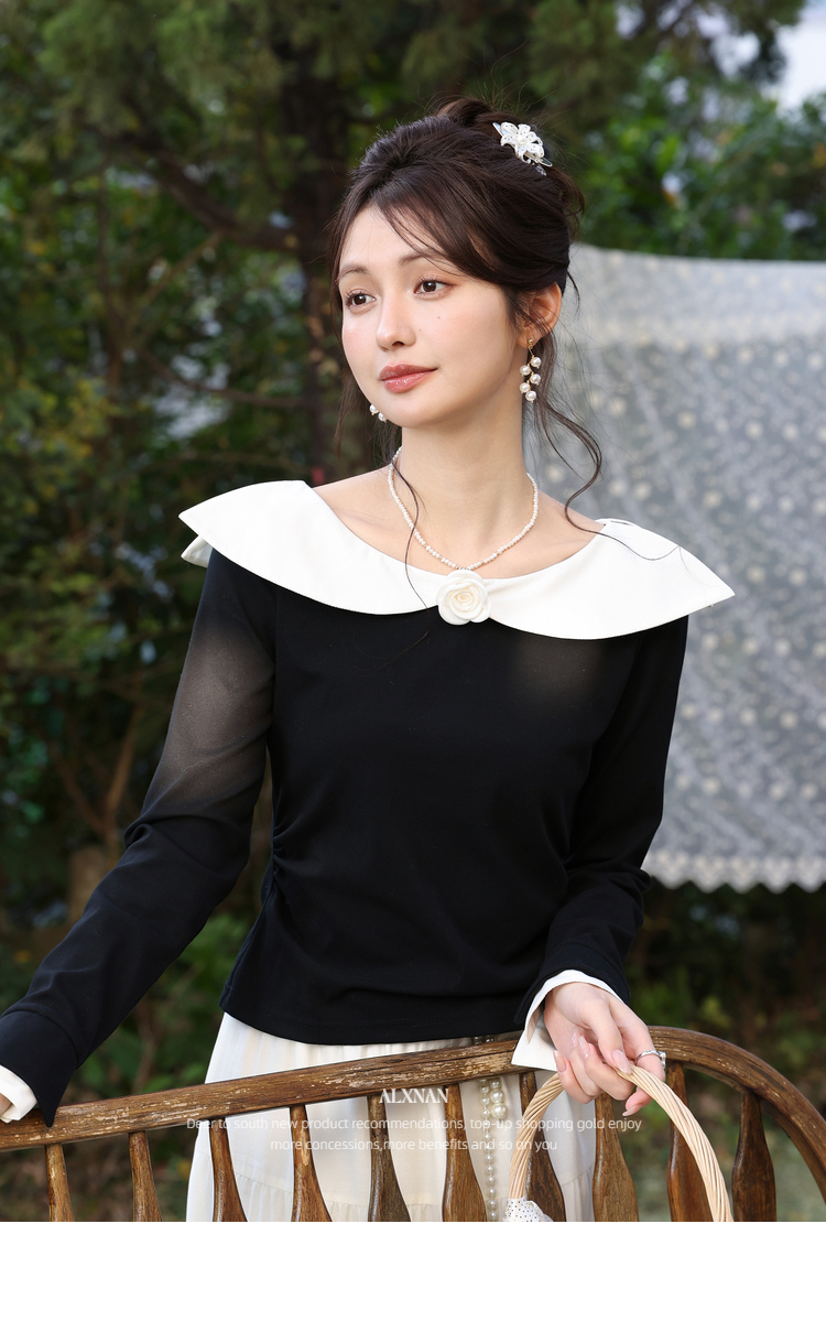 鹿向南「山茶墨韵」黑色假两件t恤女春季小众设计感法式长袖上衣